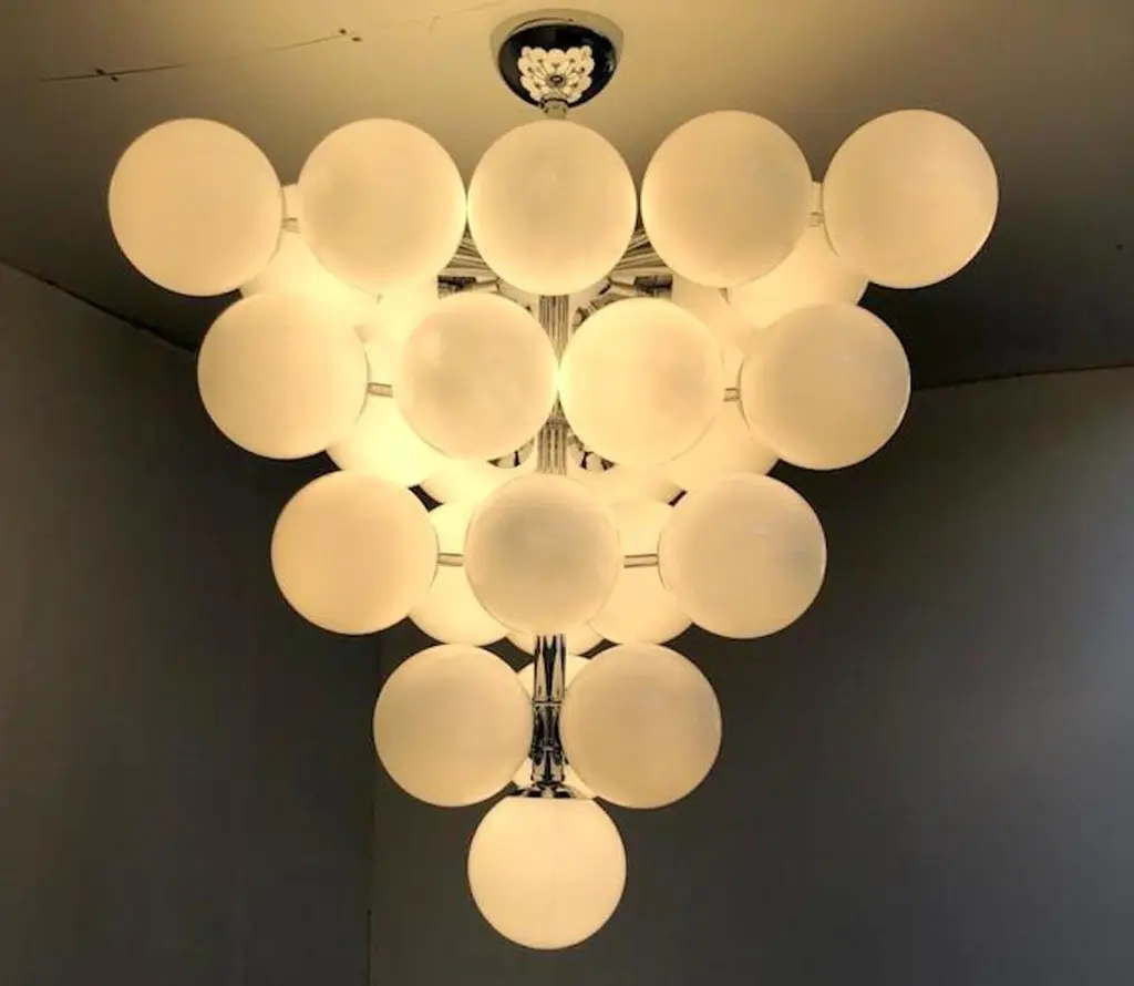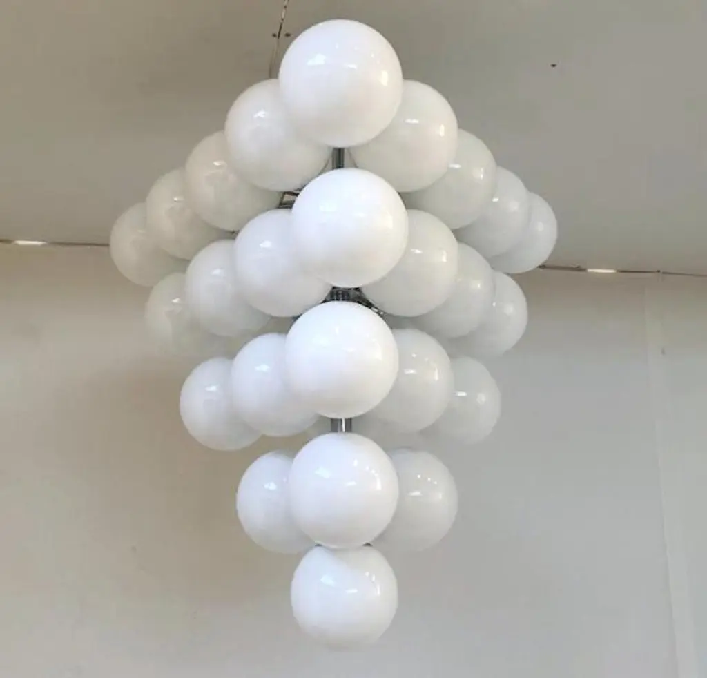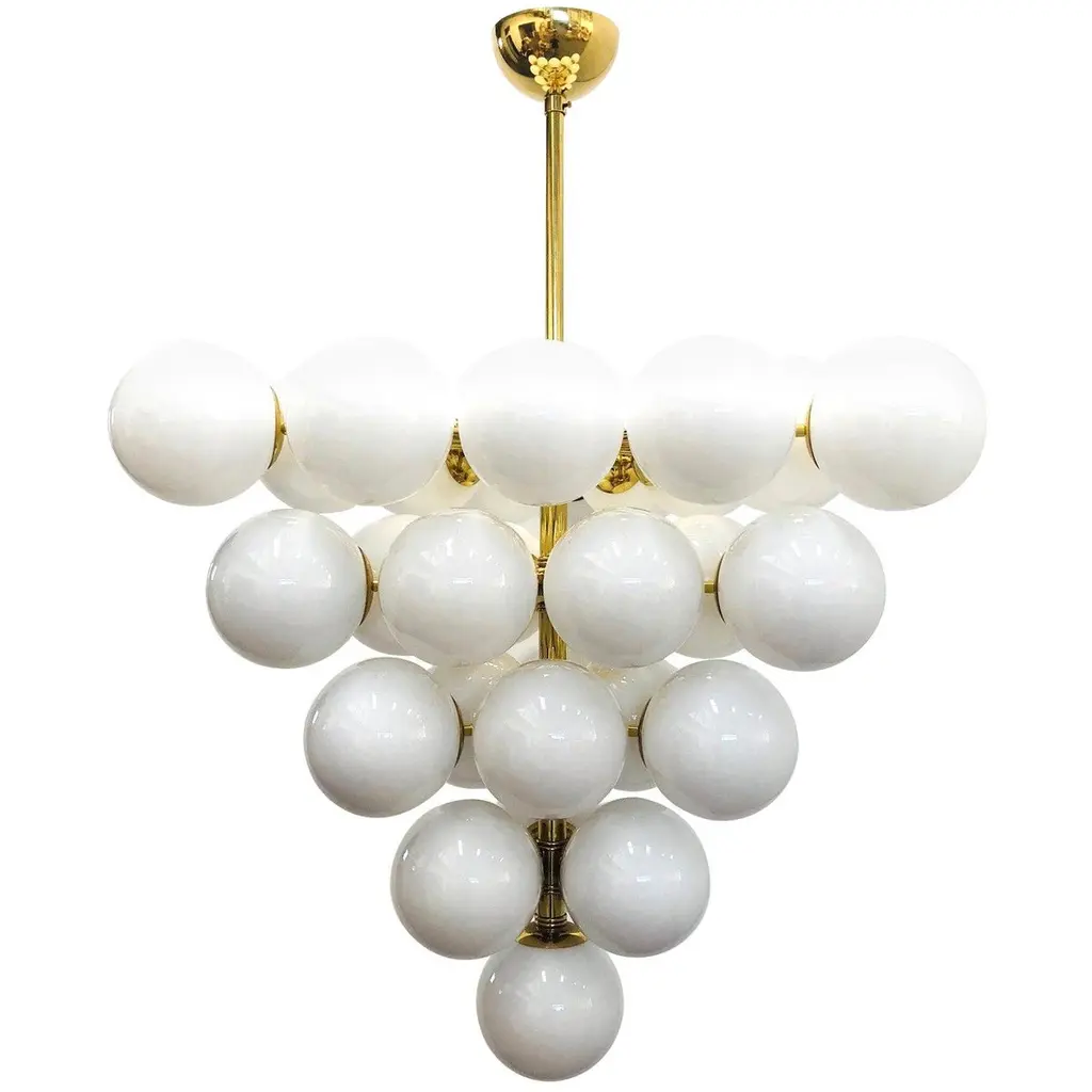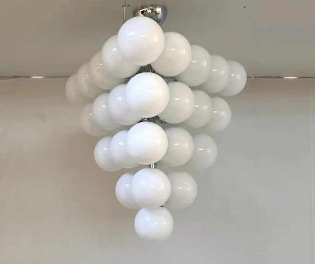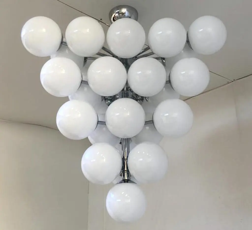 Italian chandelier with glossy white Murano glass globes mounted on polished chrome metal finish frame / designed by Fabio Bergomi for Fabio Ltd, made in Italy31-light / E12 or E14 type / max 40W eachMeasures: Diameter 31.5 inches, height 34 inches including rod and canopyOrder only / this item ships from Italy.