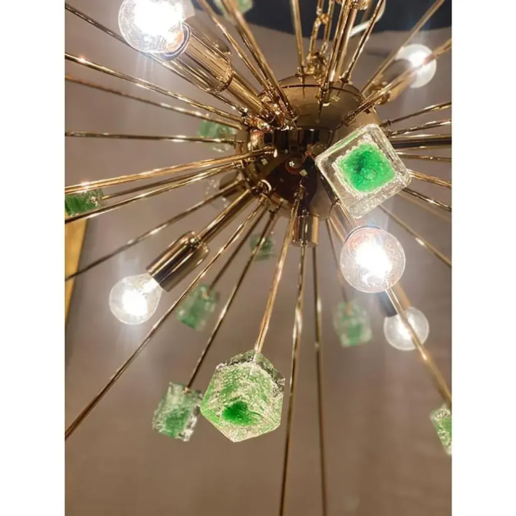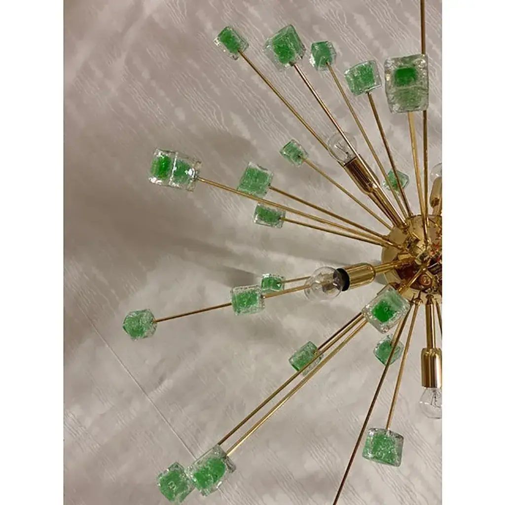 Contemporary “cubes” murano glass sputnik chandelier. vintage rare little green in pulegoso-working cubes elements of murano glass . a piece of italian art. dimensions (cm/in): d 100 cm /d 39.4″ finiture: gold 24k bath metal frame 9 bulbs, compatible with led sustenibility all made in italy, ship from italy. us plug (up to 110v).