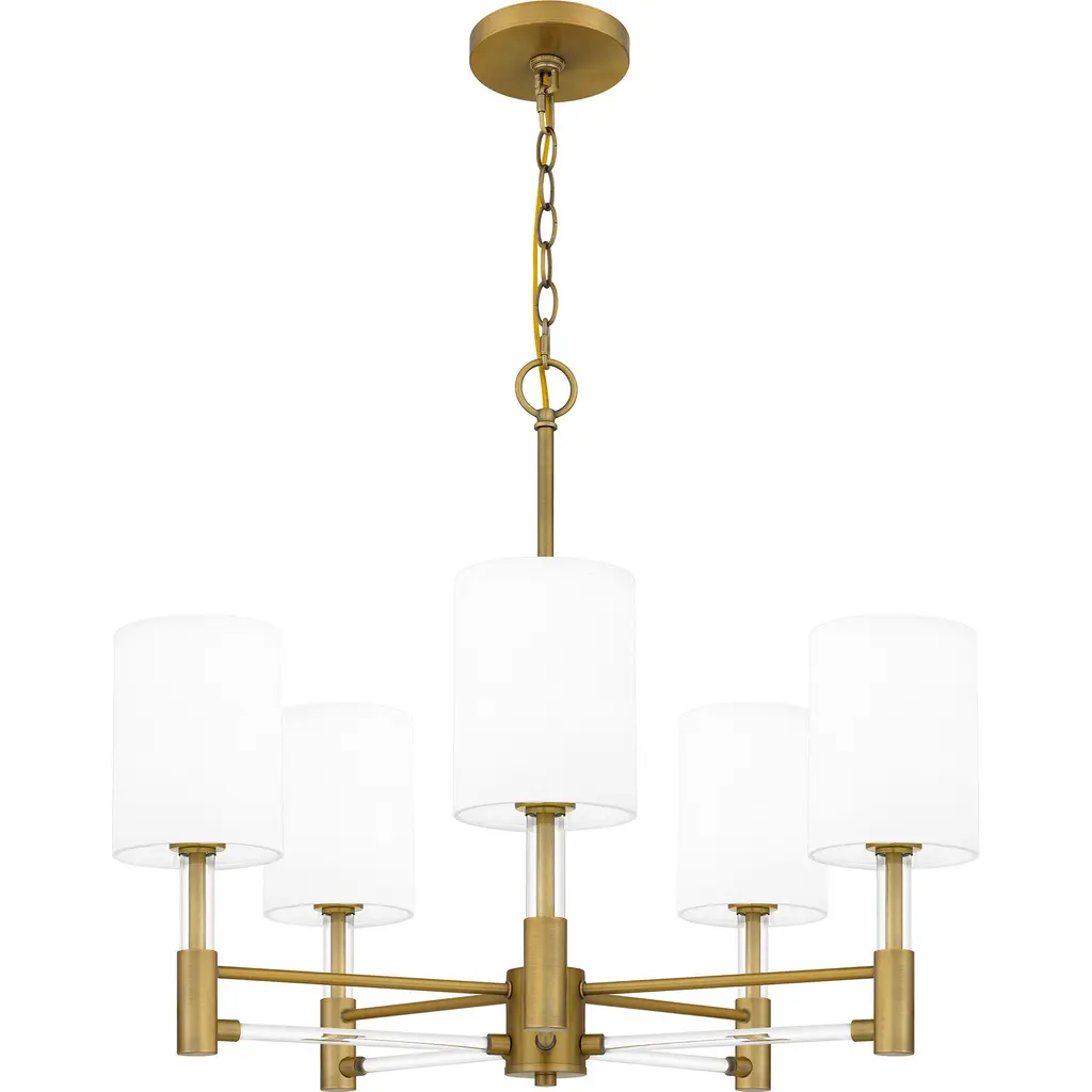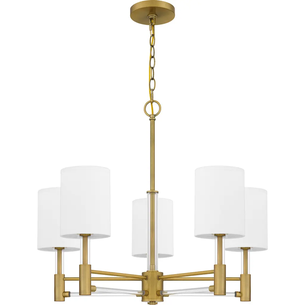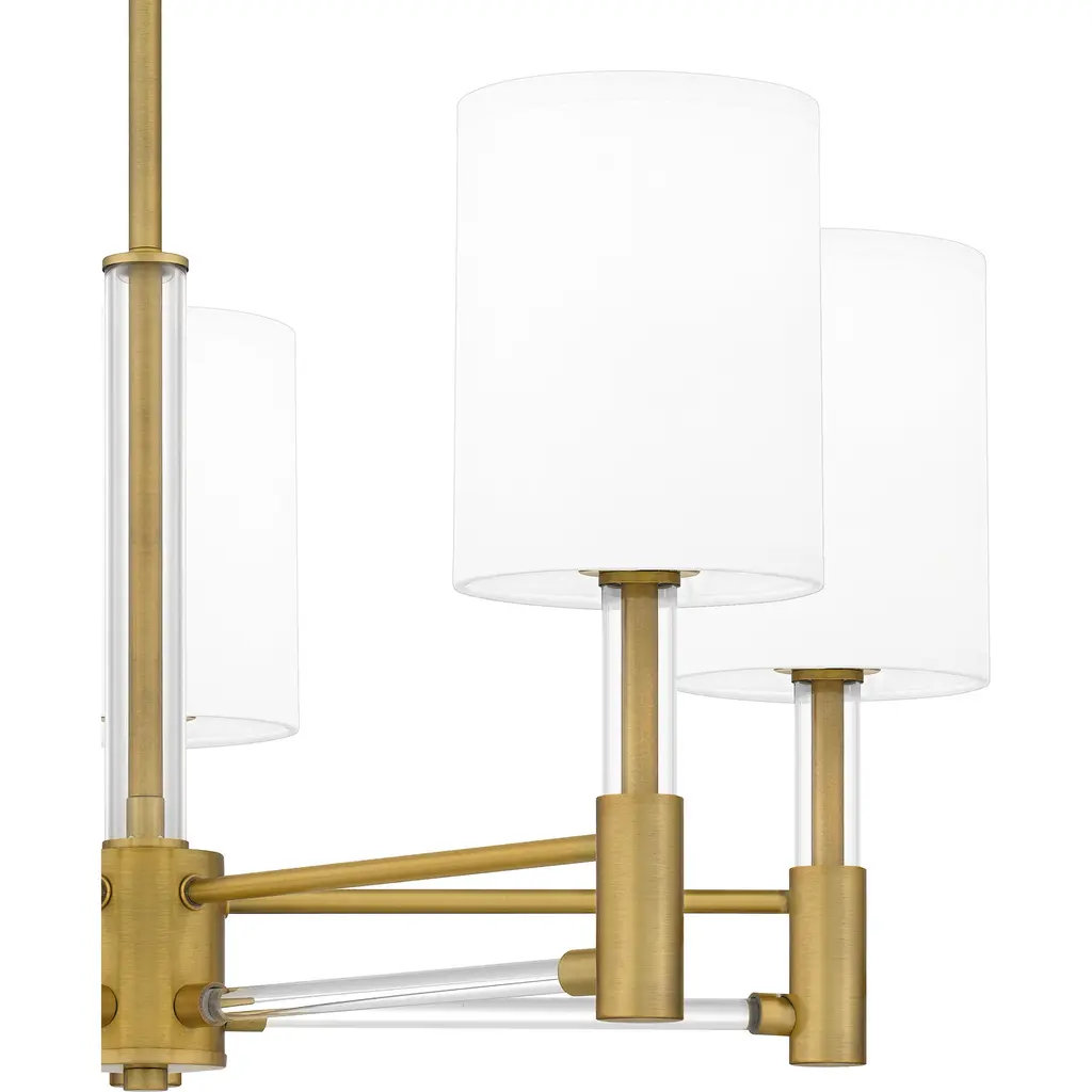 Off-white fabric shades add a touch of sophistication to Gretchen's classic silhouette. Clear linear accents add glamour and shine to the aged brass finish. The delicate contrast creates a sense of drama in the otherwise modest chandelier design, making Gretchen a perfect statement piece over any kitchen table.