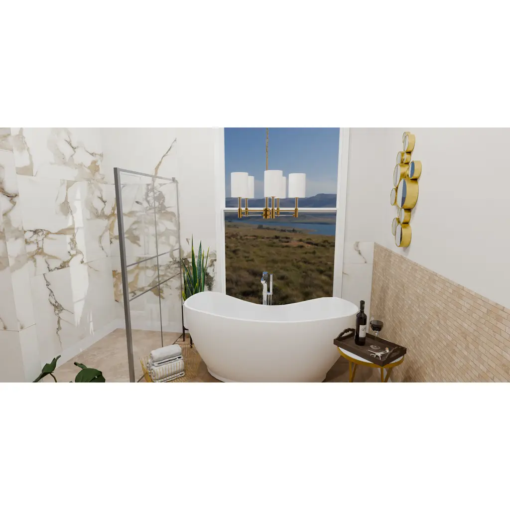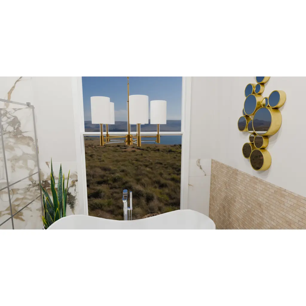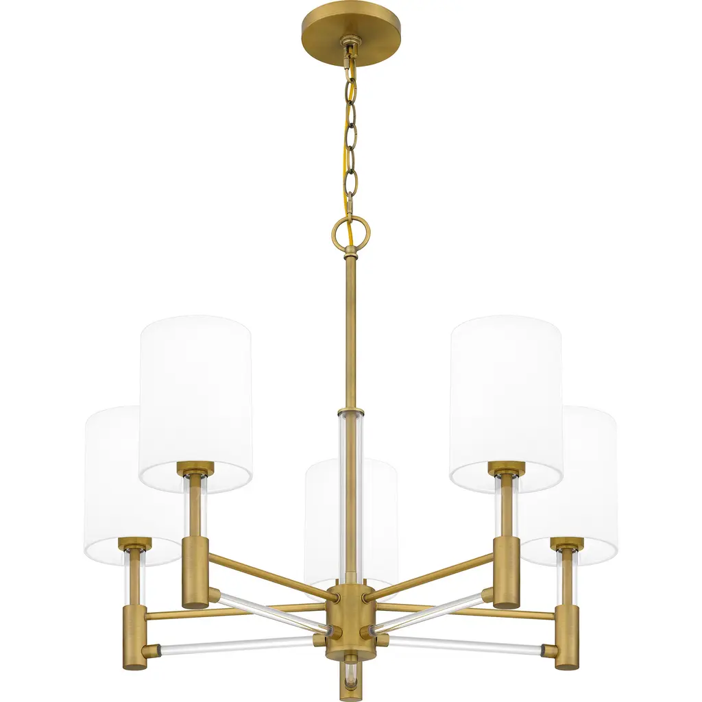 Off-white fabric shades add a touch of sophistication to Gretchen's classic silhouette. Clear linear accents add glamour and shine to the aged brass finish. The delicate contrast creates a sense of drama in the otherwise modest chandelier design, making Gretchen a perfect statement piece over any kitchen table.