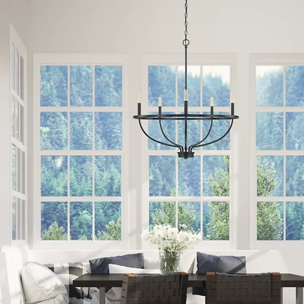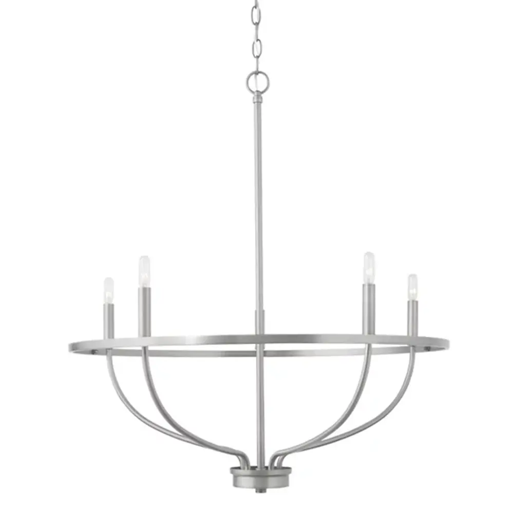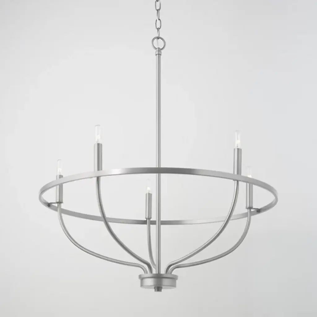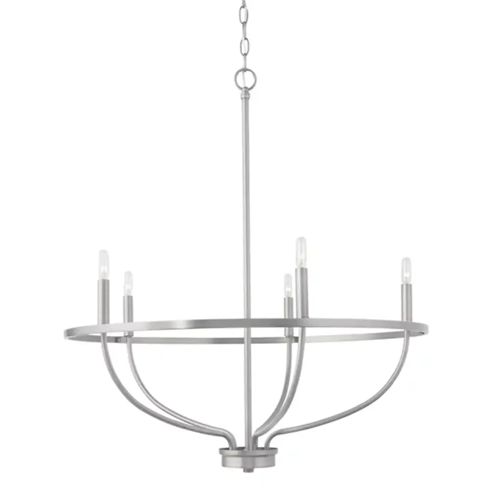 Gracefulness exemplified. Touch up your room with the light, airy personality of the Greyson Chandelier from Capital Lighting. It’s a refined take on the familiar chandelier silhouette. It guides the eye around with charming vine-like arms. The arms create dramatic curves that find a place on the sophisticated ring frame. The clean, open quality of the design lets it complement a range of décor. Candelabra bulbs perched atop the piece deliver a shimmering, textured burst. Together, the bulbs create an elevated ambient glow.