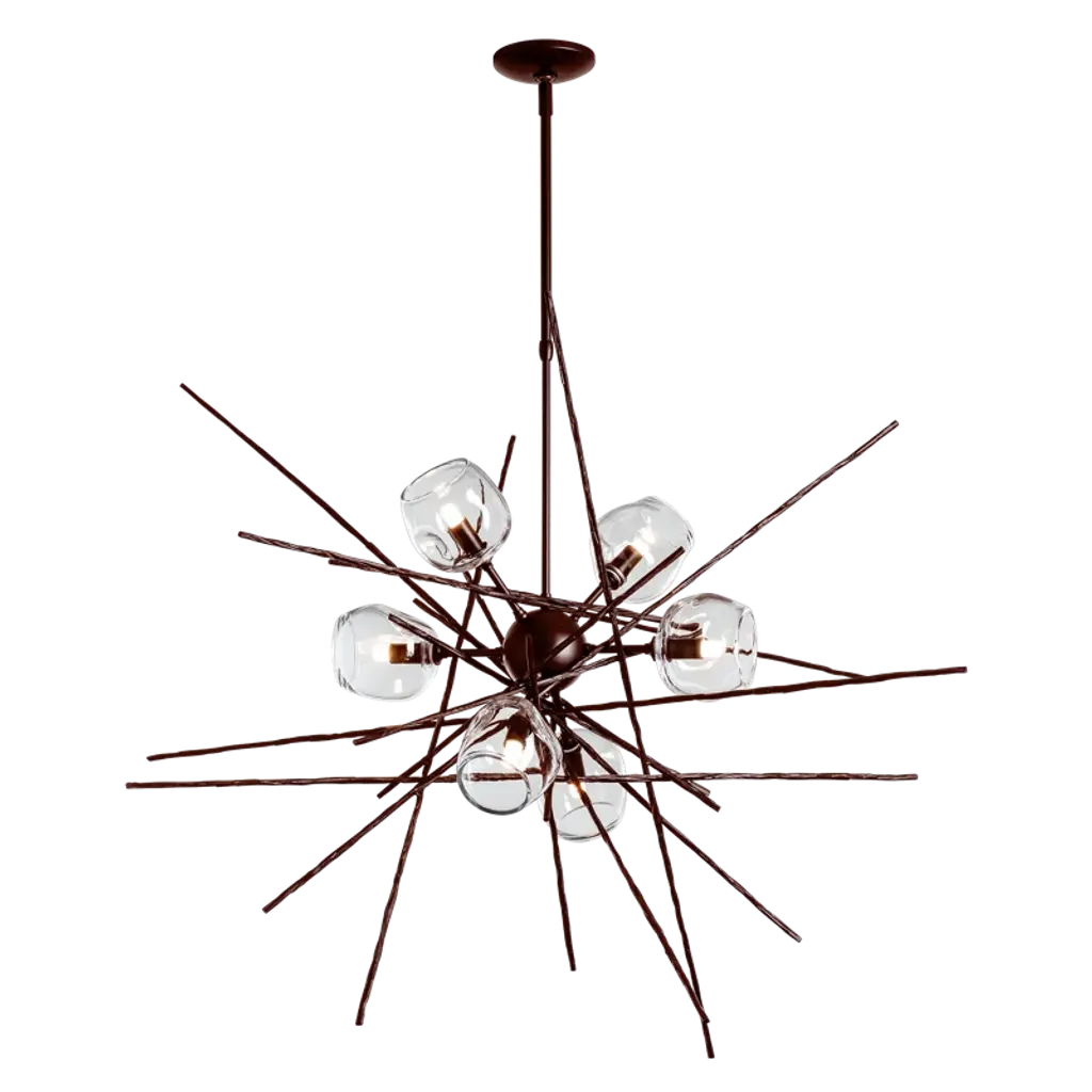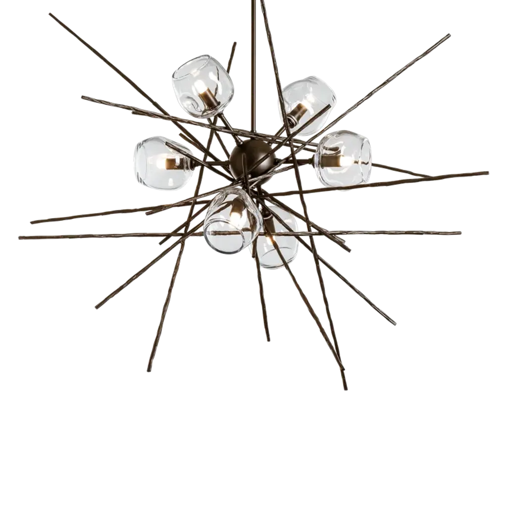 The Griffin starburst chandelier features six unique, glass shades. The starburst design is achieved with handcrafted, hammered steel rods created by Vermont artisans to look like the natural tree bark of intersecting twigs. The organic-shaped glass. All Hubbardton Forge products are hand-crafted to last one at a time in Vermont.