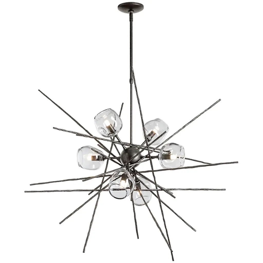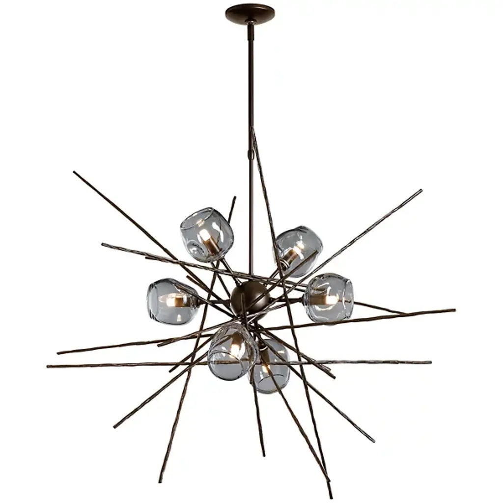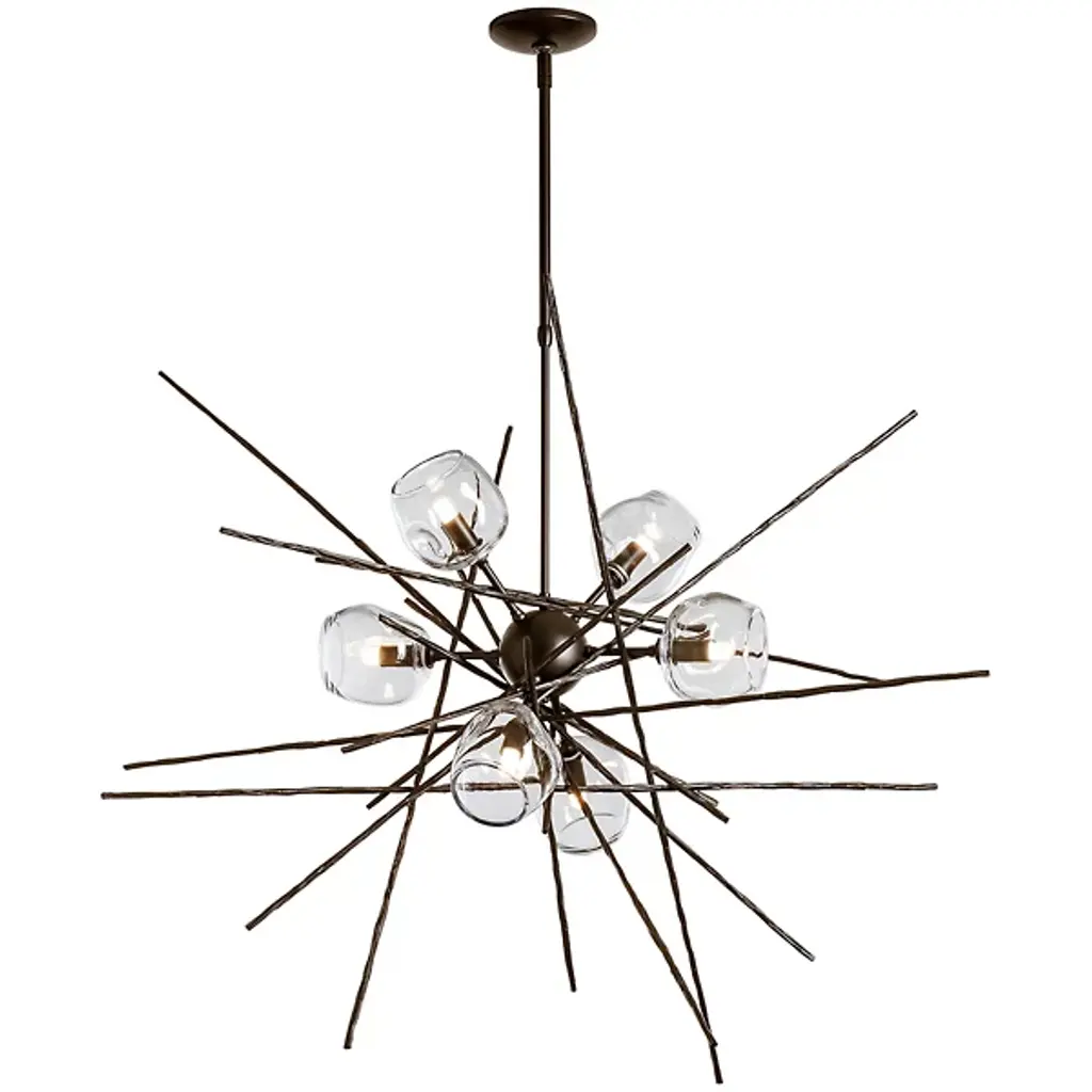 Expand your indoor living spaces with the glamorous open lines of the Griffin Starburst Chandelier from Hubbardton Forge. Secured by a smooth circular canopy and adjustable stem, its sleek structure expands on retro “Sputnik” design elements, sending out a variety of slender rods in all directions from a central, spherical hub. These rods accent the fixture’s candelabra-style lamping, which angles out evenly in all directions, with clear glass goblet shades sweeping around to gentle, direct glare from the sides into a welcome warmth.