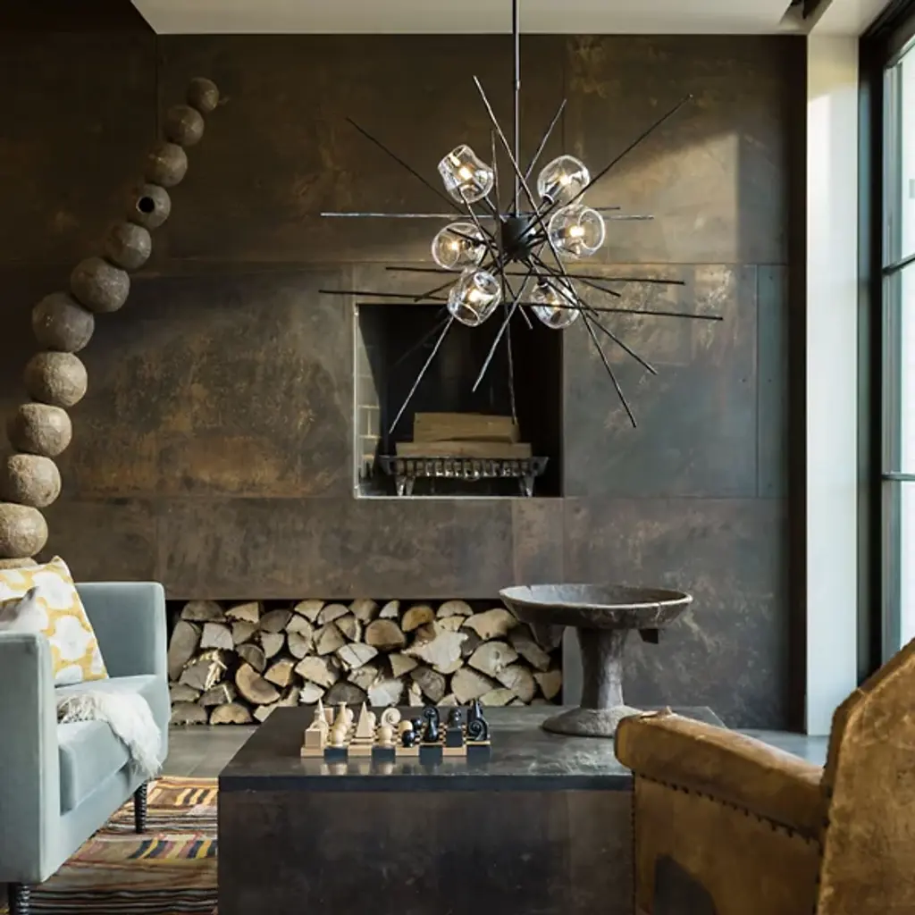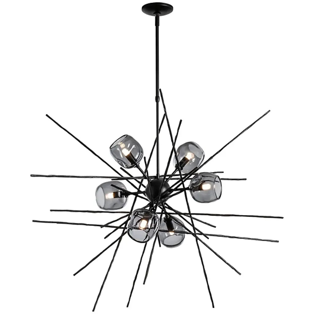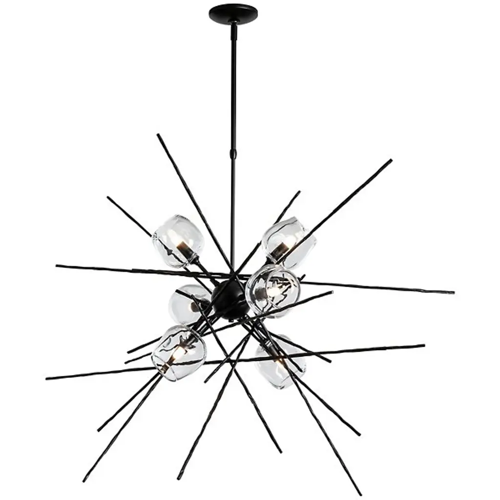 Expand your indoor living spaces with the glamorous open lines of the Griffin Starburst Chandelier from Hubbardton Forge. Secured by a smooth circular canopy and adjustable stem, its sleek structure expands on retro “Sputnik” design elements, sending out a variety of slender rods in all directions from a central, spherical hub. These rods accent the fixture’s candelabra-style lamping, which angles out evenly in all directions, with clear glass goblet shades sweeping around to gentle, direct glare from the sides into a welcome warmth.