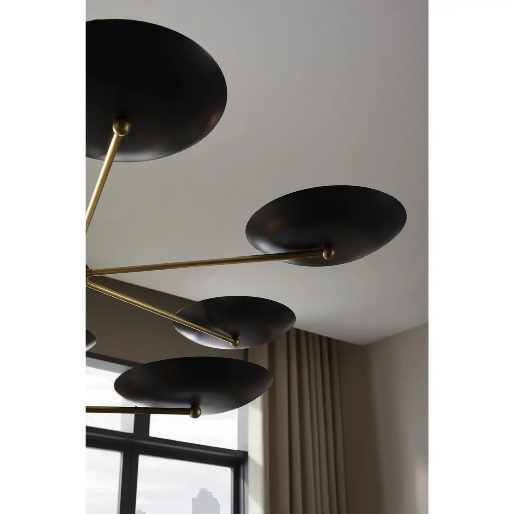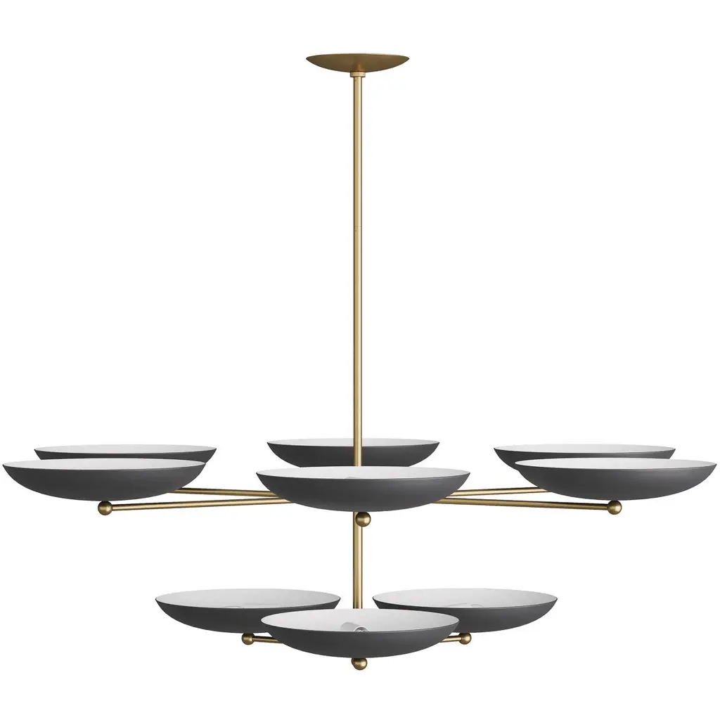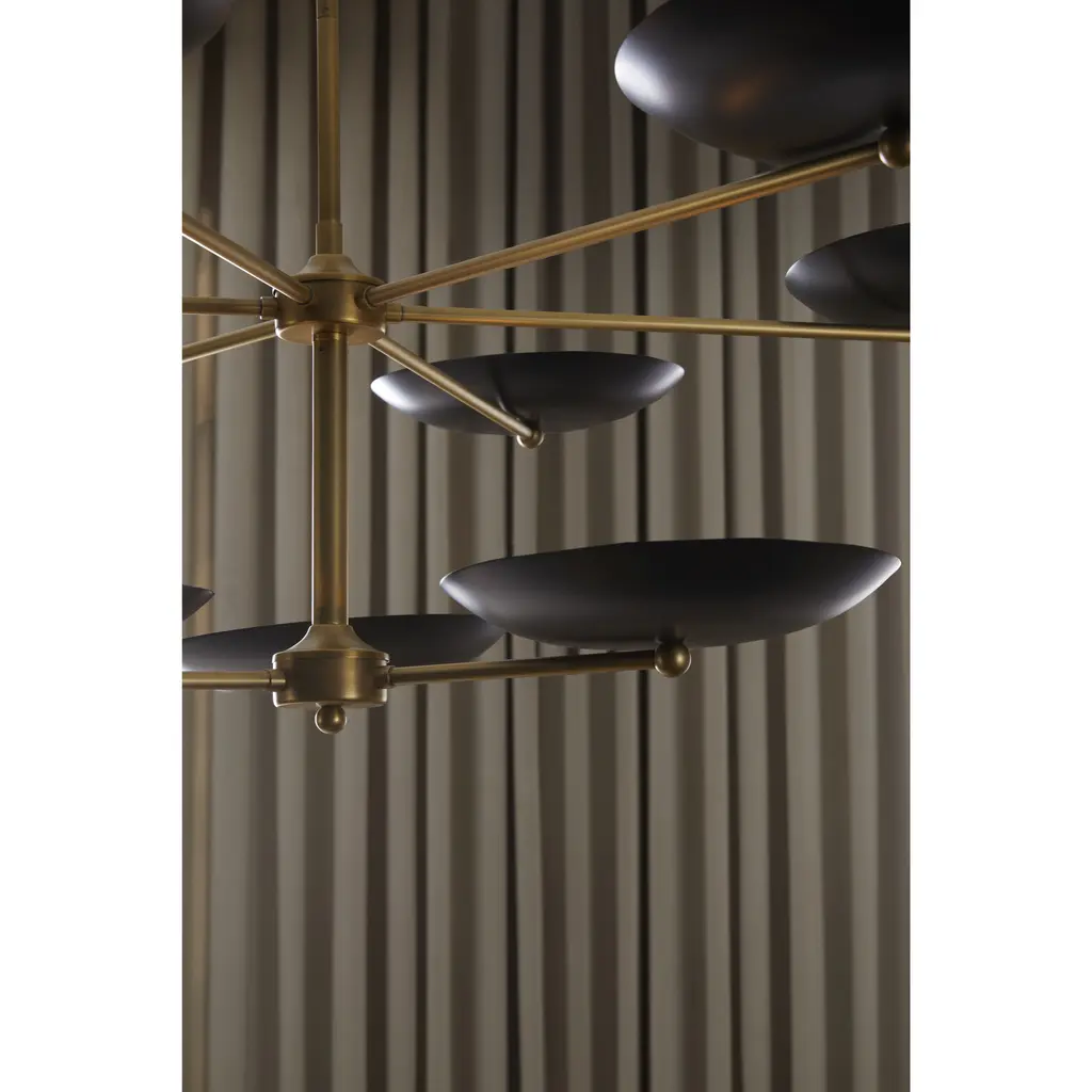 The new two-tiered Griffith chandelier provides a bold presence in any room. Inspired by the grand public spaces of the mid-century era, this architectural chandelier is designed with bronze shades accented by a contrasting antique brass finished steel fame. This fixture’s upward facing plates reflect light, creating a warm, even glow. Damp-rated, although limited covered outdoor conditions may affect finish. Finish will vary.