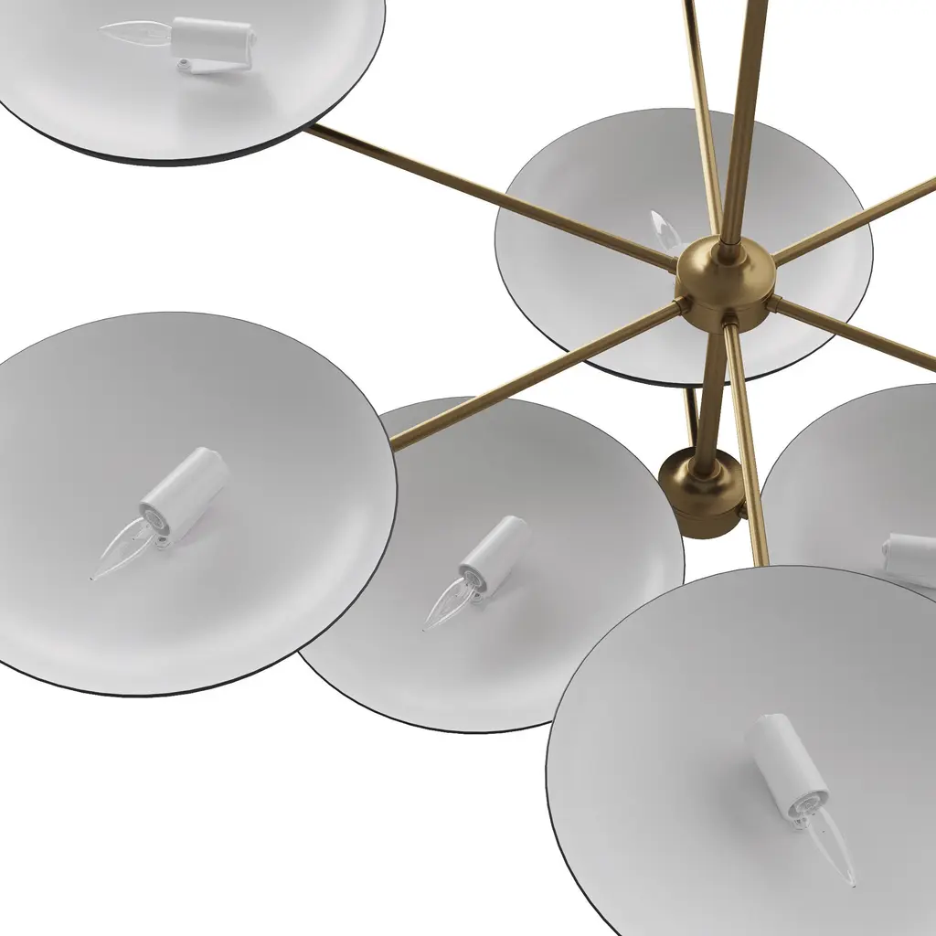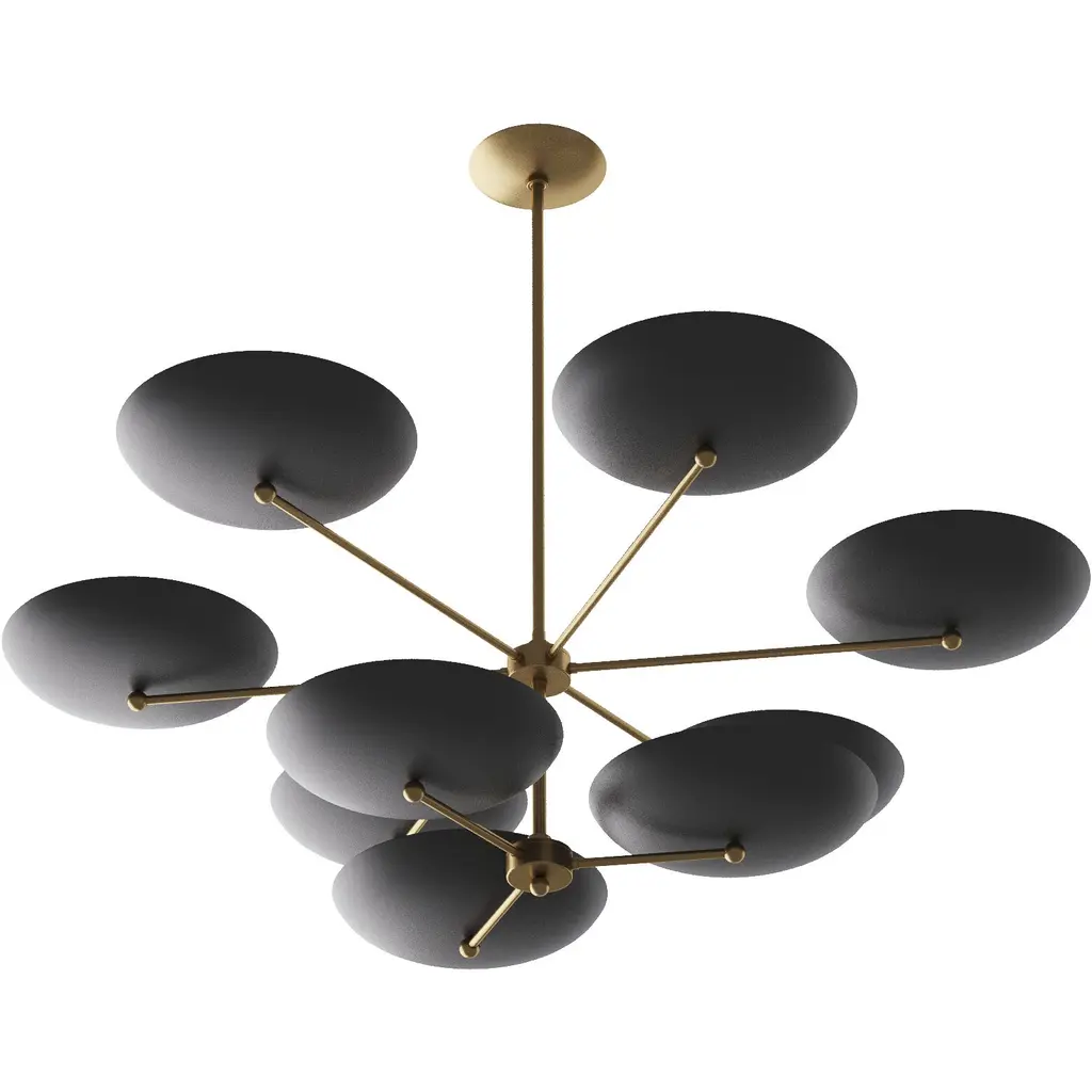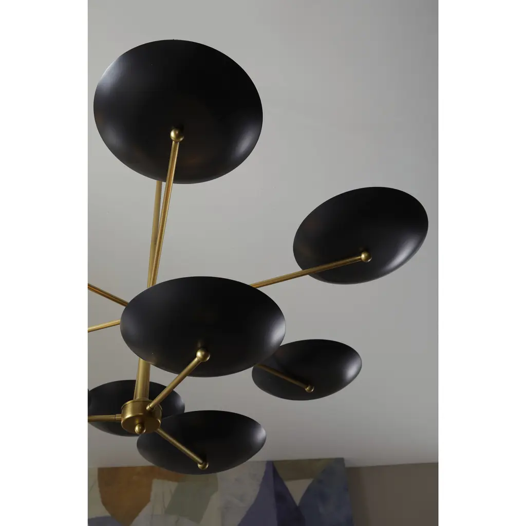 The new two-tiered Griffith chandelier provides a bold presence in any room. Inspired by the grand public spaces of the mid-century era, this architectural chandelier is designed with bronze shades accented by a contrasting antique brass finished steel fame. This fixture’s upward facing plates reflect light, creating a warm, even glow. Damp-rated, although limited covered outdoor conditions may affect finish. Finish will vary.