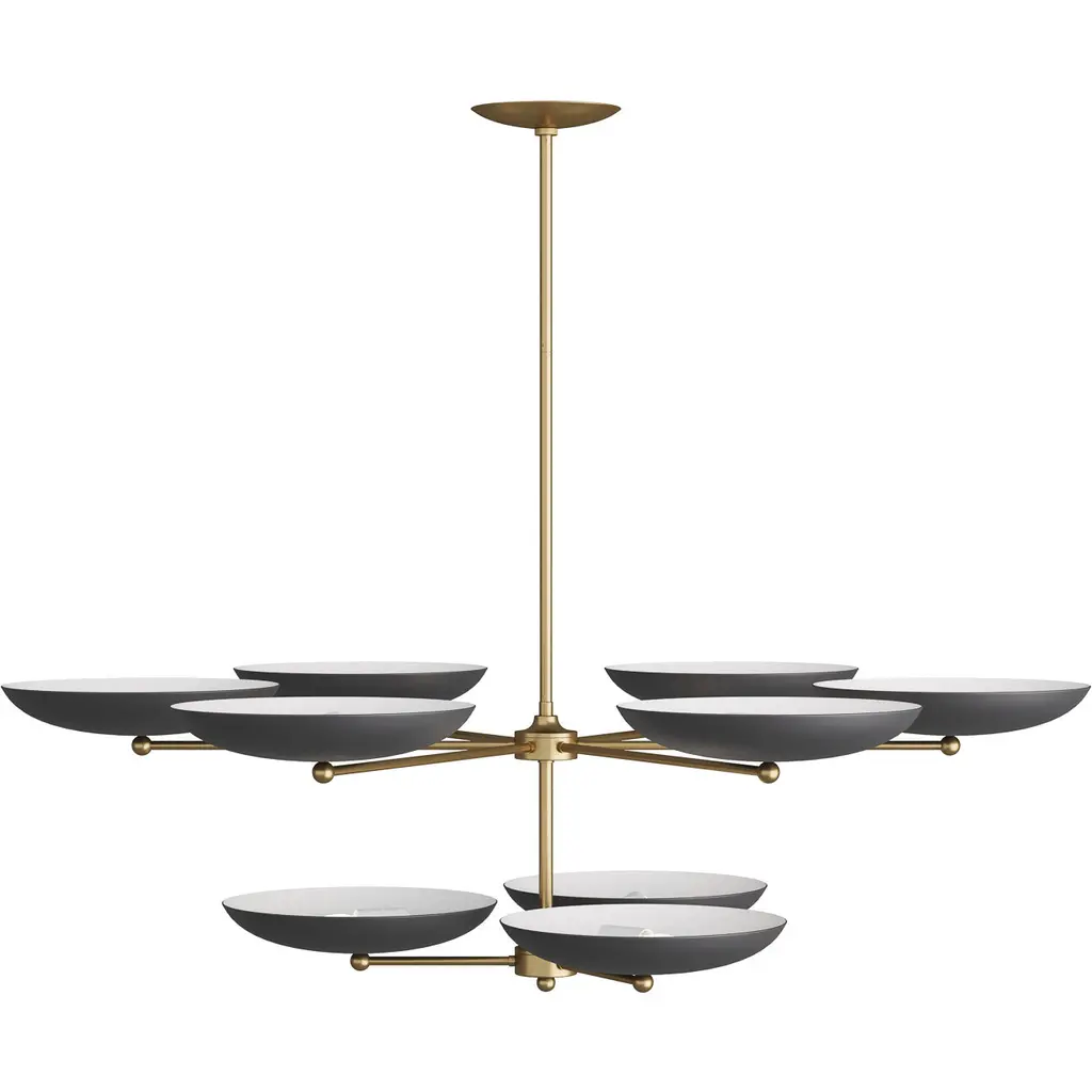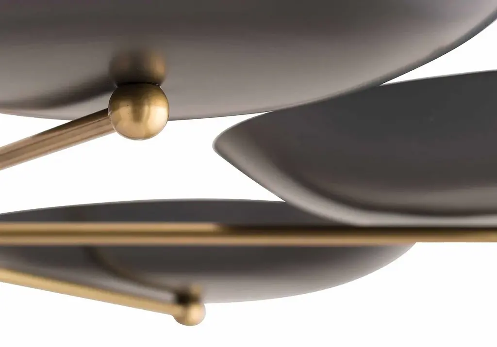 A striking mix, this chandelier features bronze finished plates set on a thin antique brass frame. Its six upwards-facing shades cast a warm, even glow for an added touch of ambiance. Display in a kitchen, office, or bedroom for a sophisticated, refined design.
