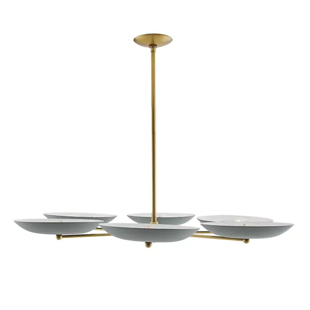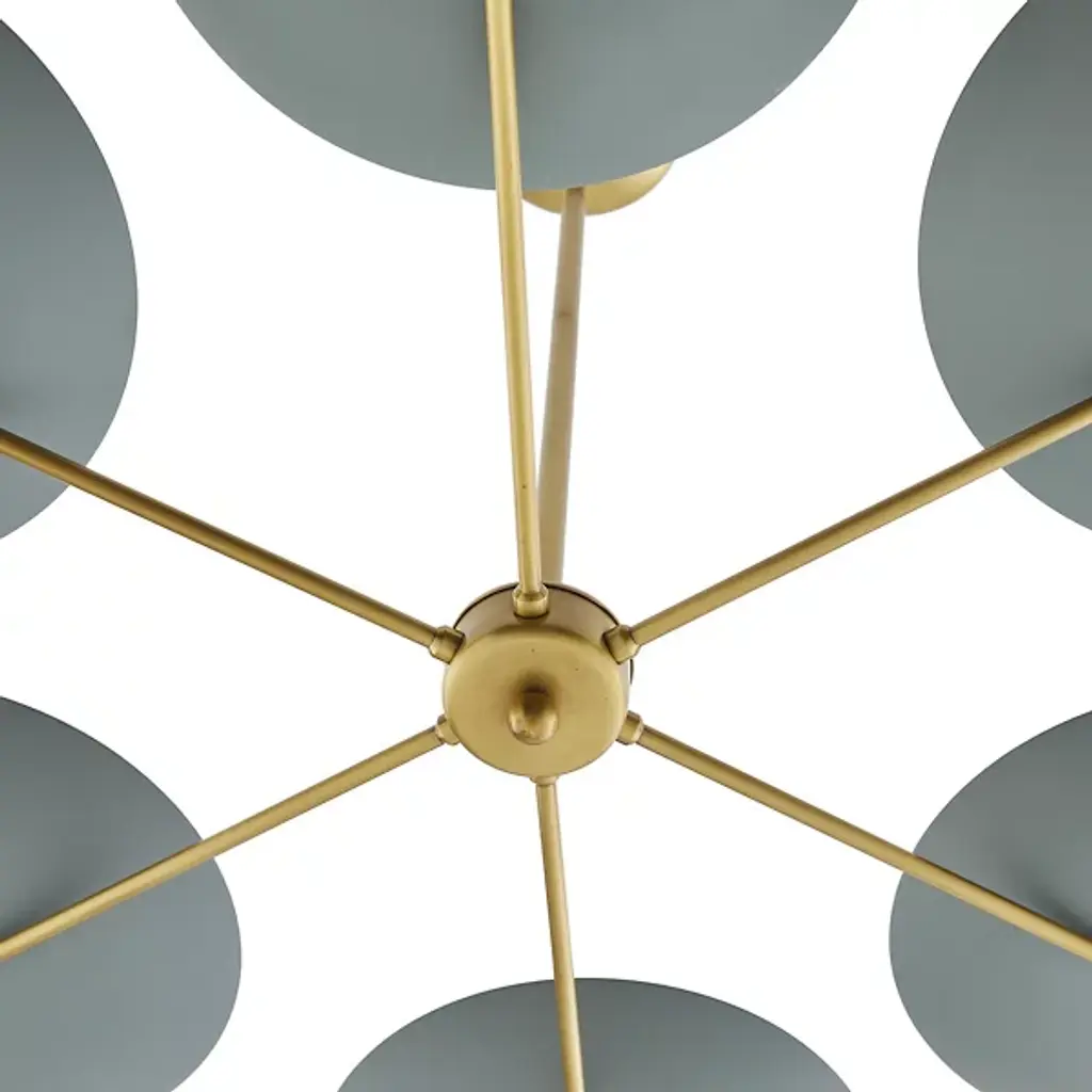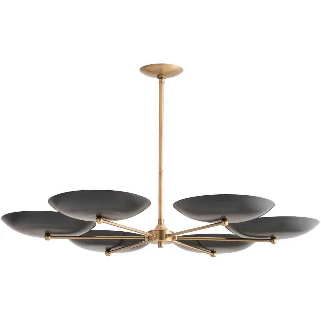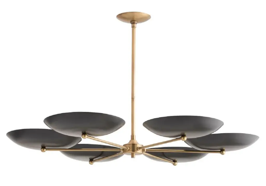 The Griffith Chandelier by Arteriors offers a delicate balance of design and function, featuring an assortment of flat Bronze plates supported by a minimalist Antique Brass frame. By virtue of their shape, each plate guides the light from a single exposed lamp upwards, creating a sophisticated indirect display that both illuminates and inspires.