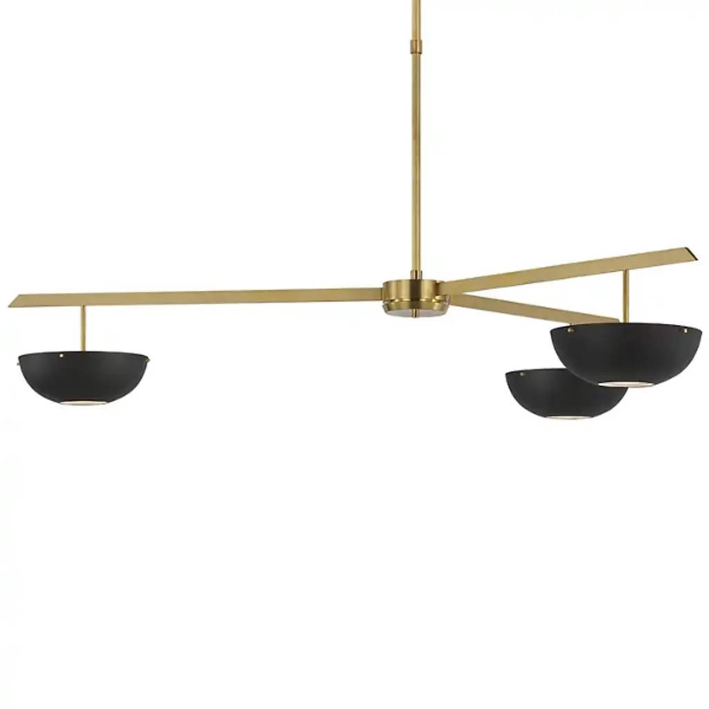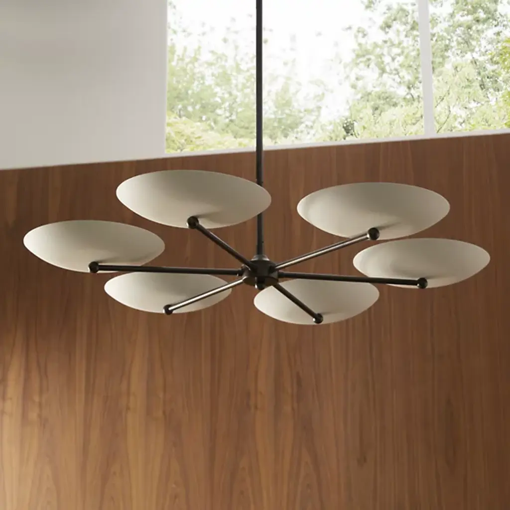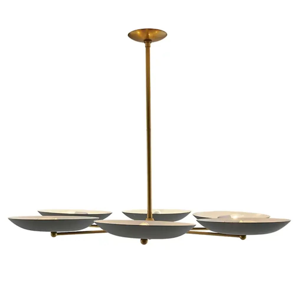 The Griffith Chandelier by Arteriors offers a delicate balance of design and function, featuring an assortment of flat Bronze plates supported by a minimalist Antique Brass frame. By virtue of their shape, each plate guides the light from a single exposed lamp upwards, creating a sophisticated indirect display that both illuminates and inspires.