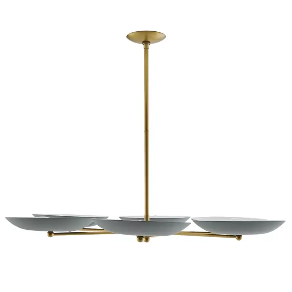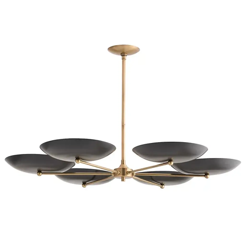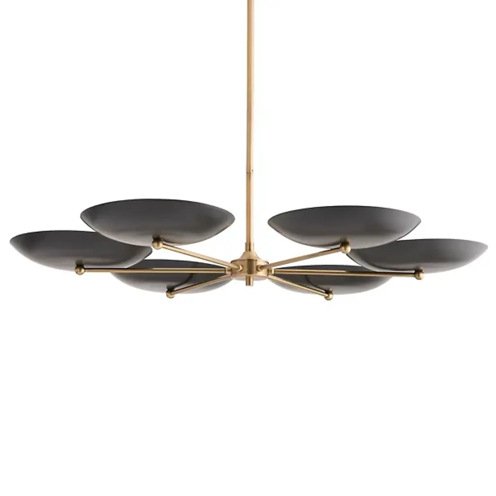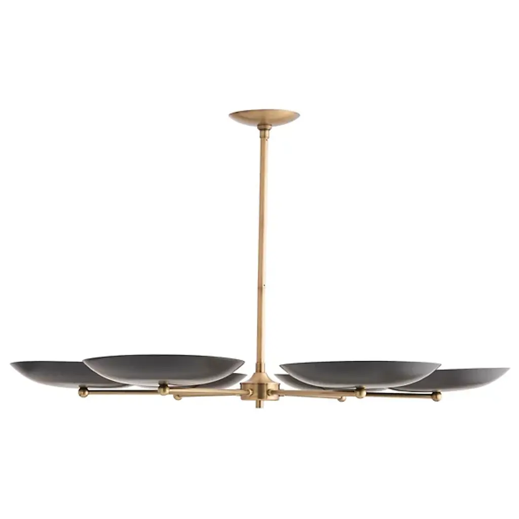 The Griffith Chandelier by Arteriors offers a delicate balance of design and function, featuring an assortment of flat Bronze plates supported by a minimalist Antique Brass frame. By virtue of their shape, each plate guides the light from a single exposed lamp upwards, creating a sophisticated indirect display that both illuminates and inspires.