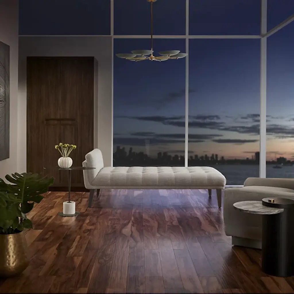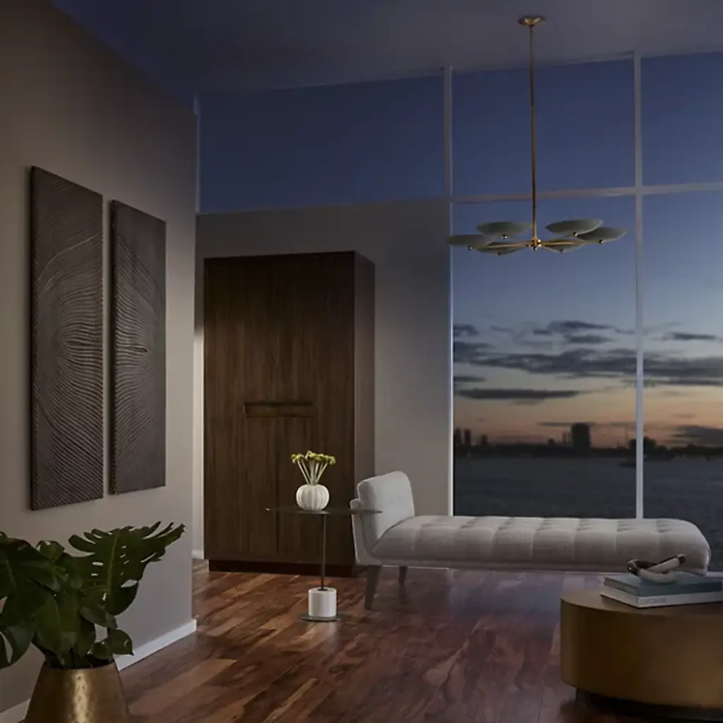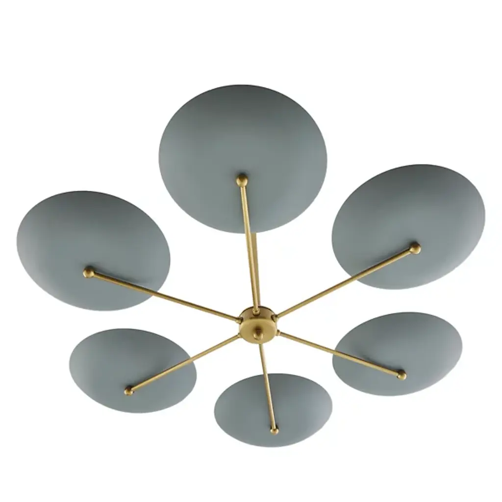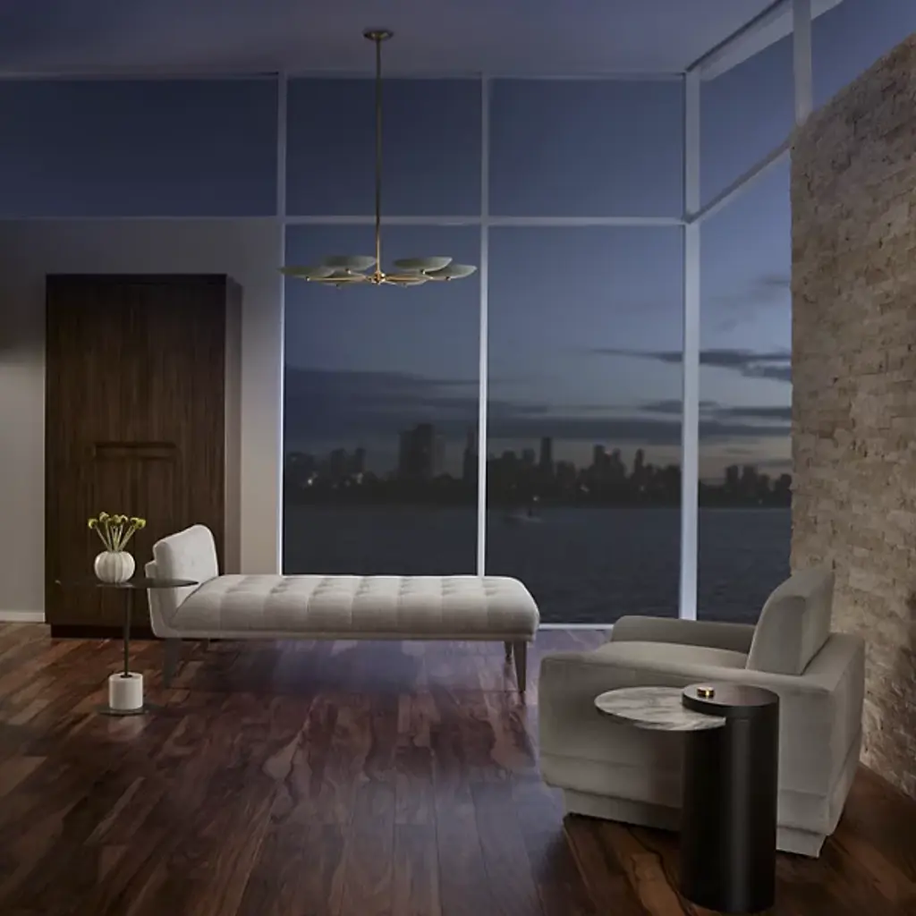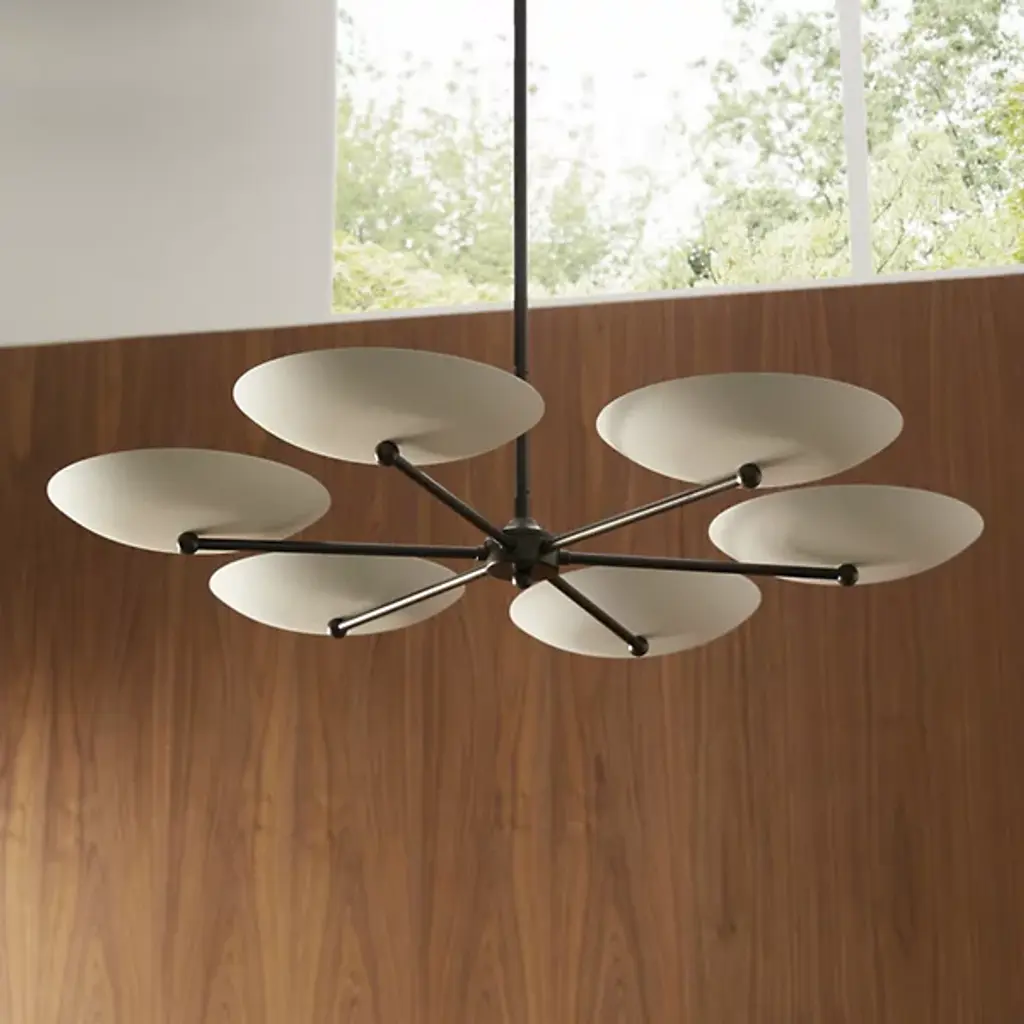 The Griffith Chandelier by Arteriors offers a delicate balance of design and function, featuring an assortment of flat Bronze plates supported by a minimalist Antique Brass frame. By virtue of their shape, each plate guides the light from a single exposed lamp upwards, creating a sophisticated indirect display that both illuminates and inspires.