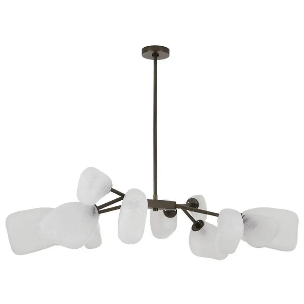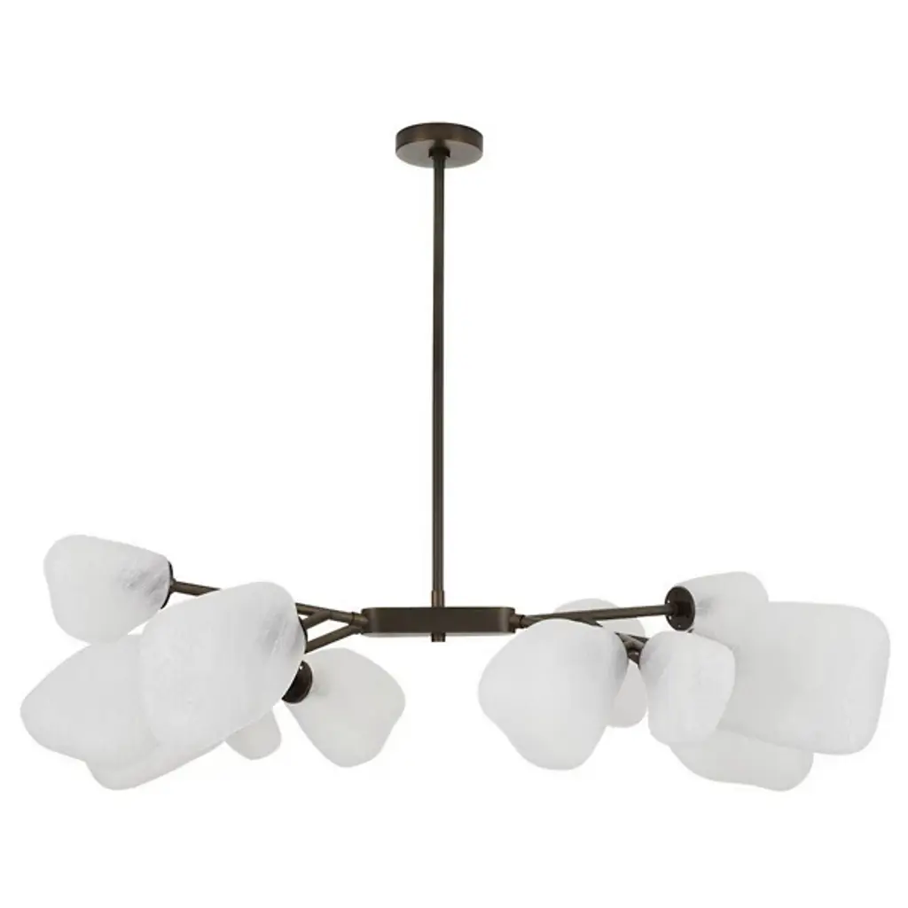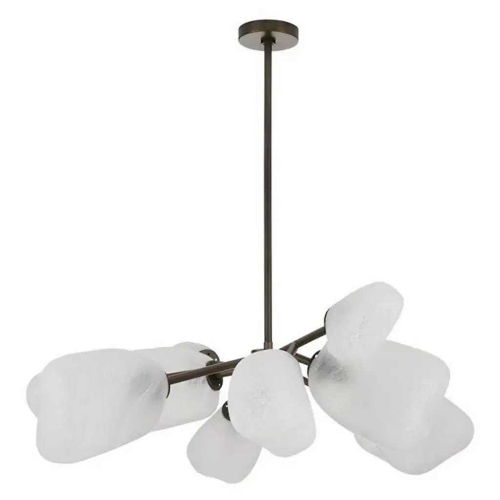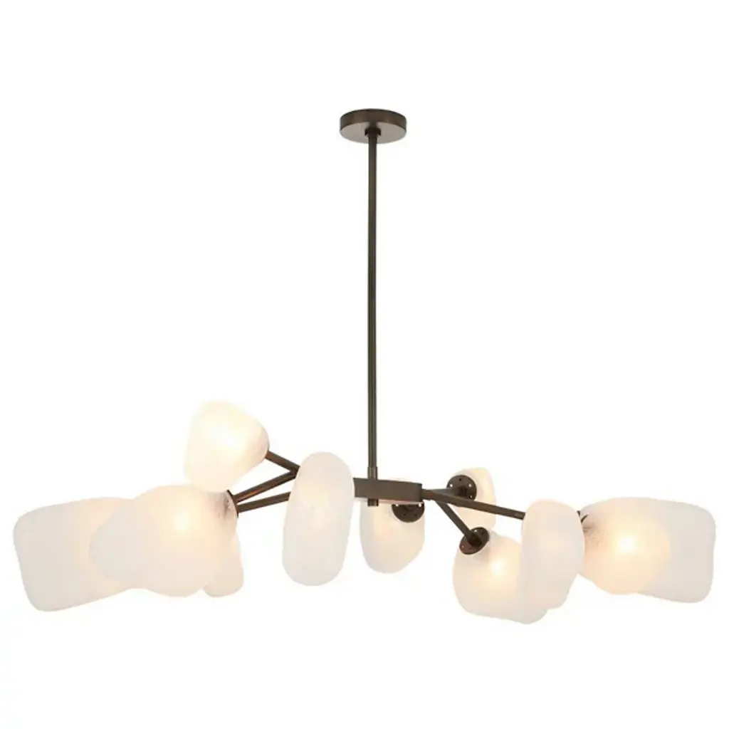 The Grozny Chandelier from Arteriors makes each frosted glass cube its own unique creation, with subtle variations that bring personality to the design. The irregular shapes cluster together on branching arms, producing an organic composition that defies symmetry. English bronze-plated steel provides a sturdy foundation for the ethereal glass forms. This dimmable fixture turns heads with its unconventional approach to lighting design. Its hanging length can also be adjusted as per the room height. The suspension’s frosted finish softens the light output, creating comfortable illumination that works beautifully in both intimate and social settings.