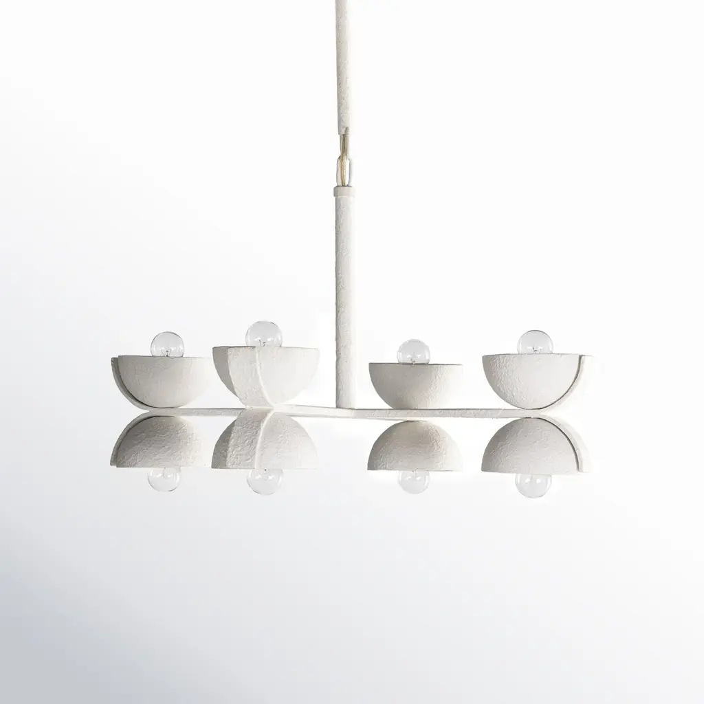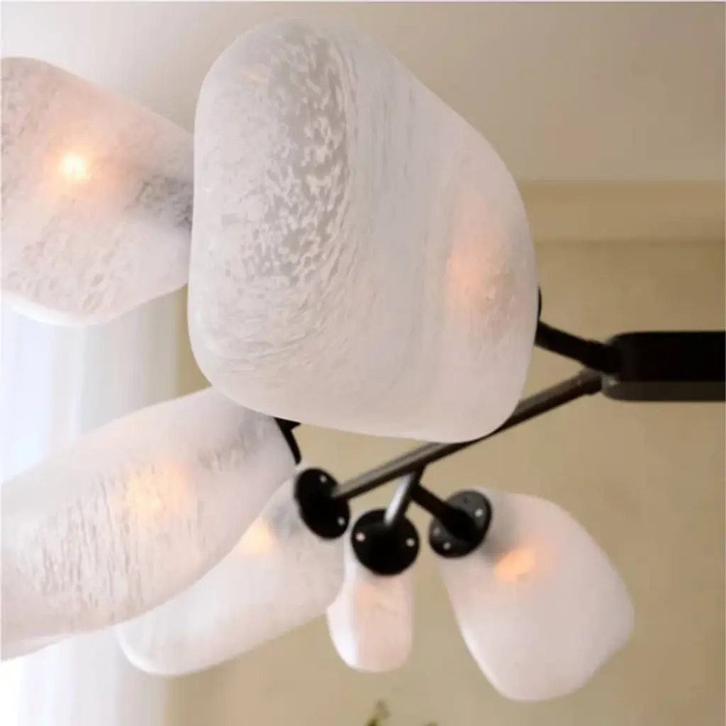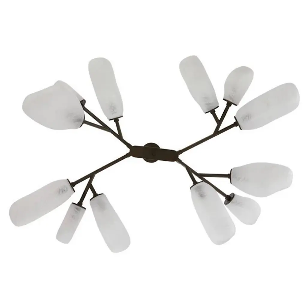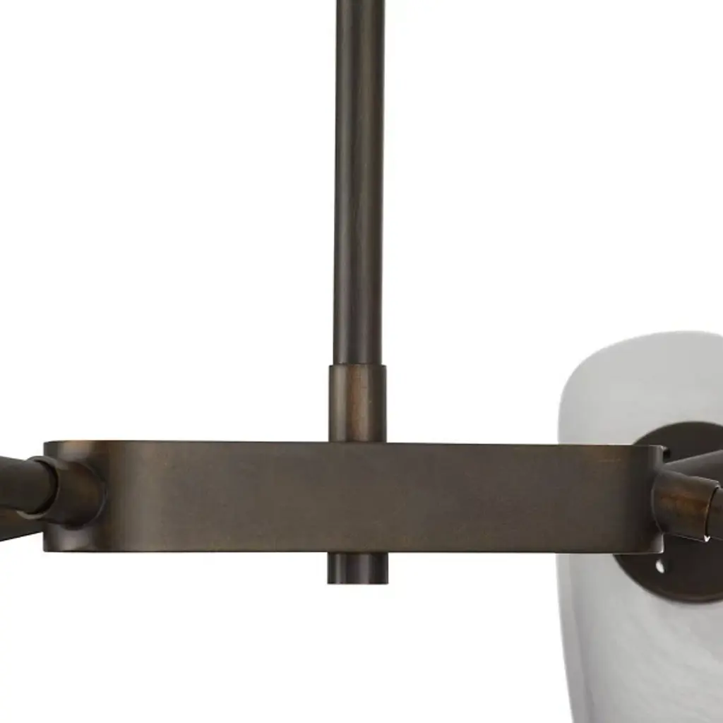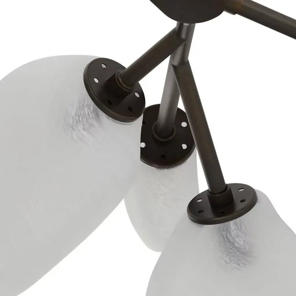 The Grozny Chandelier from Arteriors makes each frosted glass cube its own unique creation, with subtle variations that bring personality to the design. The irregular shapes cluster together on branching arms, producing an organic composition that defies symmetry. English bronze-plated steel provides a sturdy foundation for the ethereal glass forms. This dimmable fixture turns heads with its unconventional approach to lighting design. Its hanging length can also be adjusted as per the room height. The suspension’s frosted finish softens the light output, creating comfortable illumination that works beautifully in both intimate and social settings.
