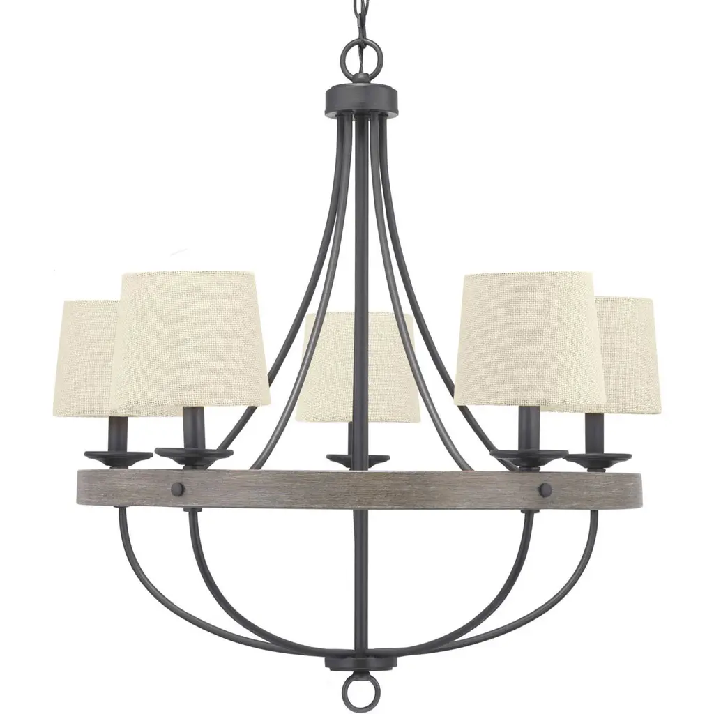 The five-light chandelier in the Gulliver Collection features arching and delicate details that curve to create an airy design. Dual toned frame color combinations in a Graphite finish with weathered oak accents The hand painted wood grained texture complements Rustic and Modern Farmhouse home decor, as well as Urban Industrial and Coastal interior settings.