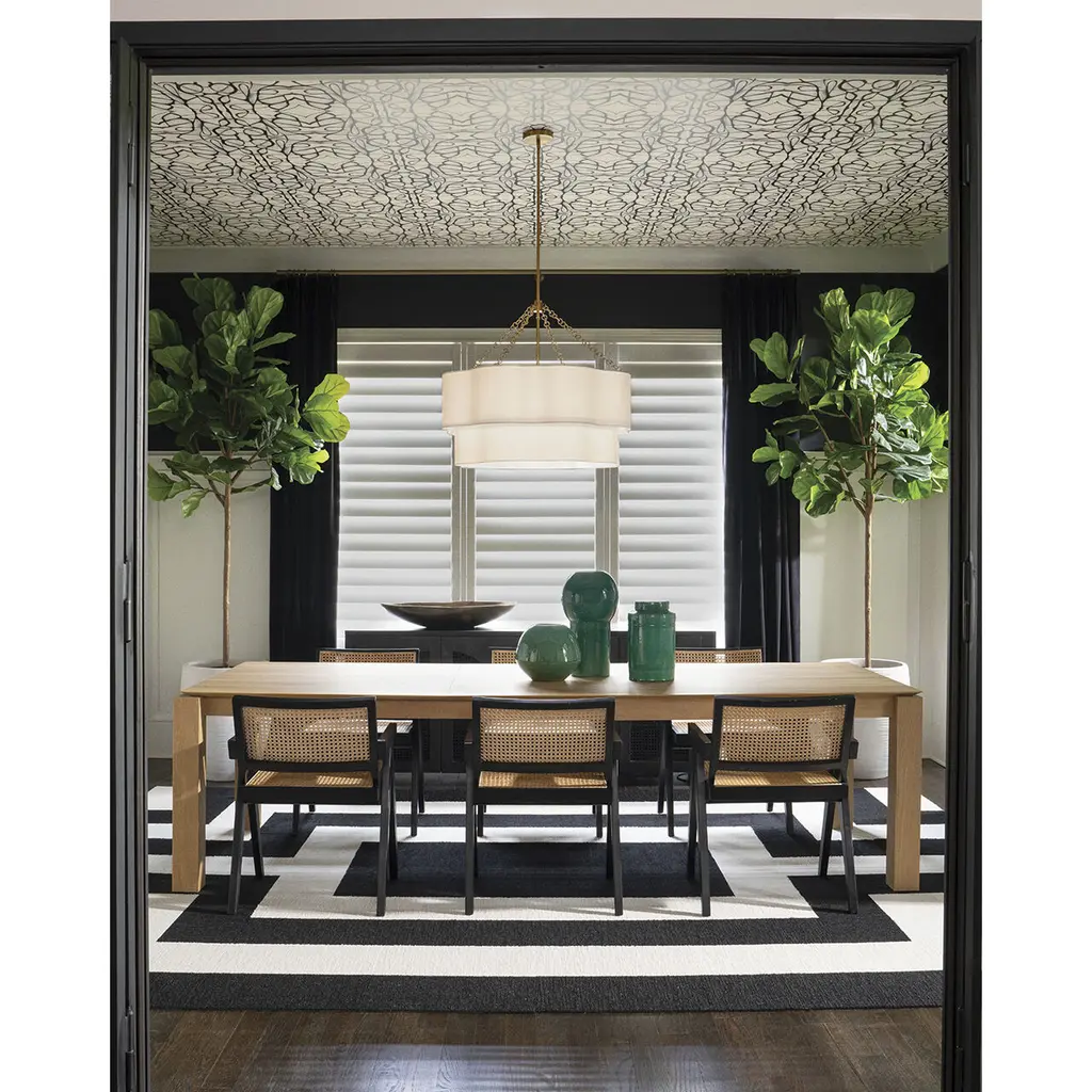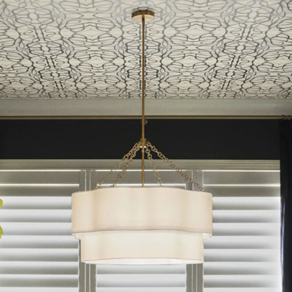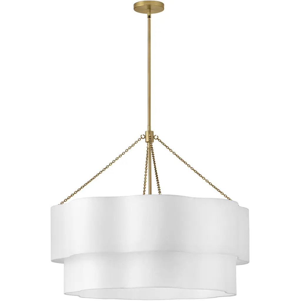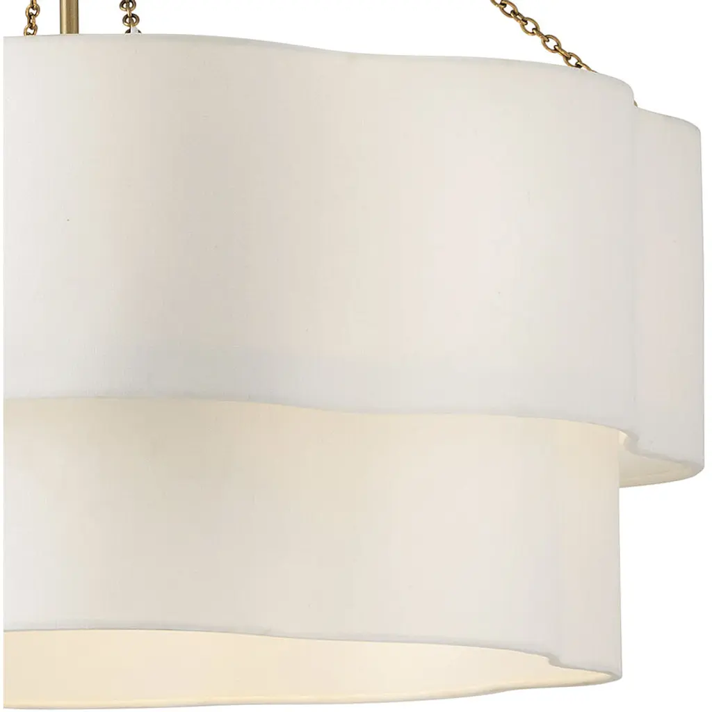 Splendidly soft, Gwens shapely scalloped shade complements inviting light with elegant layers of off-white linen suspended from delicate chains and minimal metal stems. A Black or Lacquered Brass finish provides a versatile complement to any interior style.