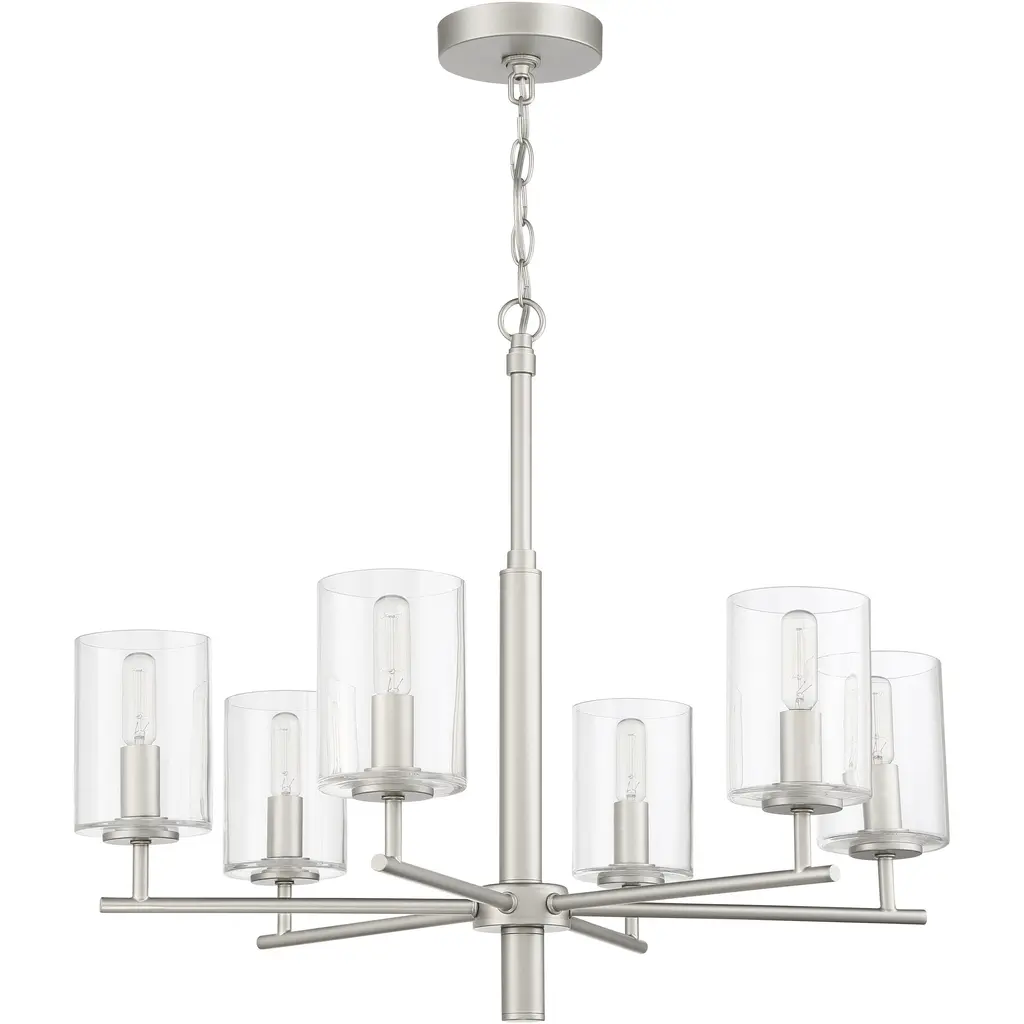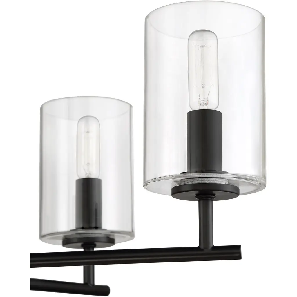 The elevated clear glass cylinder globes and slender arms enhance the simplistic beauty of the Hailie interior lighting collection by Craftmade. The Hailie collection includes a full array of chandeliers, semi and flushmounts, pendant and several sizes of vanity bath bars.