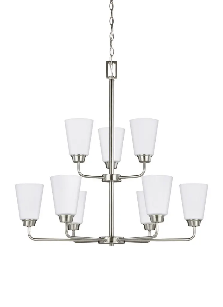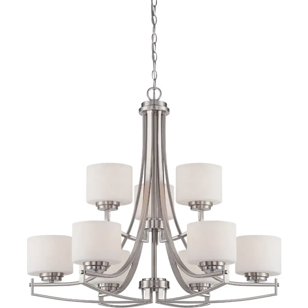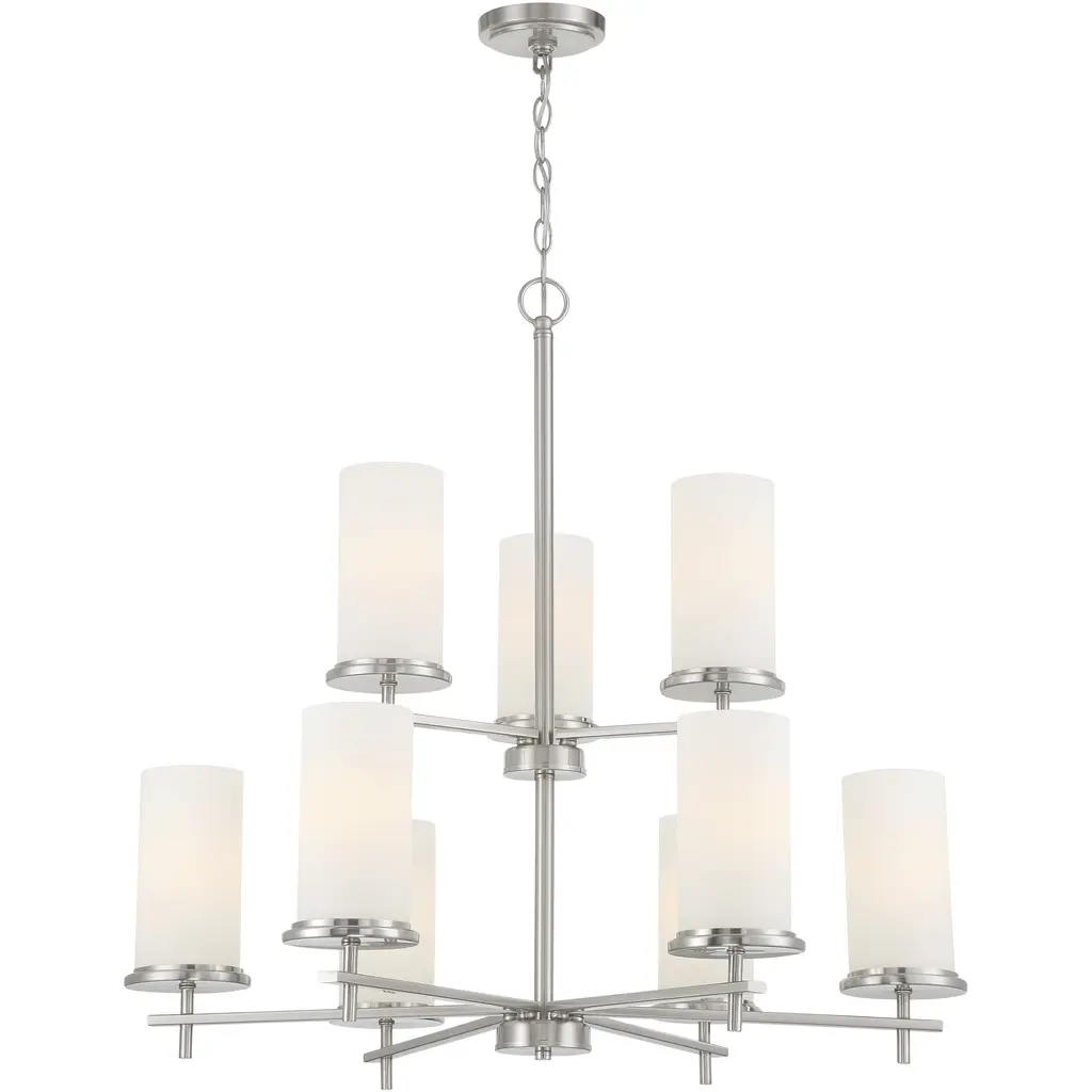 Bring a smooth silhouette of metal and glass to the spaces of your modern home with the Haisley 2-Tier Chandelier from Minka-Lavery. Lowering from the ceiling with a simple chainlink, this piece features a downrod set and two disc-shaped center piece that extend matching, horizontal arms. Each arm leads to a cylindrical shade made of clear glass that contains a single bulb. The light from the bulbs, oriented equally around the frame, provides a full glow in the room.