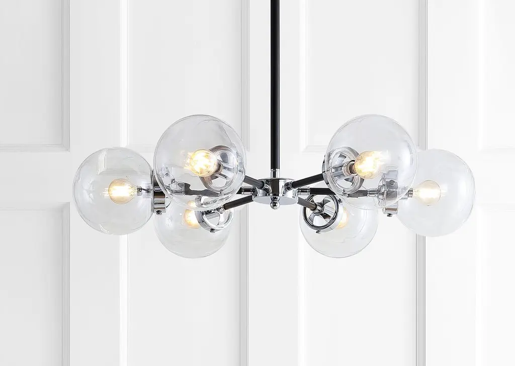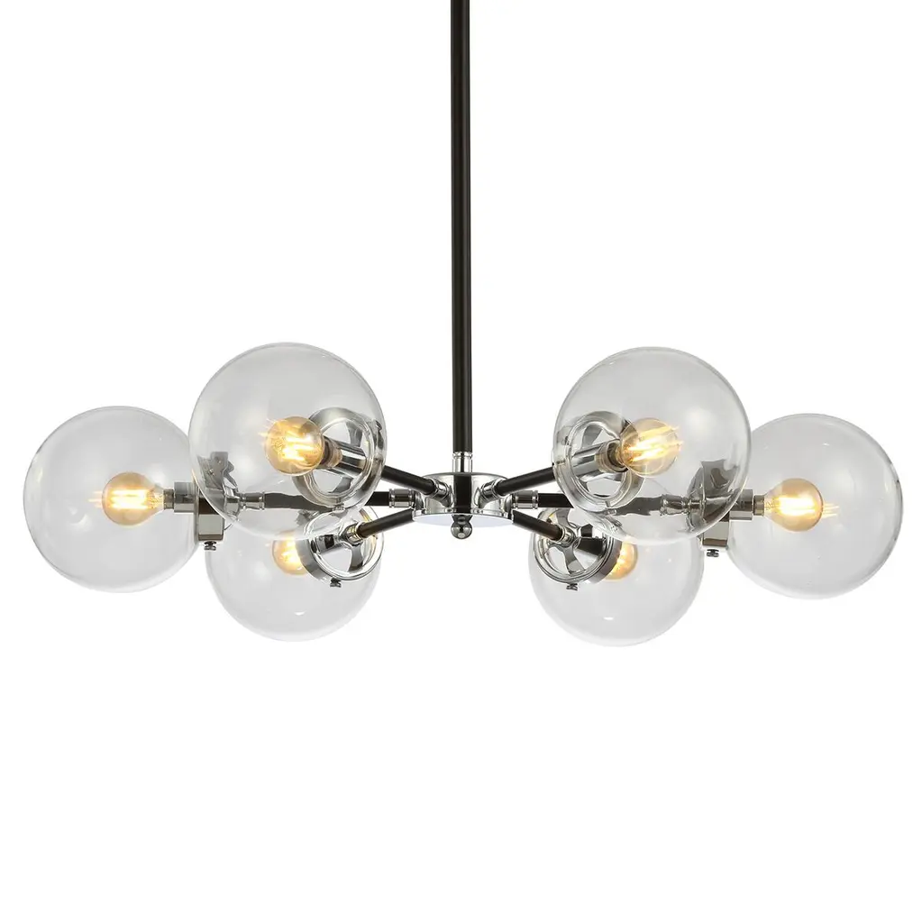 Featuring a six-light pendant that is both neutral and decorative. With clear glass spheres, this chandelier is decorated carefully to evoke elegant detail. The spoke layout of the arms would be particularly well suited to above a round dining table or a contemporary kitchen island.