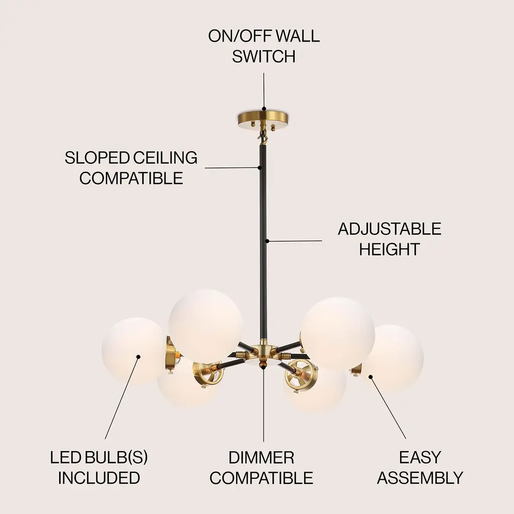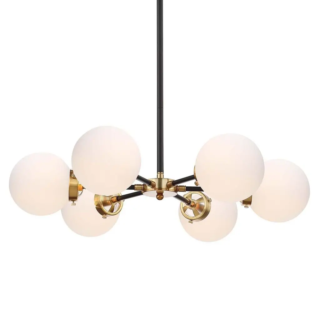 Featuring a brass gold and flat black finish, this six-light pendant is both neutral and decorative. With frosted glass spheres, this pendant is decorated carefully to evoke elegant detail. The spoke layout of the arms would be particularly well suited to above a round dining table or a contemporary kitchen island.