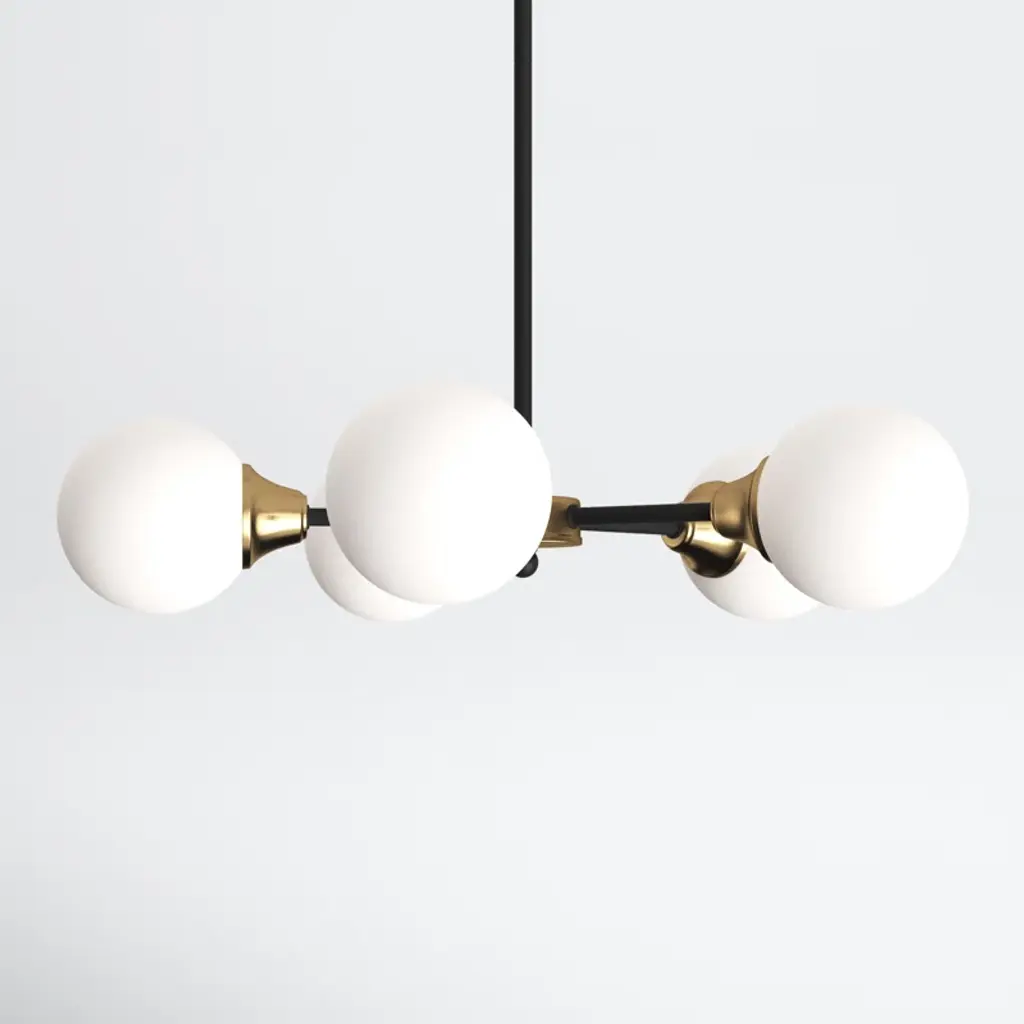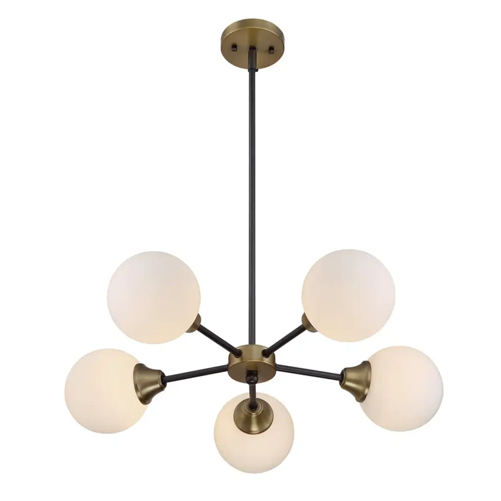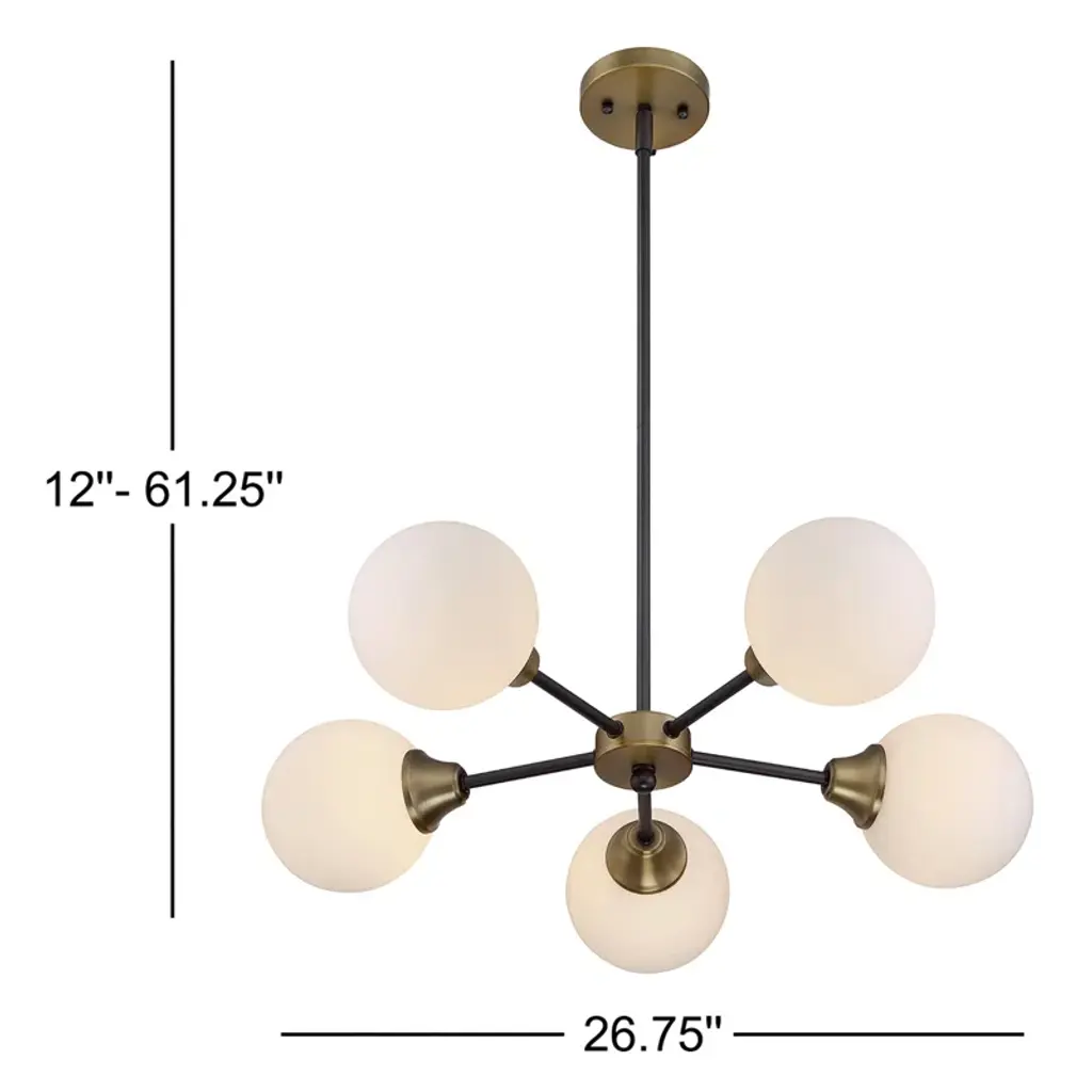 Matte gold and black accents combine in this sleek, trend-forward chandelier. It's made from metal and hangs from a sloped ceiling-compatible canopy and a length of adjustable height downrod. The 5 simple, sophisticated shades have a classic globe silhouette with a white frosted look that filters light from 5 candelabra-base bulbs of up to 60W each. Best of all, this sputnik-style chandelier is also compatible with dimmer switches.