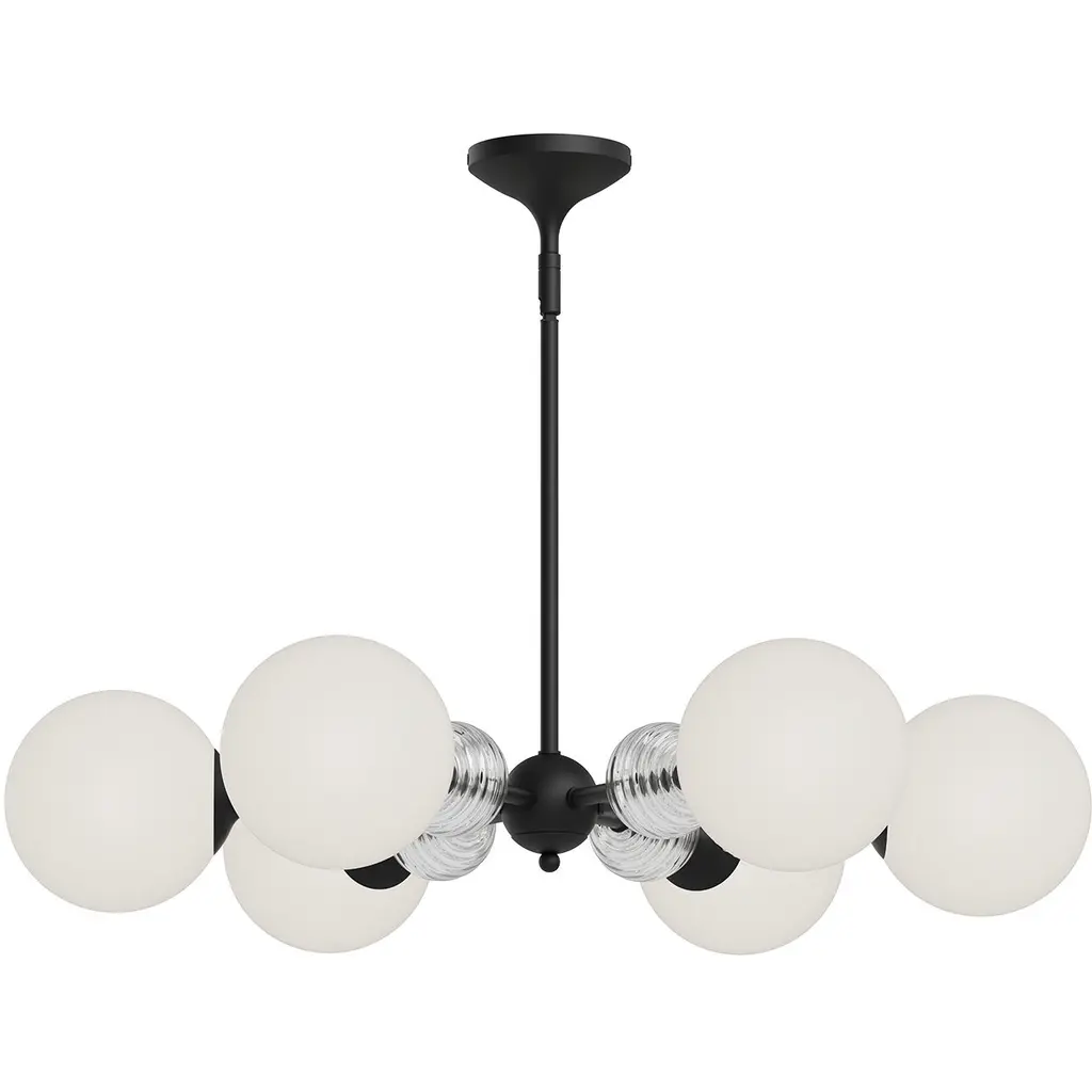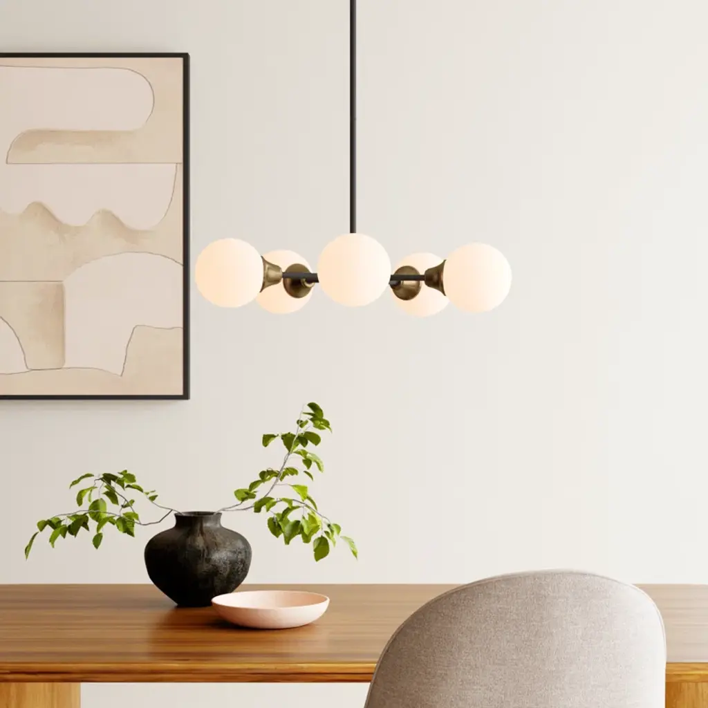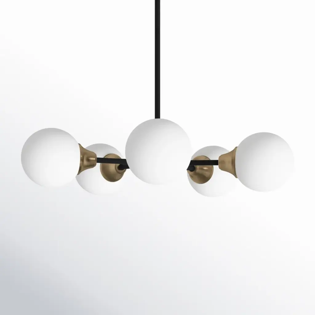Matte gold and black accents combine in this sleek, trend-forward chandelier. It's made from metal and hangs from a sloped ceiling-compatible canopy and a length of adjustable height downrod. The 5 simple, sophisticated shades have a classic globe silhouette with a white frosted look that filters light from 5 candelabra-base bulbs of up to 60W each. Best of all, this sputnik-style chandelier is also compatible with dimmer switches.