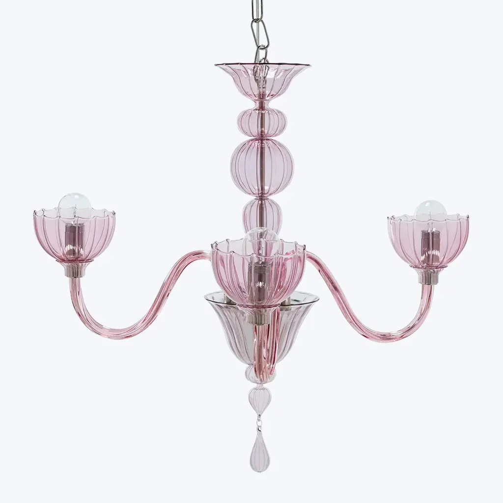 Rooted in the storied glassmaking traditions of Murano, this three-arm chandelier captures the refined elegance of Venetian lighting in a more compact silhouette. Each glass element is handblown by skilled artisans, showcasing delicate curves and luminous clarity that reflect centuries of Italian craftsmanship. Available rich tobacco glass, this chandelier offers a romantic and contemporary take on a classic form. The scaled-down design makes it perfect for intimate dining areas, bedrooms, powder rooms, or reading nooks—anywhere that could benefit from a touch of sculptural beauty and ambient light.