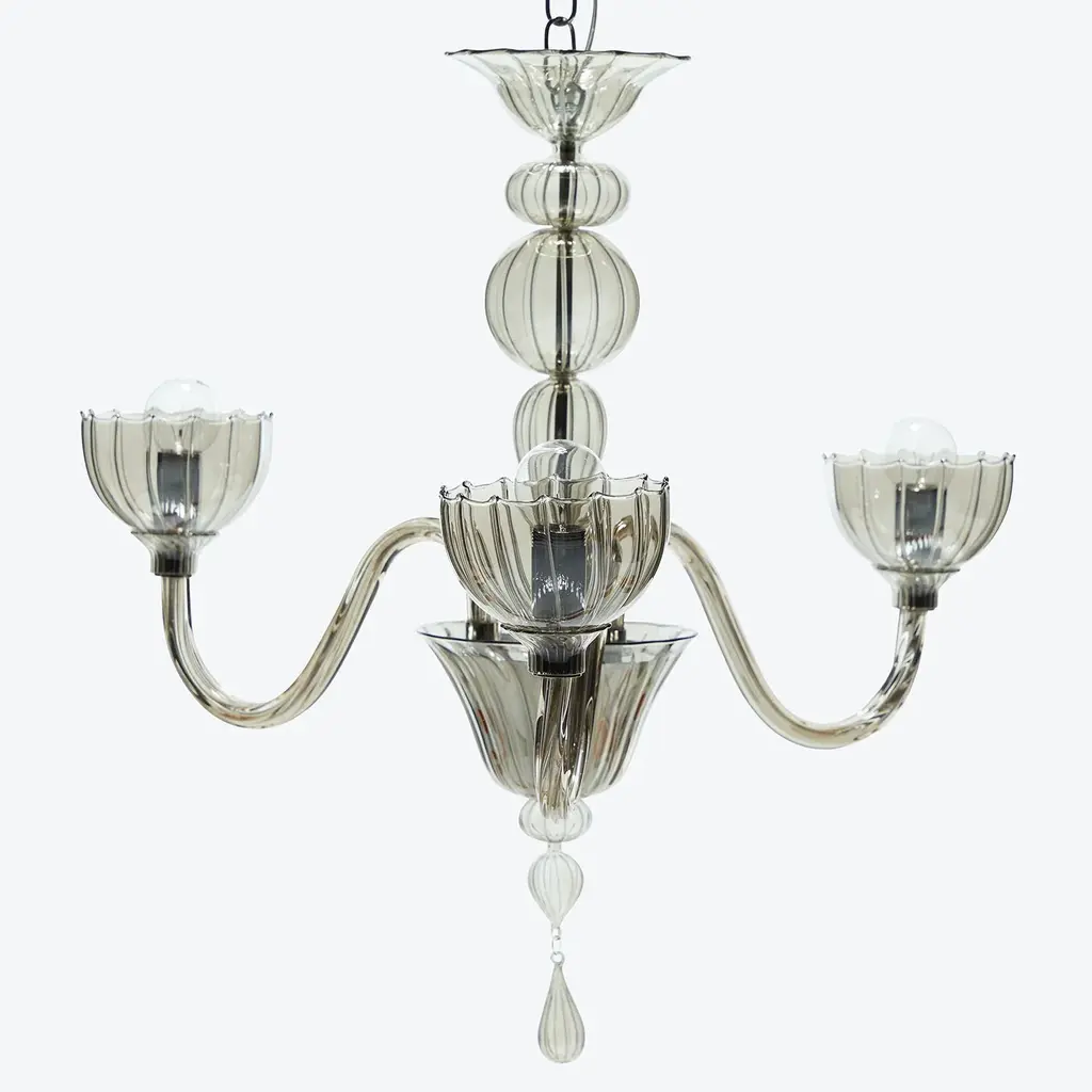 Rooted in the storied glassmaking traditions of Murano, this three-arm chandelier captures the refined elegance of Venetian lighting in a more compact silhouette. Each glass element is handblown by skilled artisans, showcasing delicate curves and luminous clarity that reflect centuries of Italian craftsmanship. Available rich tobacco glass, this chandelier offers a romantic and contemporary take on a classic form. The scaled-down design makes it perfect for intimate dining areas, bedrooms, powder rooms, or reading nooks—anywhere that could benefit from a touch of sculptural beauty and ambient light.