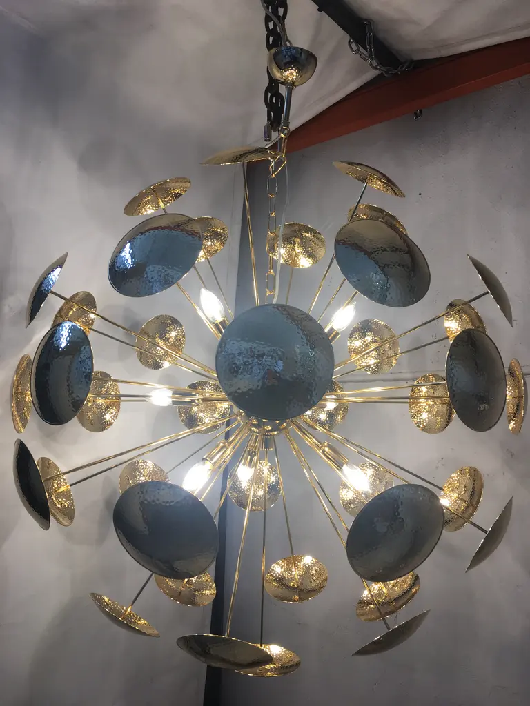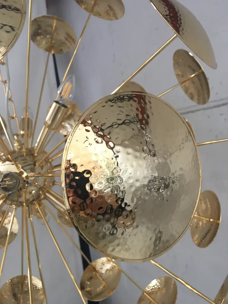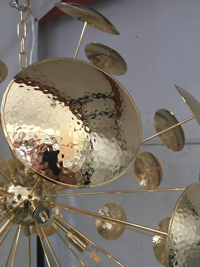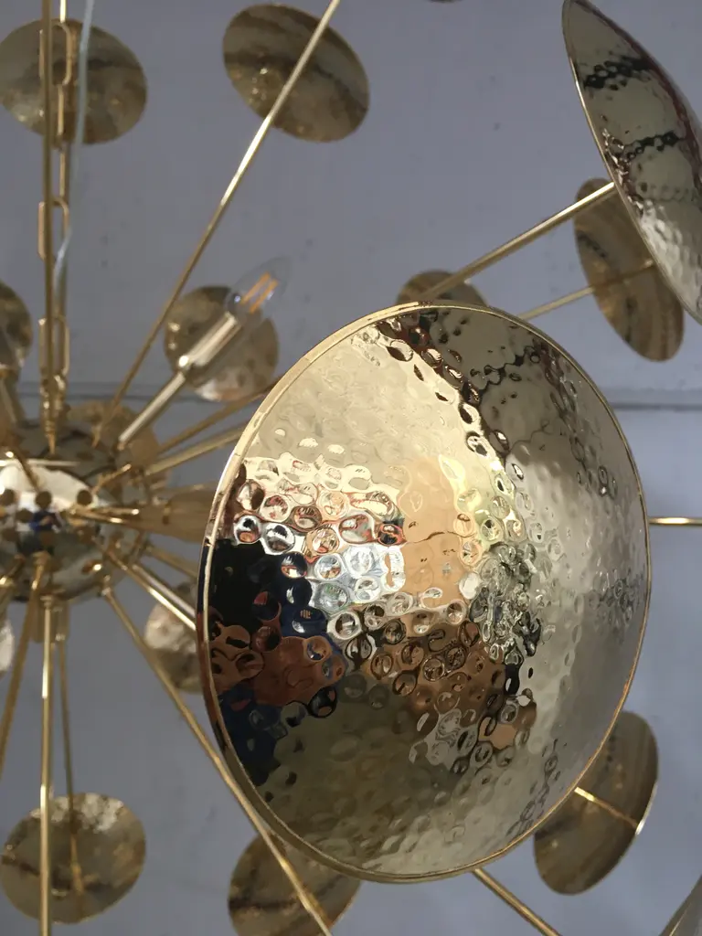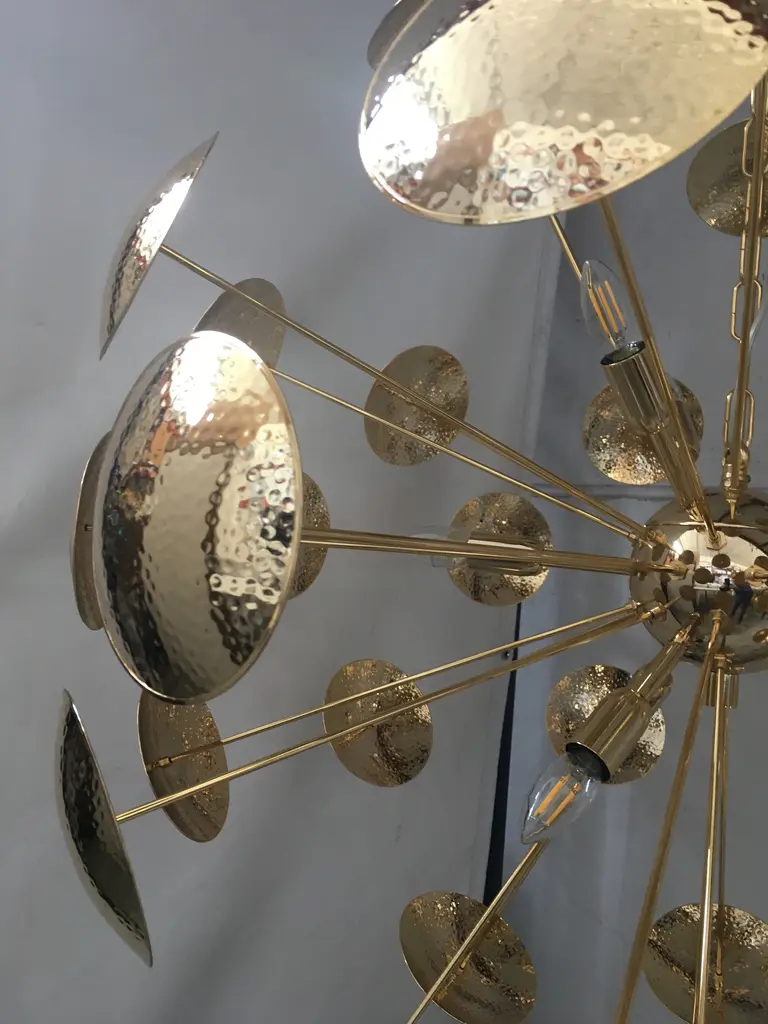 Handmade hammered Sputnik Chandelier in gold Luxury contemporary water-lily Sputnik sphere chandelier. Hand-made brass elements worked by hand. Fruit of high Italian craftsmanship. Dimensions (cm/in): D 100cm /D 39.2″ Finiture: Gold24K brass metal frame 9 bulbs not included Ship in strong packing not assembly in wooden crate Actually is wiring for italian but in some weeks i could re-wiring for USA
