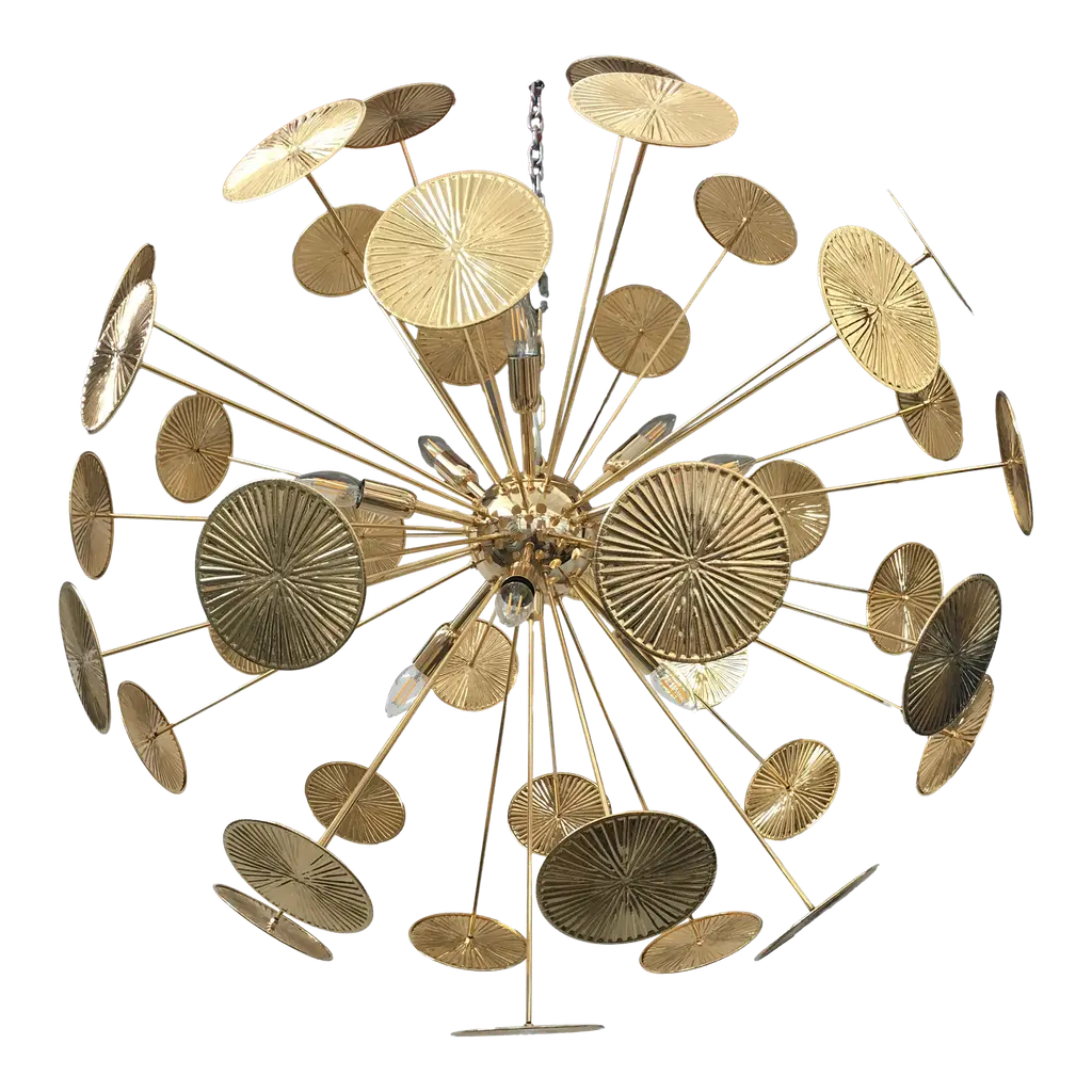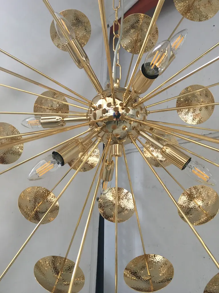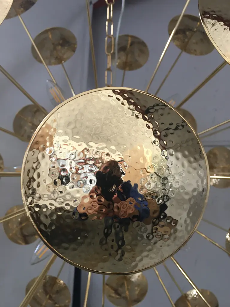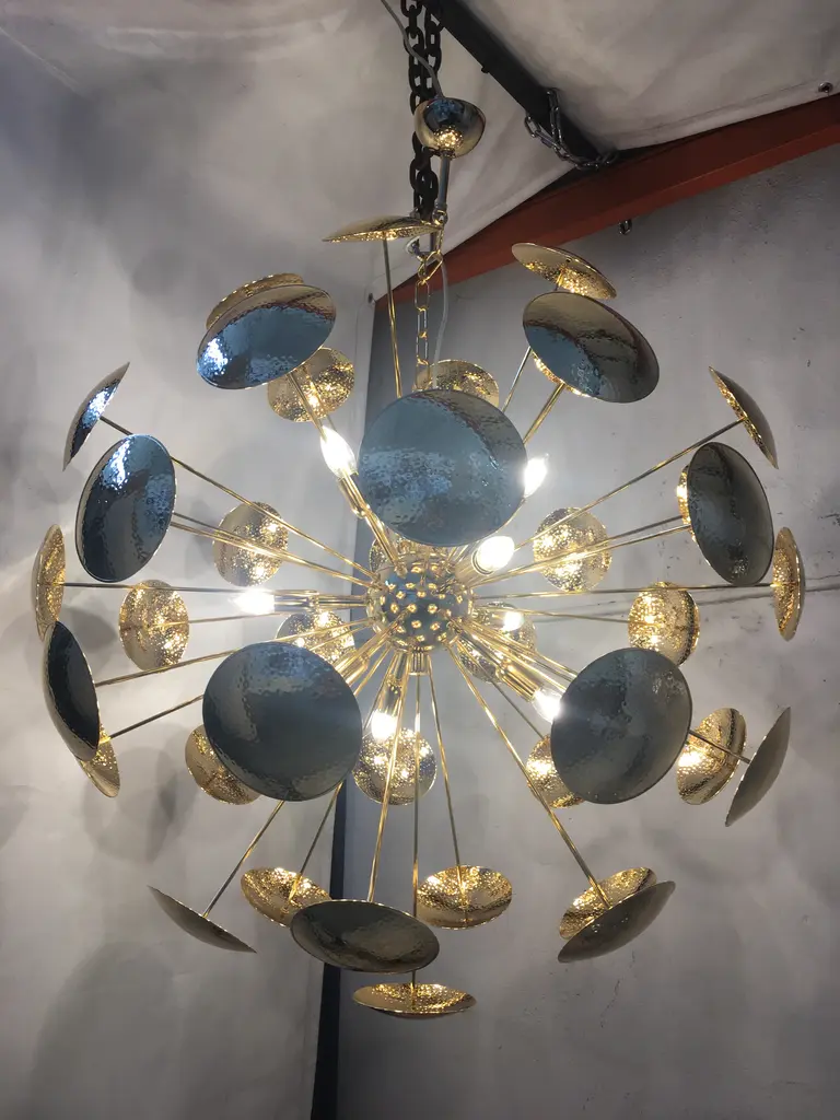 Handmade hammered Sputnik Chandelier in gold Luxury contemporary water-lily Sputnik sphere chandelier. Hand-made brass elements worked by hand. Fruit of high Italian craftsmanship. Dimensions (cm/in): D 100cm /D 39.2″ Finiture: Gold24K brass metal frame 9 bulbs not included Ship in strong packing not assembly in wooden crate Actually is wiring for italian but in some weeks i could re-wiring for USA