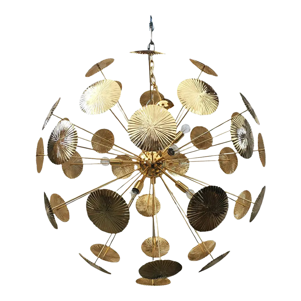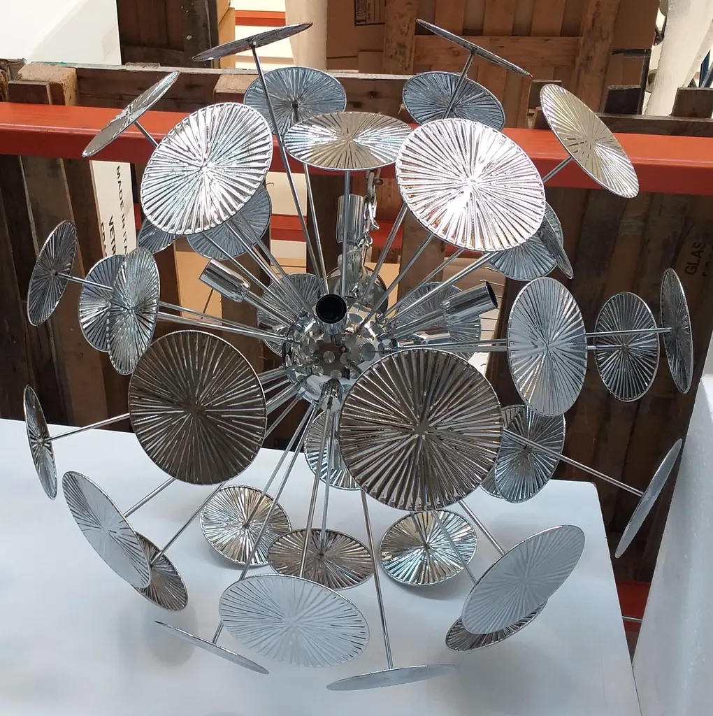 Handmade hammered Sputnik Chandelier in kromo Hand-made brass elements worked by hand. Fruit of high Italian craftsmanship. Dimensions (cm/in): D 100cm /D 39.2″ Finiture: kromo brass metal frame 9 bulbs not included Ship in strong packing not assembly in wooden crate Actually is wiring for italian but in some weeks i could re-wiring for USA