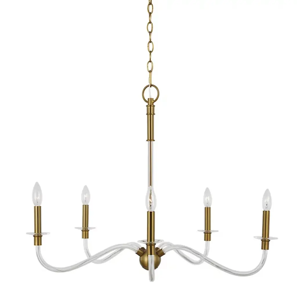 The Hanover Chandelier by Visual Comfort Studio, formerly known as Chapman & Myers, is an elegant addition to spaces. With sweeping, gracefully curved arms made from lucite and a matching stem, the simple silhouette of this chandelier looks airy and sophisticated as this material pairs with beautifully finished metal elements. Exposed candelabras lend an even layer of illumination to surroundings, and this design is suspended from a decorative loop and linked chain to bring a bright touch to rooms.
