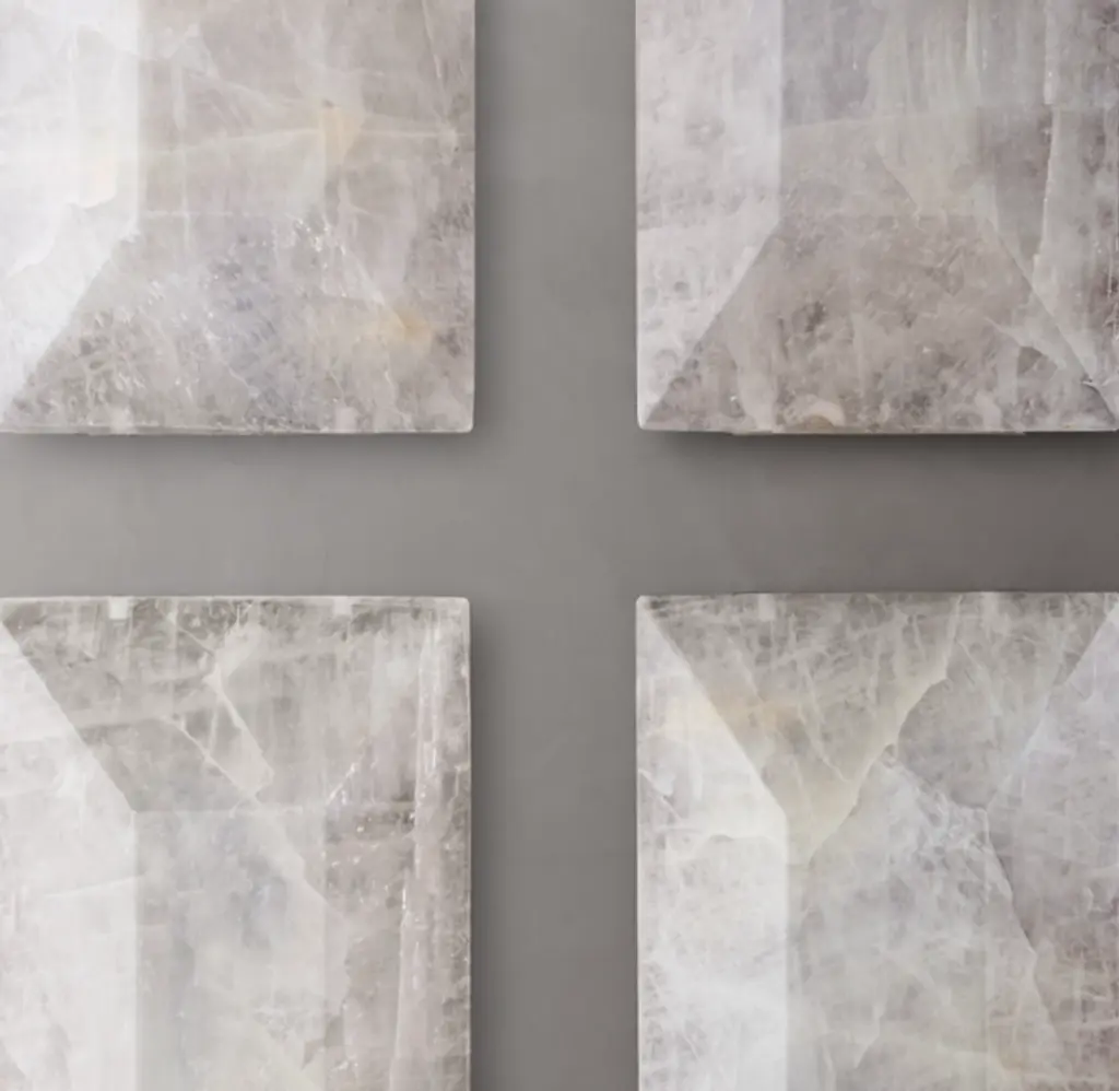 Translucent calcite is cut in sheer and faceted slabs, each held in place by a slender mount in our dramatic collection. Warm light shines through the stone, accentuating the play of crystal formations within. Designed by Timothy Oulton, the collection showcases natural beauty with a minimalist sensibility. SHOP THE ENTIRE COLLECTION
