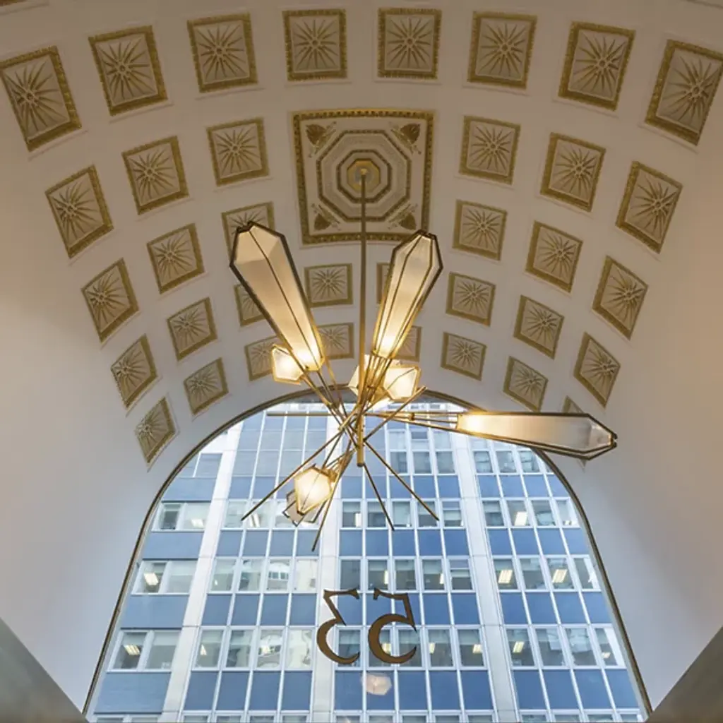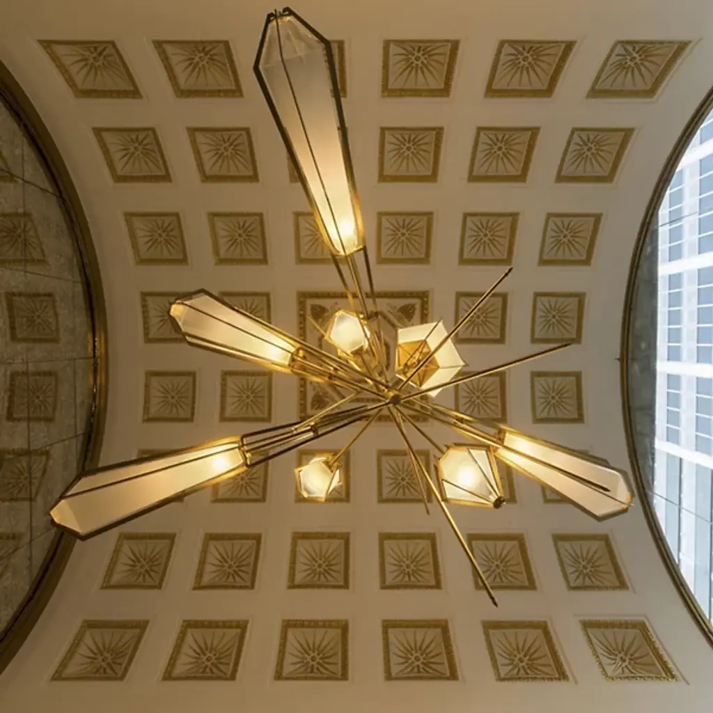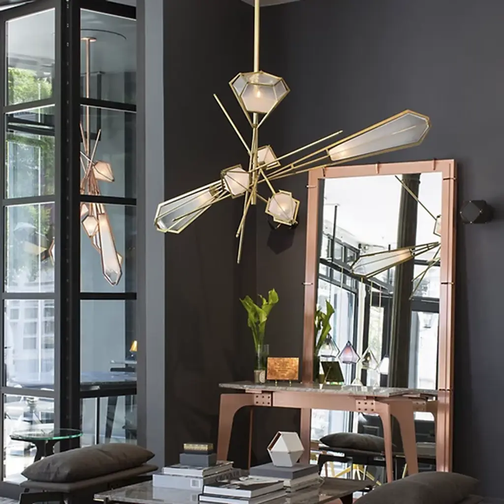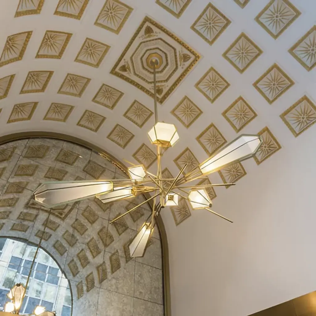 Modern and eletant. The Harlow Large Chandelier from Gabriel Scott features a striking look that will prove to be a veritable showstopper in whatever space it’s in. The metallic frame houses mold-blown glass, giving this product a look that was directly inspired the world of jewelry. The glass reflects and refracts light around the room to create a dazzling, prism-like display, making it a luxurious addition to any setting in which it’s installed.