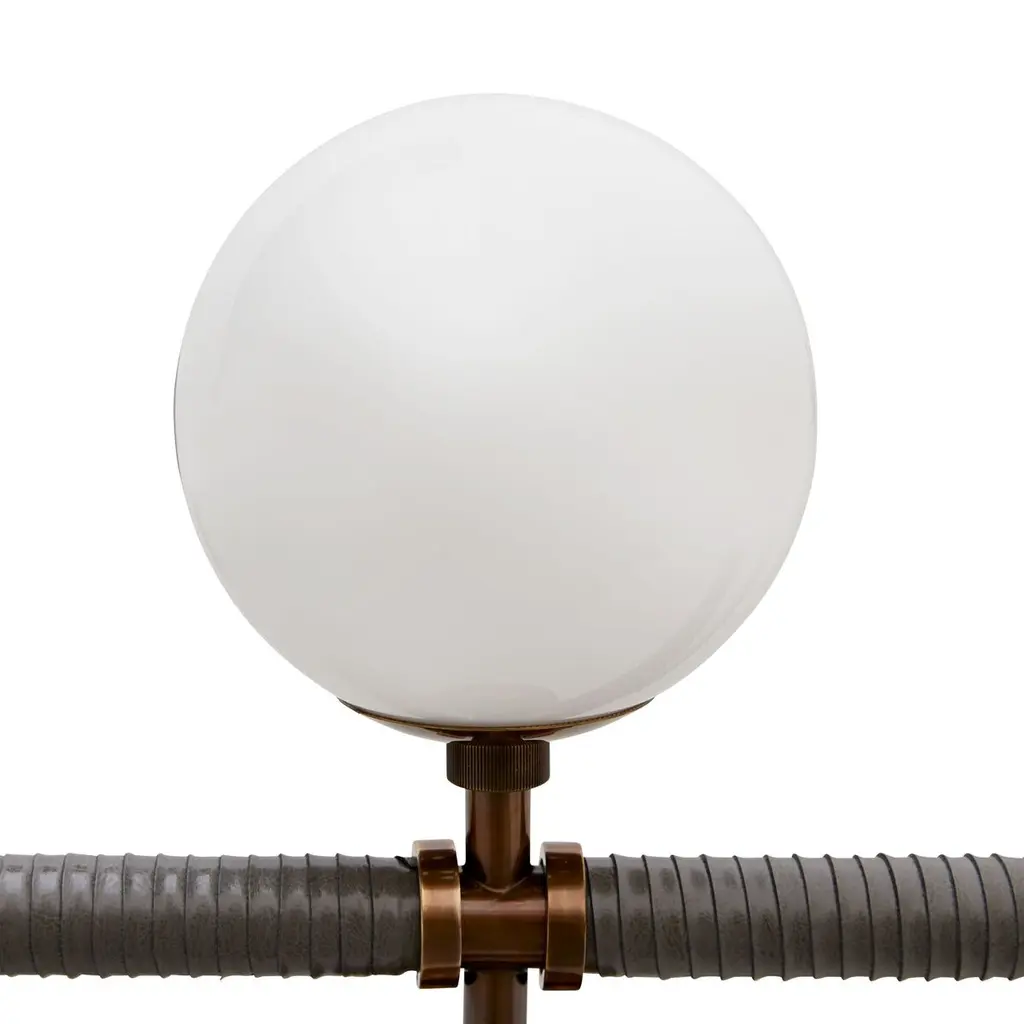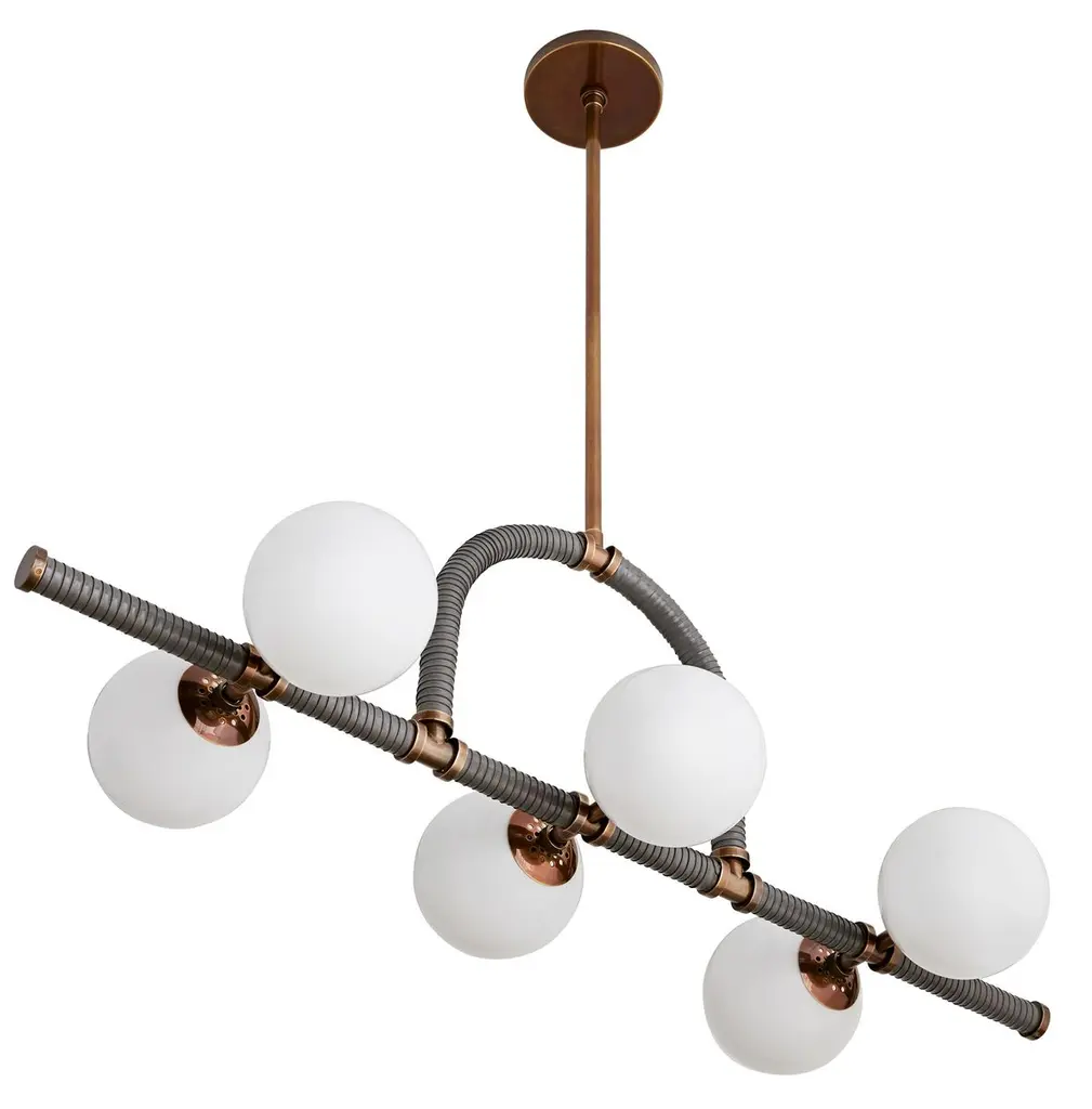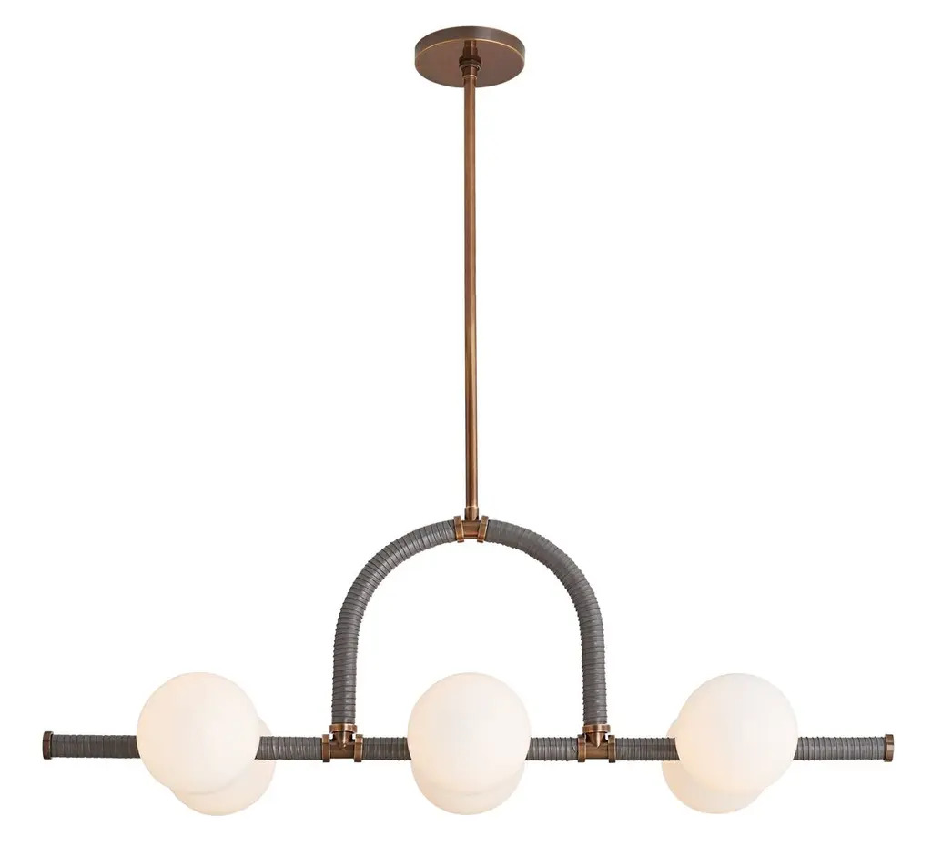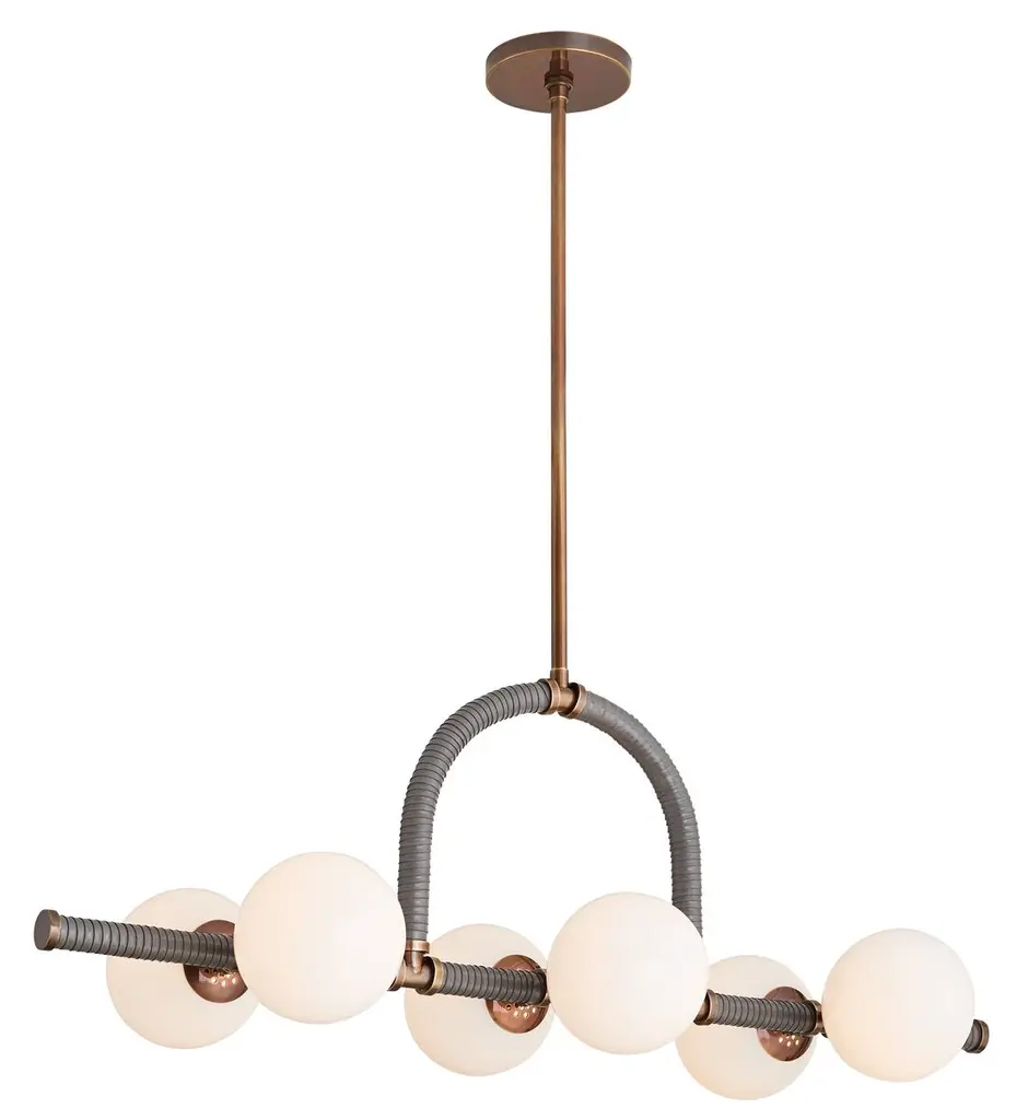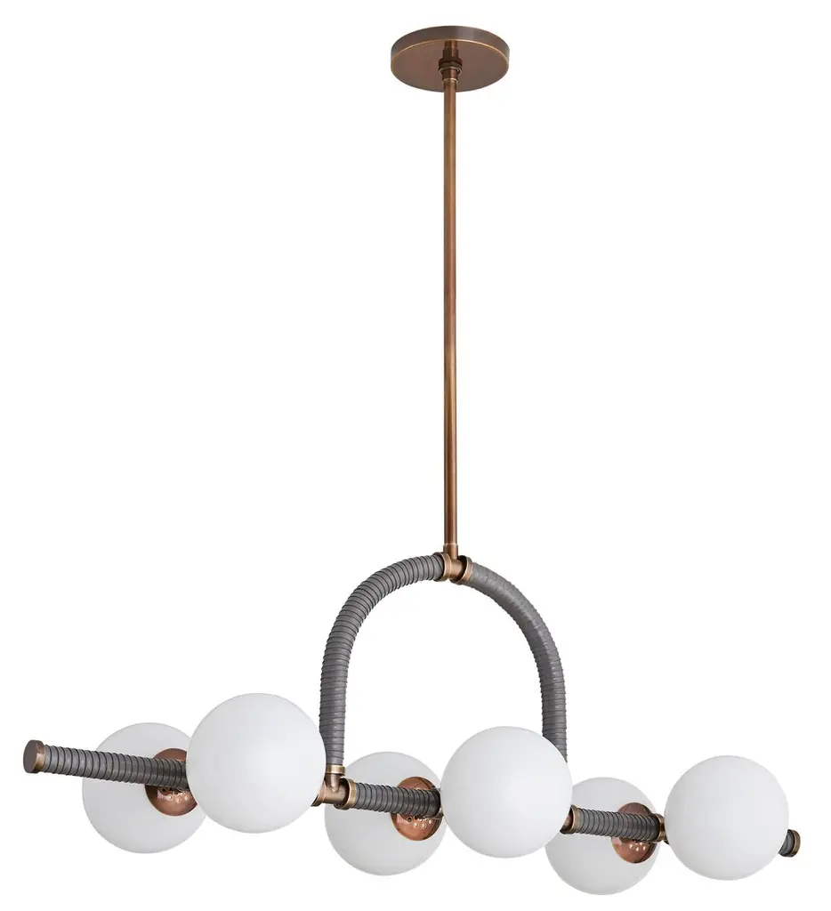 Dark gray leather wrapped around the steel frame adds luxe panache to this geometric chandelier, as does the rich brass finish of the hardware. The opalescent finish of the six glass domes ensures a soft, flattering glow. Hardwired.