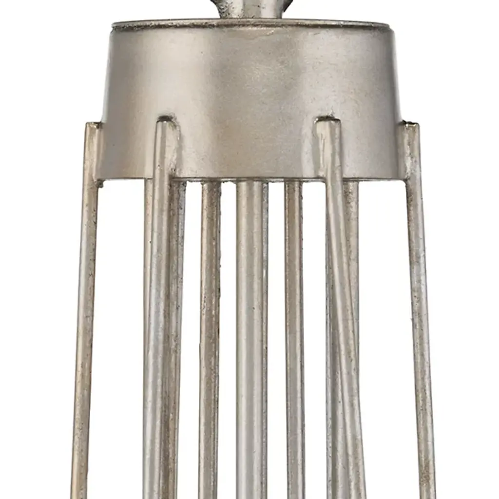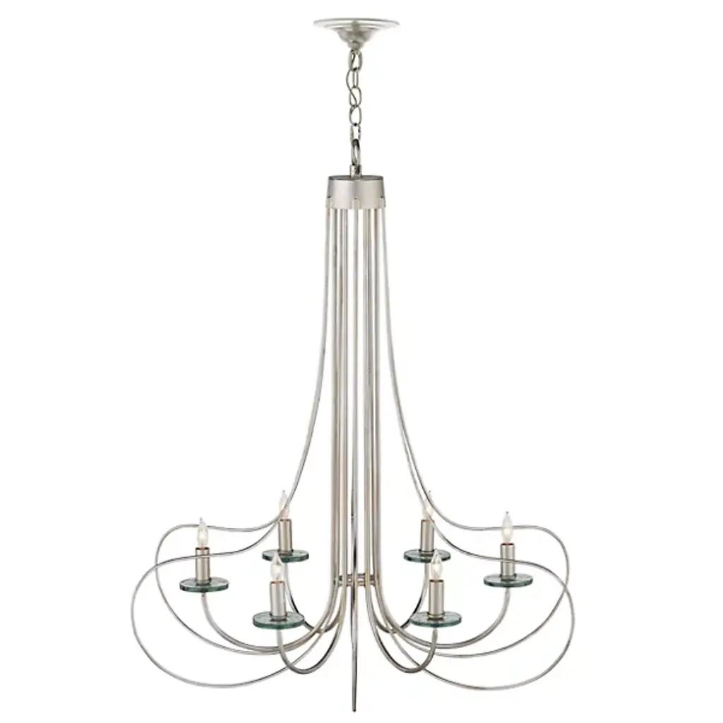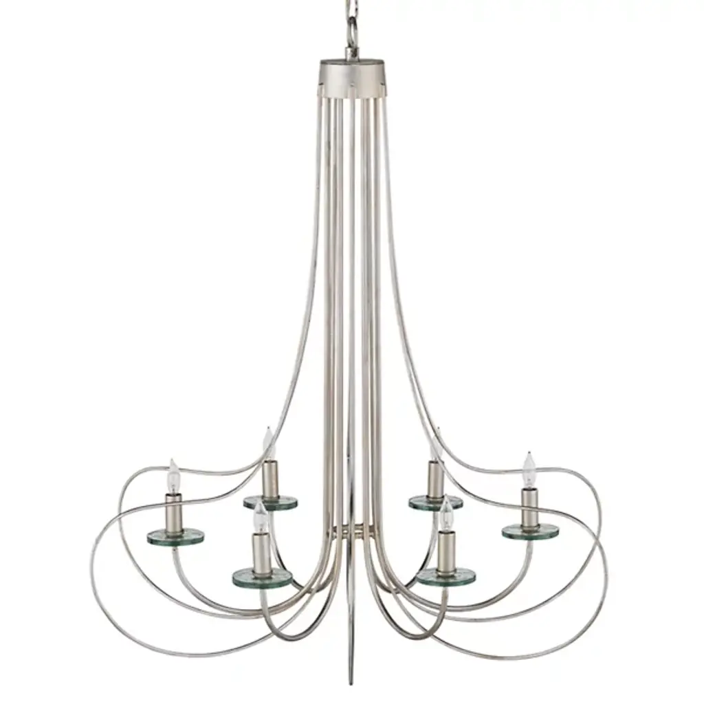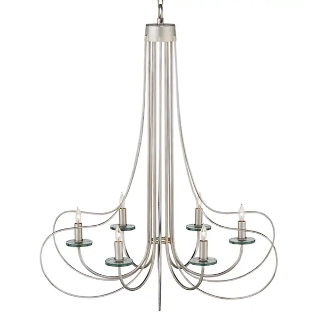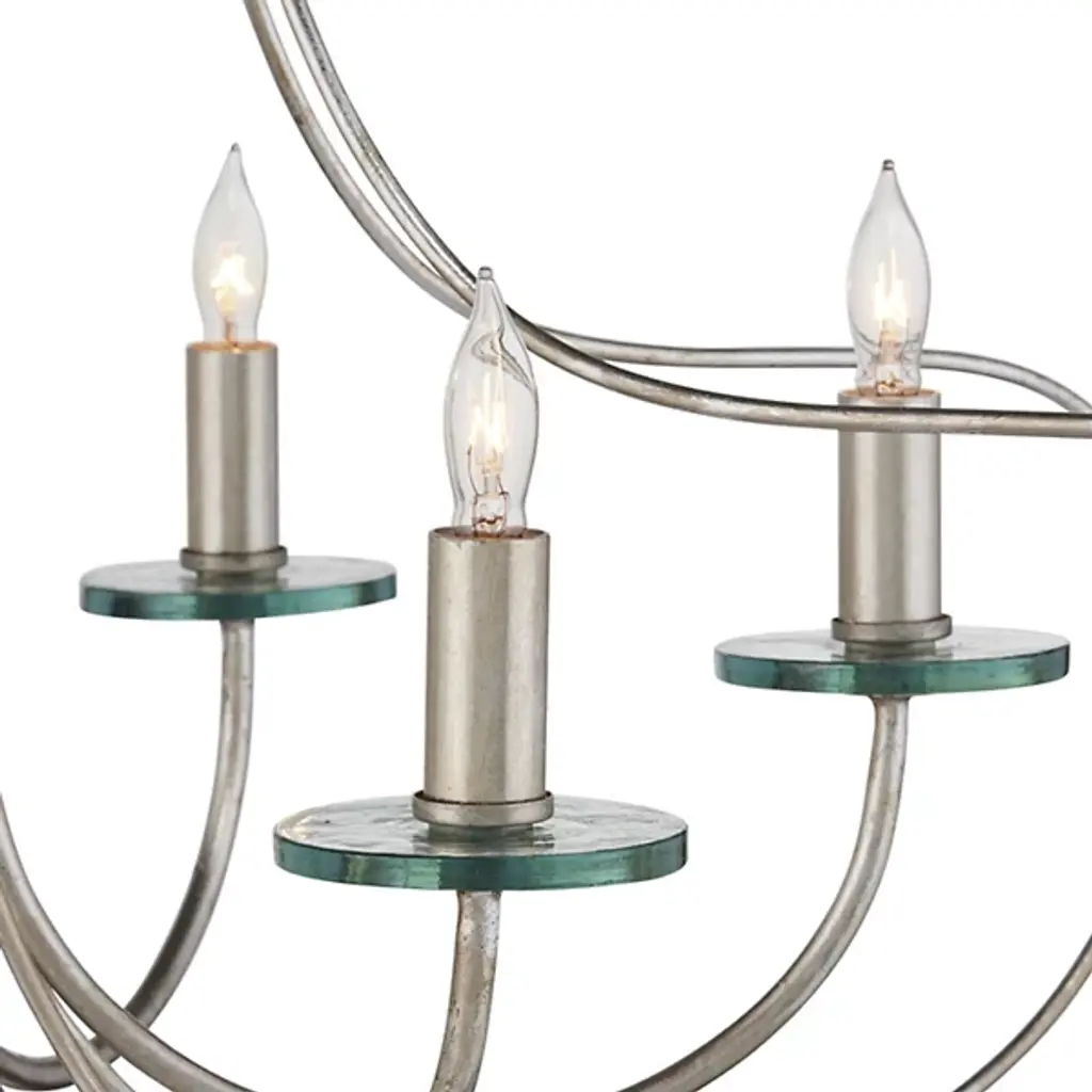 The Harrow Chandelier by Currey & Company exhibits a graceful interplay of slender, wrought iron ribs, forming sophisticated loops with a subtle Deco influence. With a blend of contemporary silver leaf and silver finishes and adorned with recycled glass disc bobeches, this chandelier boasts a modern aesthetic with distinctive flair. The watery-textured recycled glass discs, ascending from upward-curving arms to encircle each open candelabra lamp, catch and enhance the light, adding a vibrant accent to the fixture. This silver chandelier broadcasts a sense of grace and repetition in symmetry, bringing a touch of sophistication and timeless charm to its surroundings and embodying the essence of transitional style.