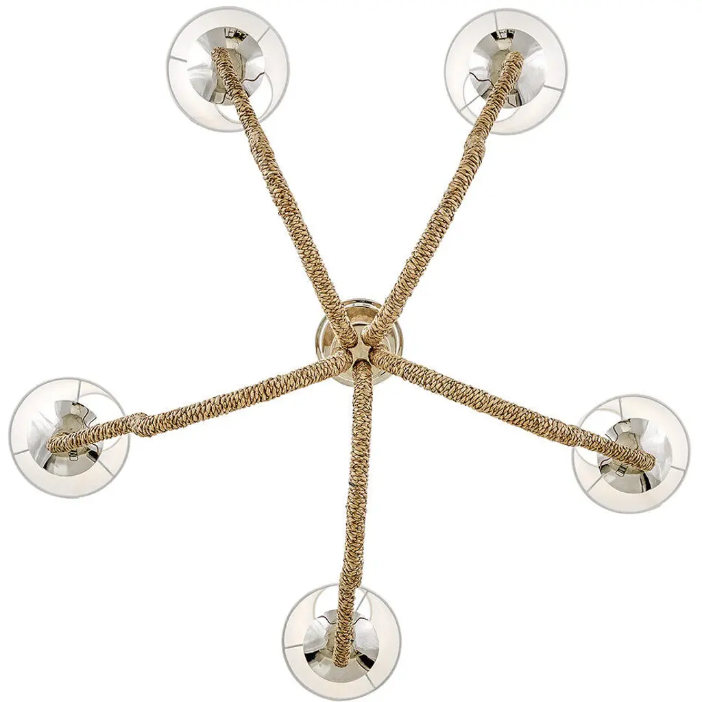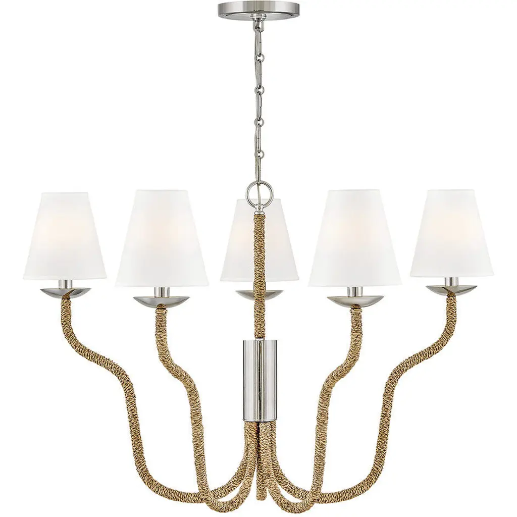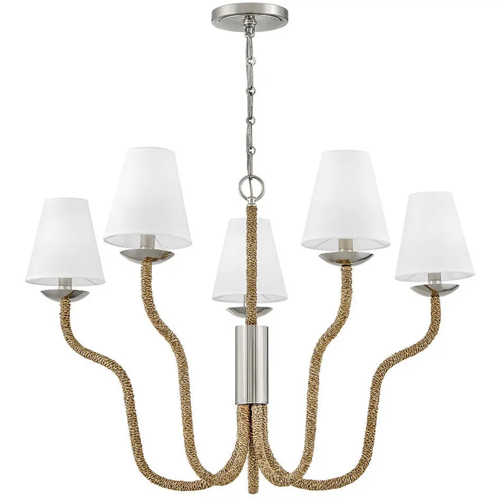 Add a touch of subtle coastal texture and transitional elegance to your décor. Harwich is crafted with slim, softly waved arms wrapped in natural fiber rope for added tactile richness. Contrasting bobeches, canopy, and decorative chain add contemporary accents with a Polished Nickel finish.