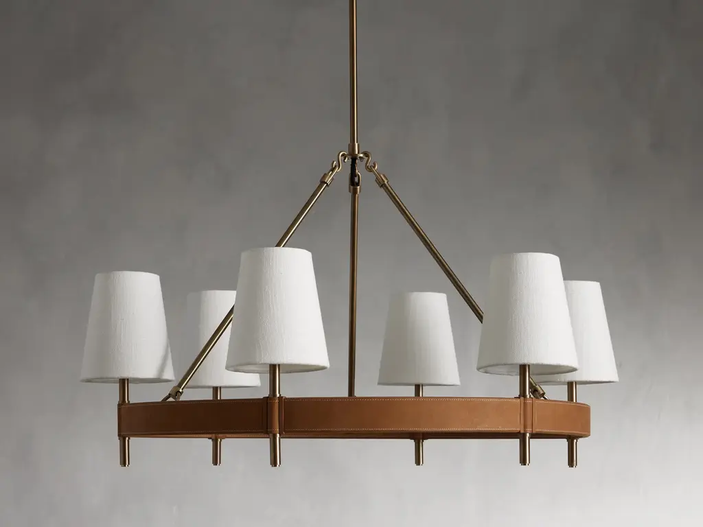 Iconic midcentury modern design and a juxtaposition of mixed materials inspire our Hastings Lighting Collection. Bases crafted from brass with an antiqued finish are complemented by tan leather stitched details and white linen shades to bring thoughtful elegance to any space.
