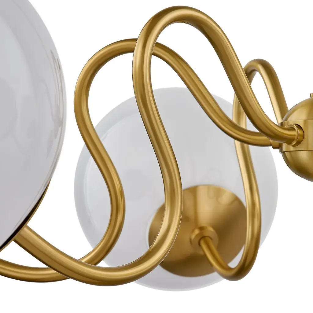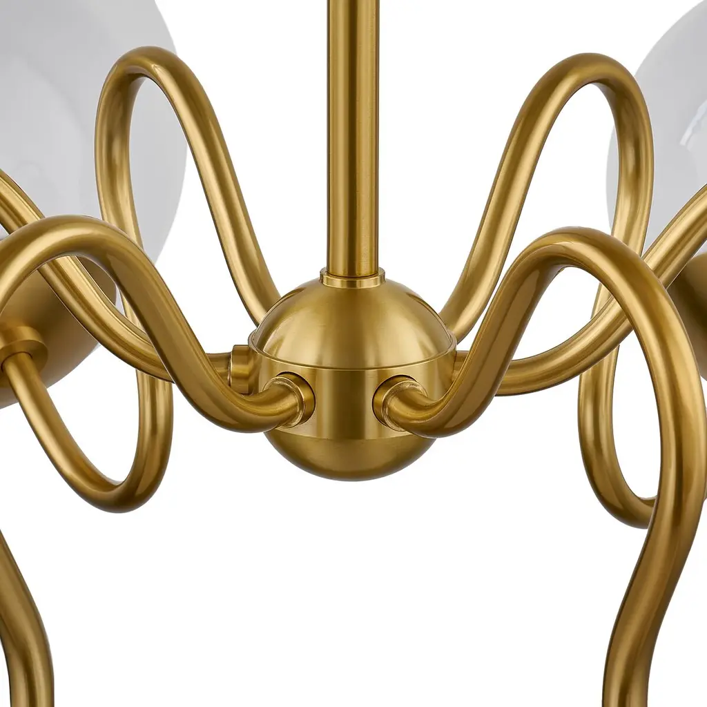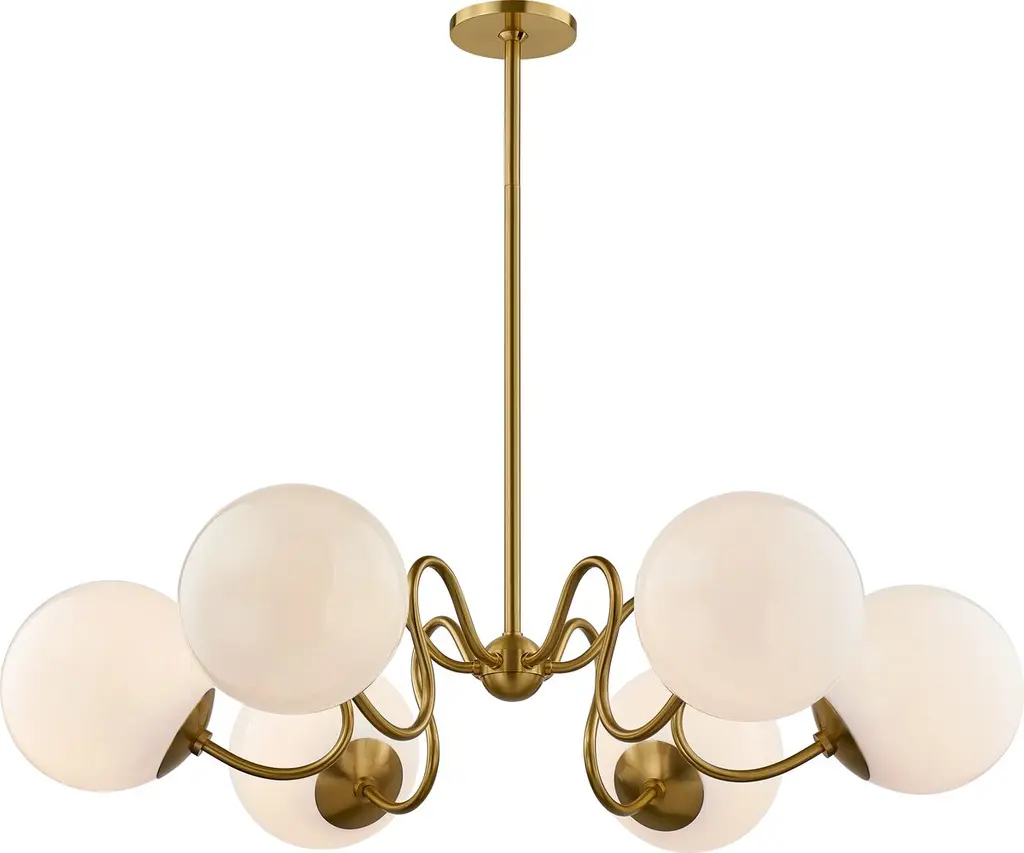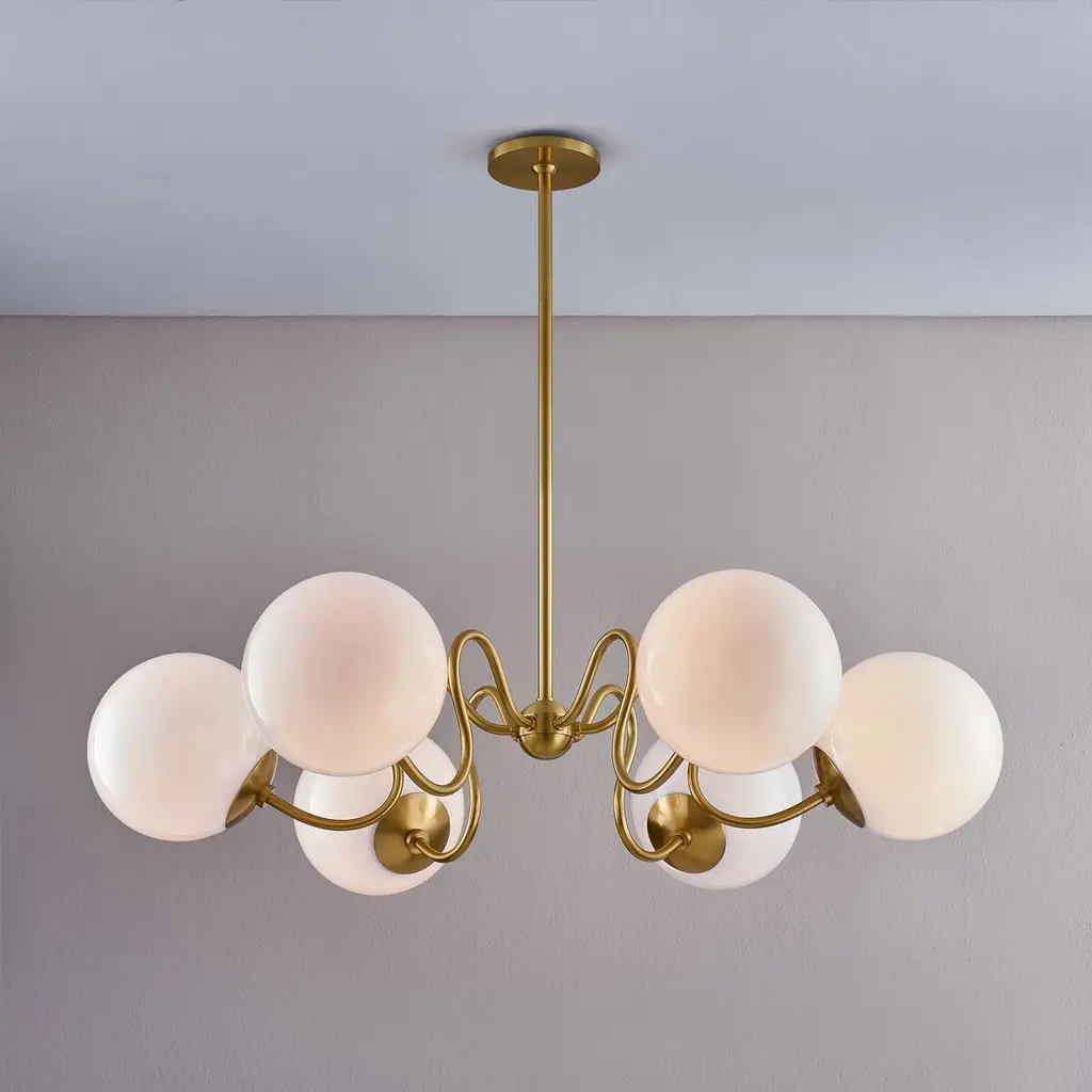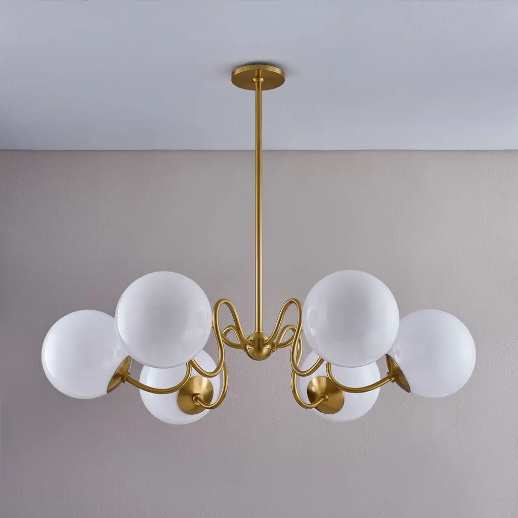 The opal glass globe shades give this six-arm chandelier the panache of Belle poque Paris; the wavy brass arms add contemporary flair.