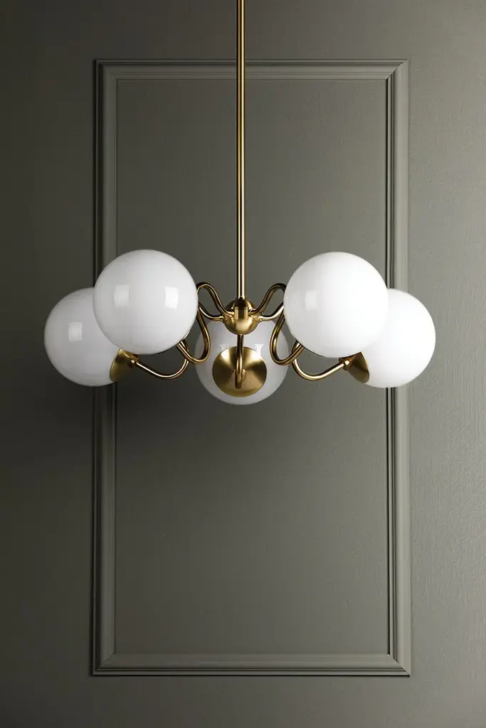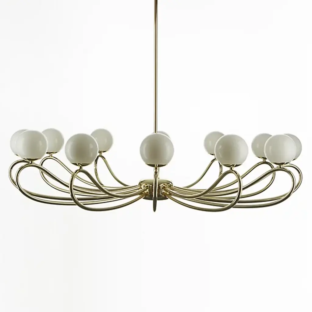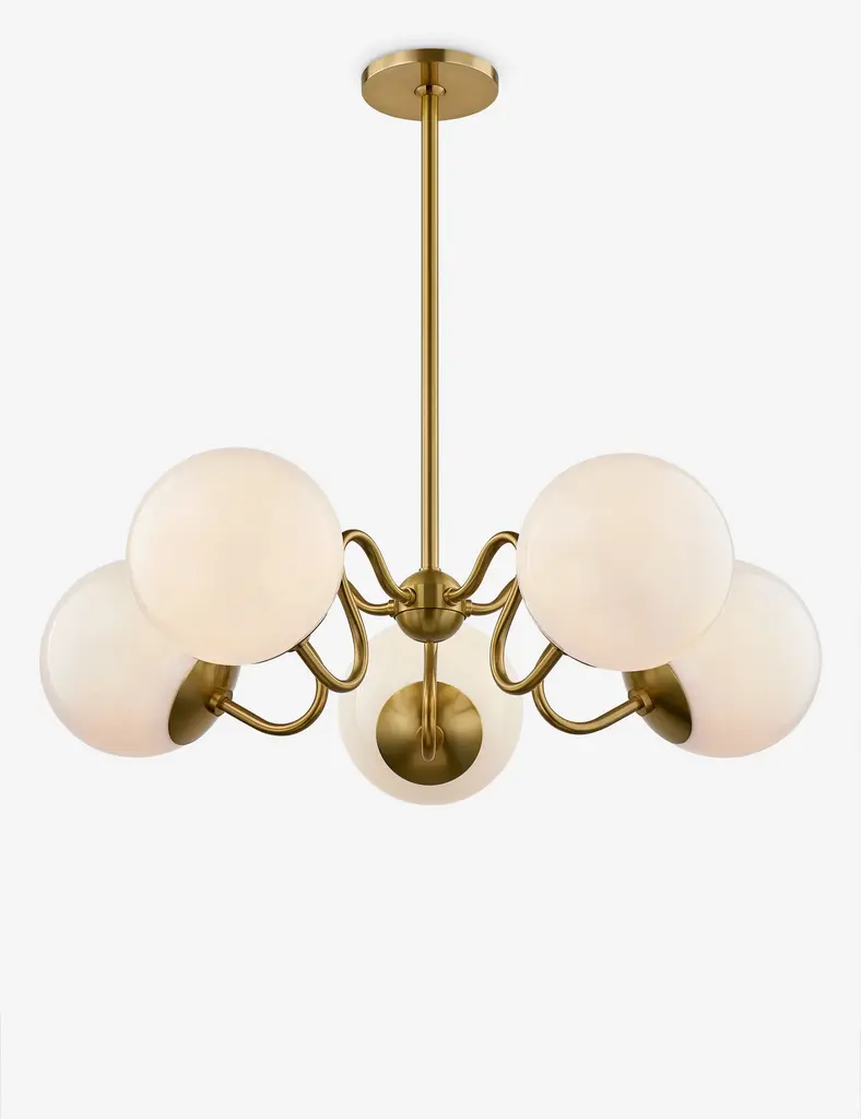 Art nouveau meets midcentury Italian, the Havana wall sconce and chandelier indulge in of-the-moment, whimsical design. Available in aged brass, old bronze, and polished nickel, Havana is engaged in shape play and features a wavy arm and glossy opal globe shade. Available in small and large chandelier.