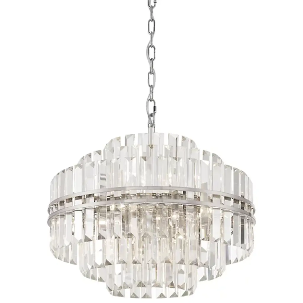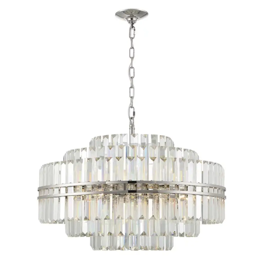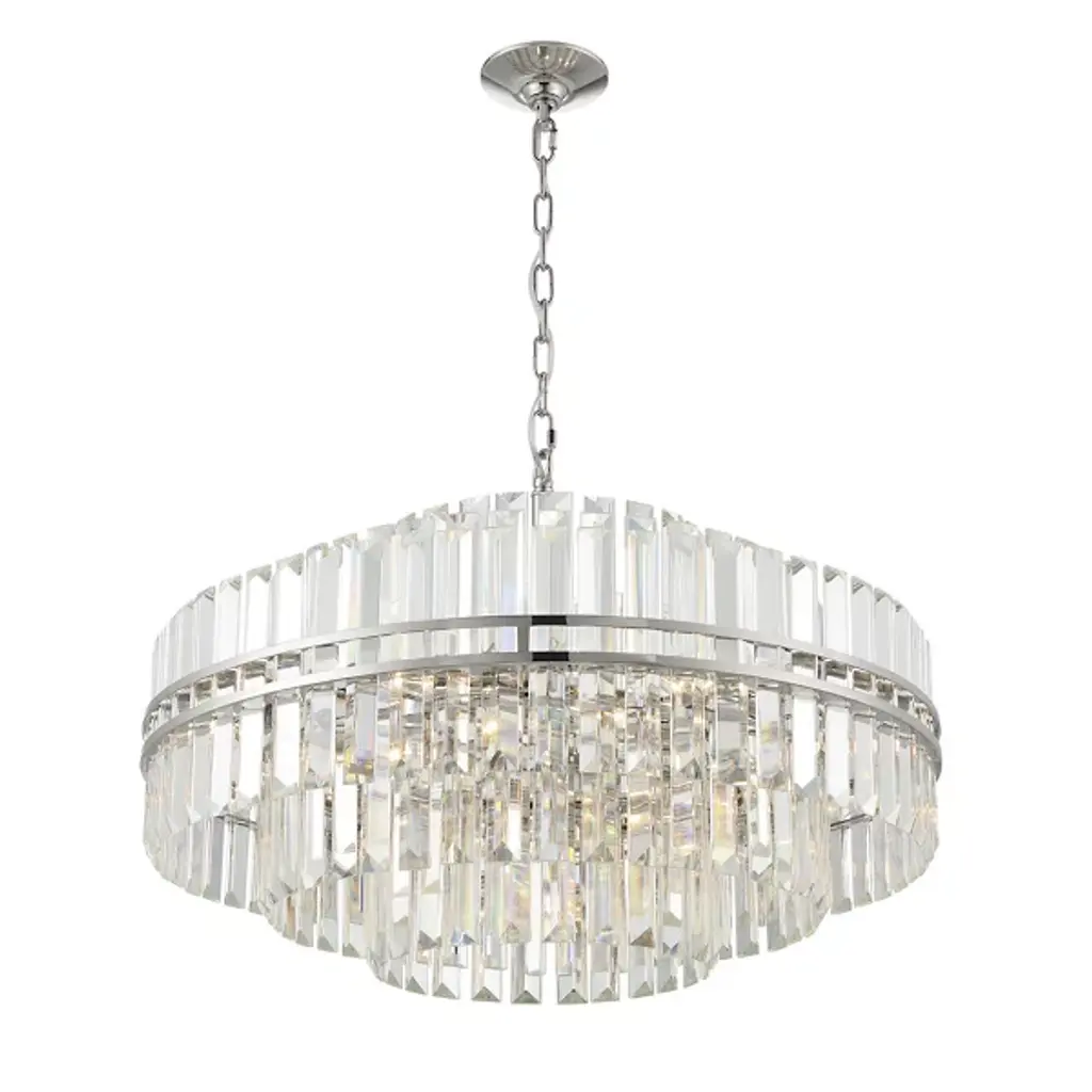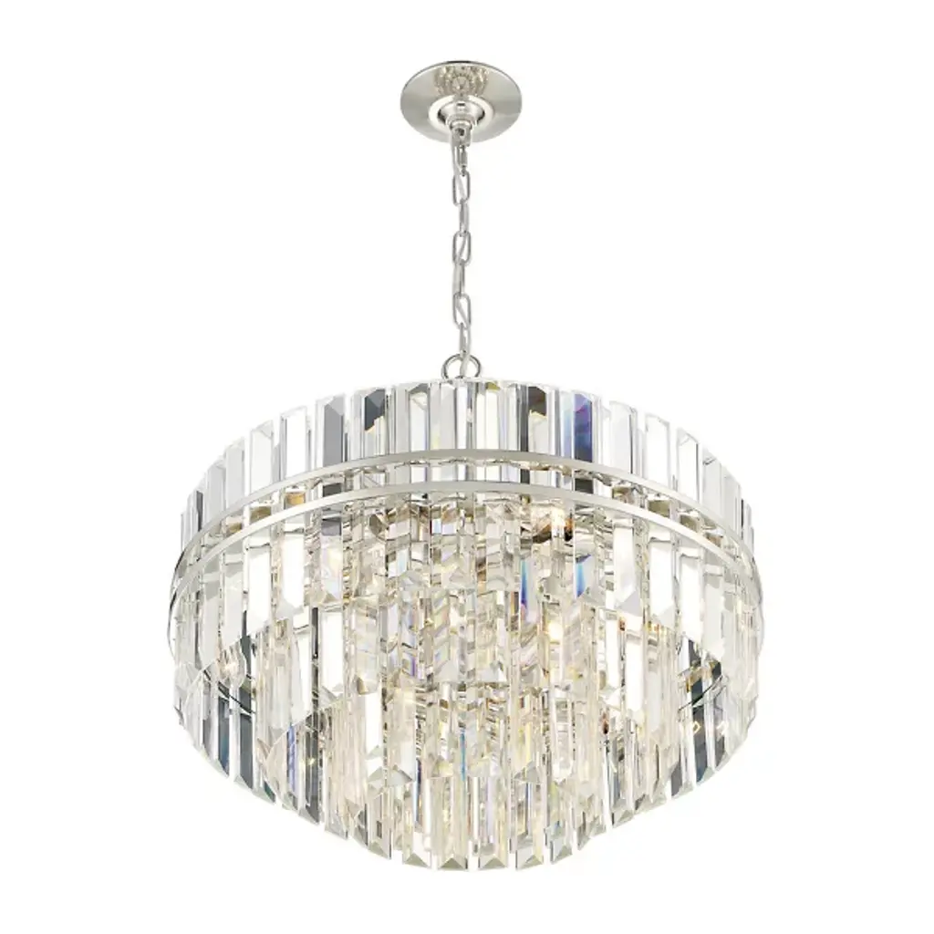 Create a lasting impression with the Hayes Chandelier by Crystorama. Doubling as a piece of art, the Hayes is comprised of tiered multi-faceted crystal secured by a polished nickel steel frame. A smooth polished finish modernizes its surroundings while creating a focal point among locales of choice. Display the Hayes as a solo piece or up the ante with multiples.