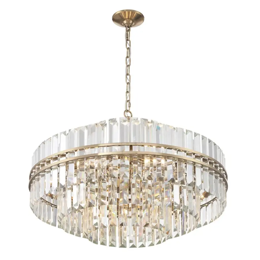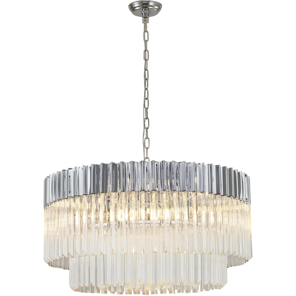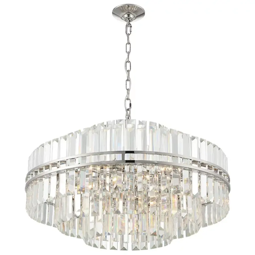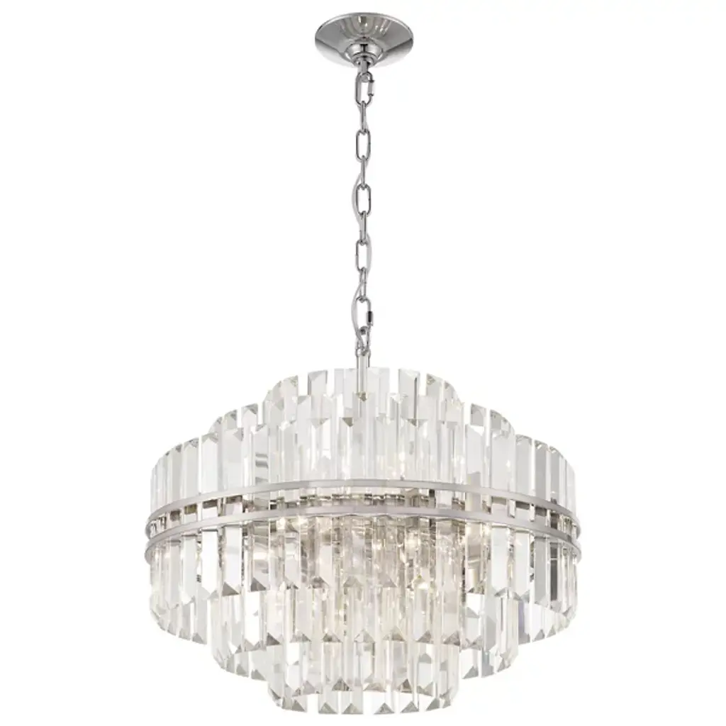 Create a lasting impression with the Hayes Chandelier by Crystorama. Doubling as a piece of art, the Hayes is comprised of tiered multi-faceted crystal secured by a polished nickel steel frame. A smooth polished finish modernizes its surroundings while creating a focal point among locales of choice. Display the Hayes as a solo piece or up the ante with multiples.