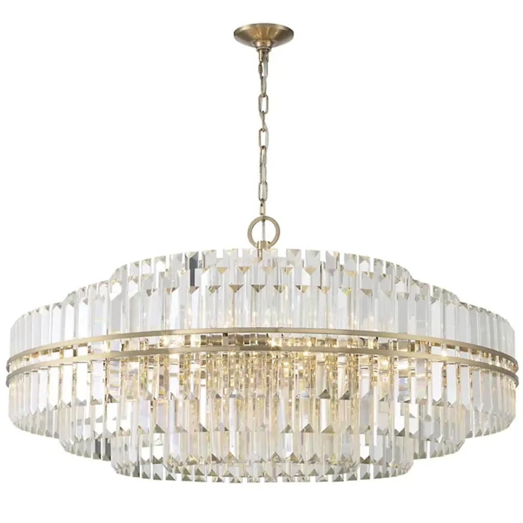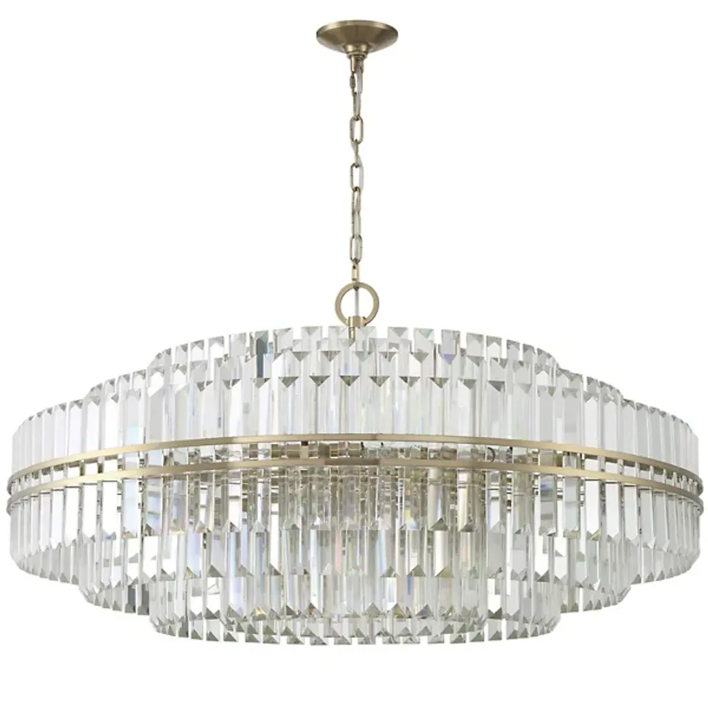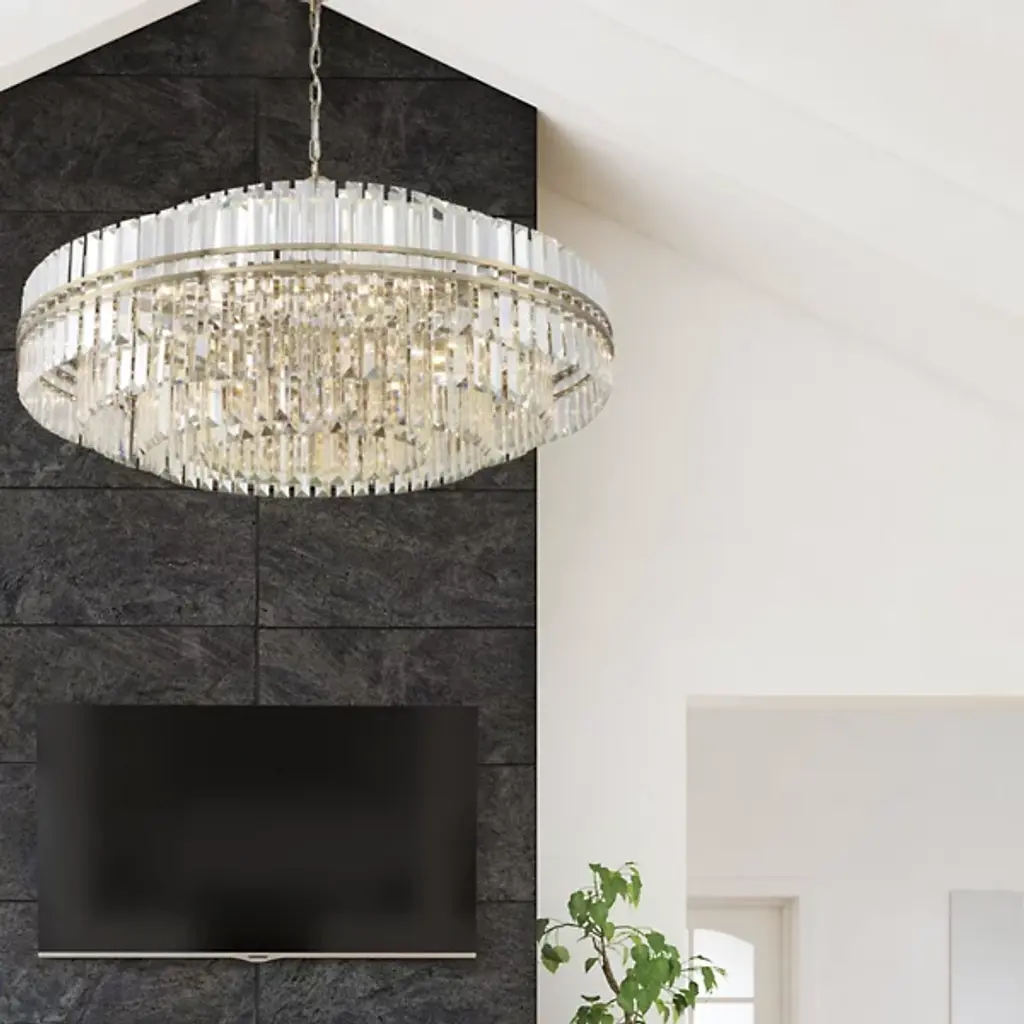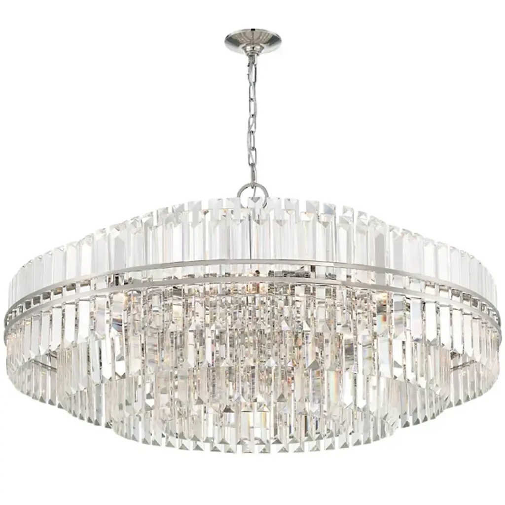 The Hayes Large Chandelier from Crystorama is designed to leave a lasting impression. Crafted with meticulous attention to detail, this fixture showcases tiered multi-faceted crystals elegantly held in place by a robust Polished Nickel steel frame. The sleek and polished finish adds a modern touch, infusing your surroundings with contemporary sophistication. Not just a lighting fixture, this product doubles as a captivating piece of art, commanding attention and creating a stunning focal point for any room.