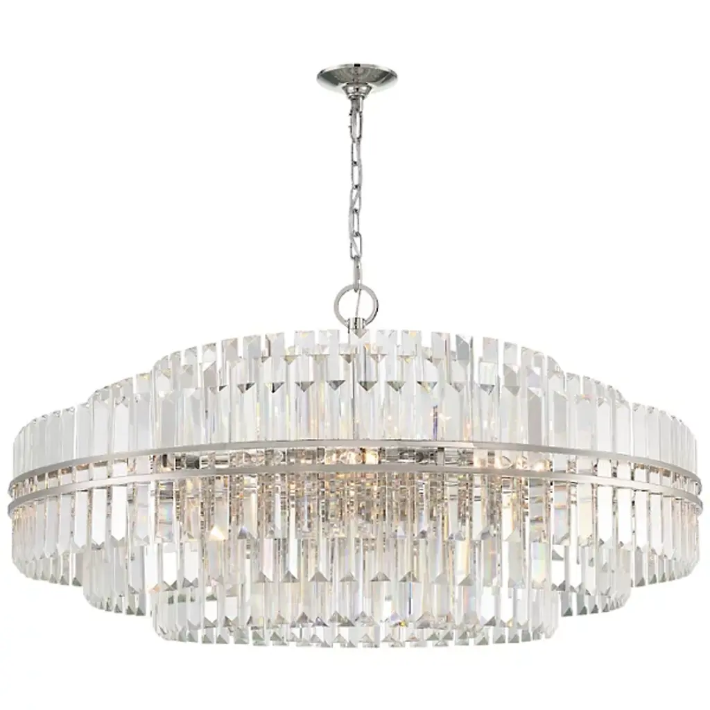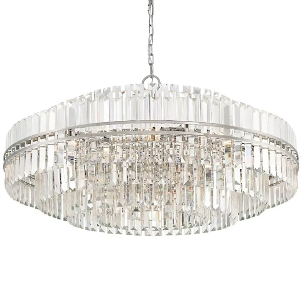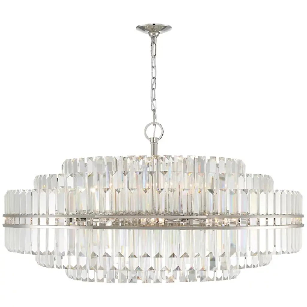 The Hayes Large Chandelier from Crystorama is designed to leave a lasting impression. Crafted with meticulous attention to detail, this fixture showcases tiered multi-faceted crystals elegantly held in place by a robust Polished Nickel steel frame. The sleek and polished finish adds a modern touch, infusing your surroundings with contemporary sophistication. Not just a lighting fixture, this product doubles as a captivating piece of art, commanding attention and creating a stunning focal point for any room.