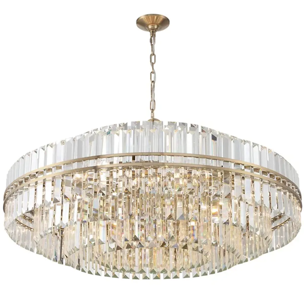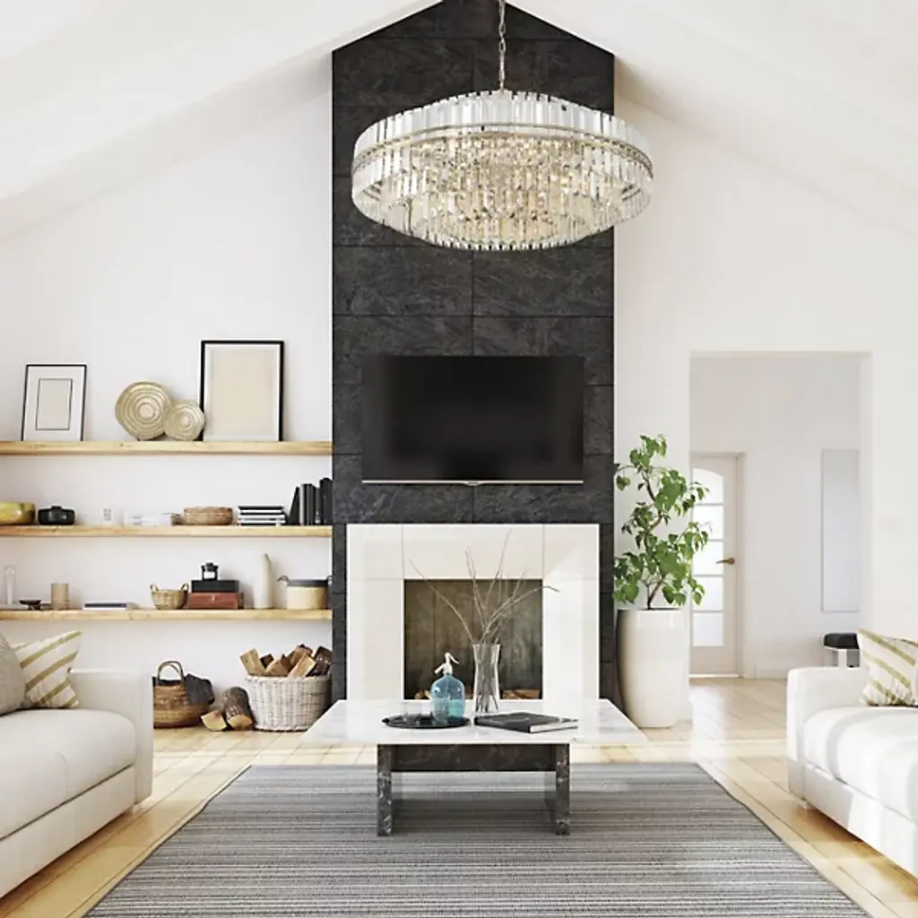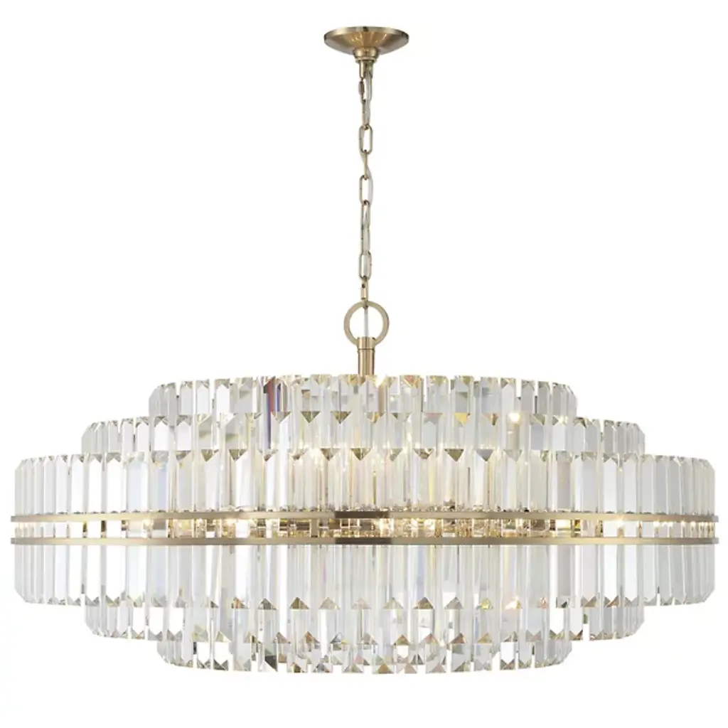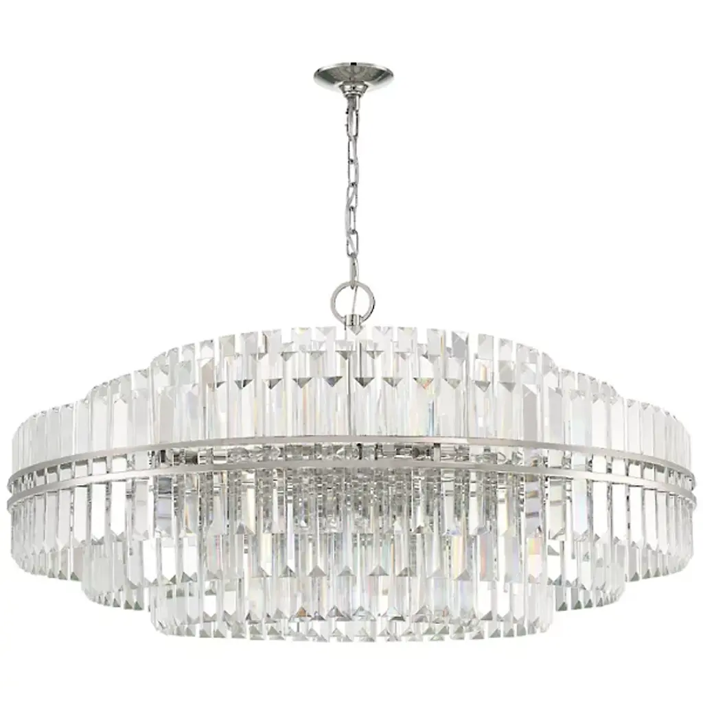 The Hayes Large Chandelier from Crystorama is designed to leave a lasting impression. Crafted with meticulous attention to detail, this fixture showcases tiered multi-faceted crystals elegantly held in place by a robust Polished Nickel steel frame. The sleek and polished finish adds a modern touch, infusing your surroundings with contemporary sophistication. Not just a lighting fixture, this product doubles as a captivating piece of art, commanding attention and creating a stunning focal point for any room.