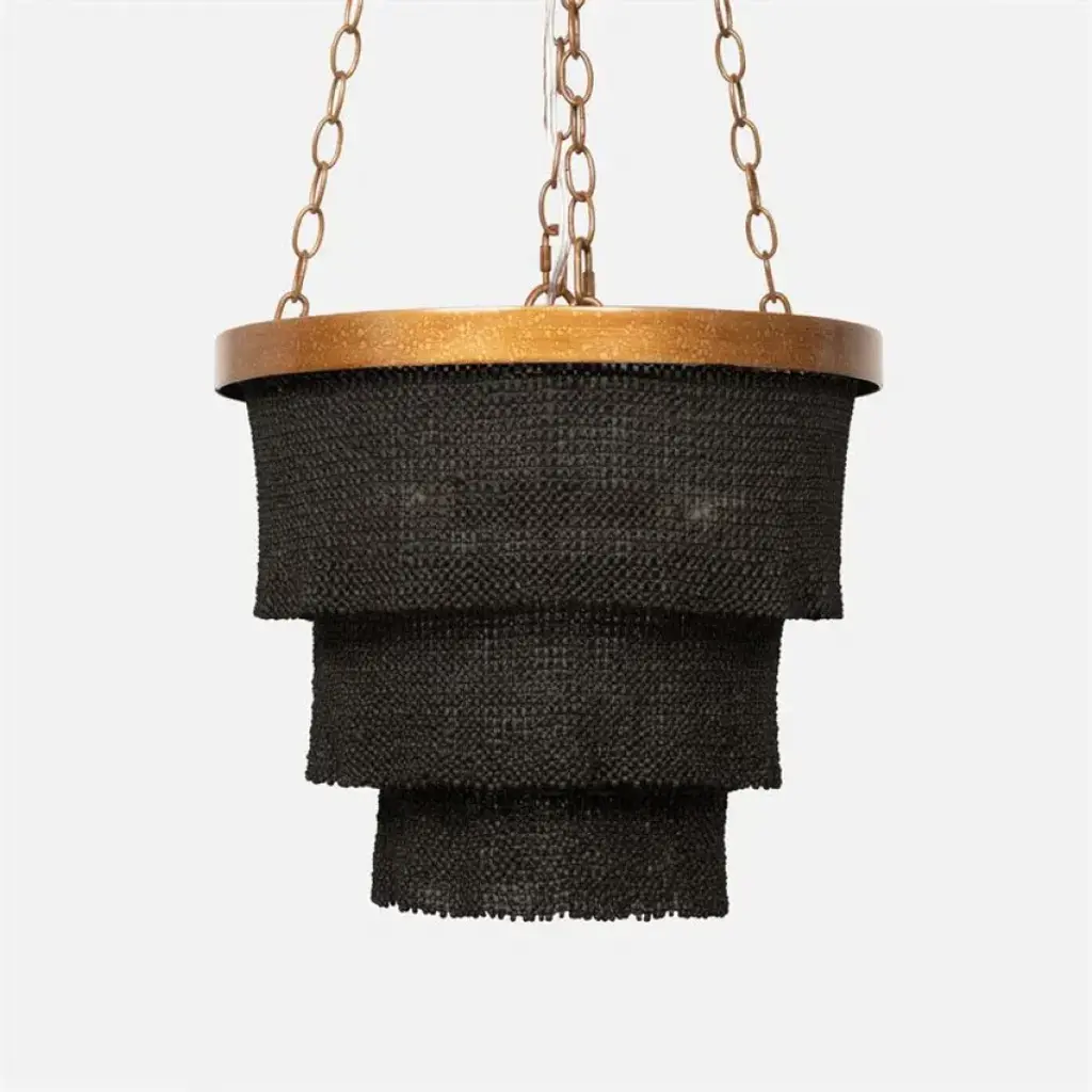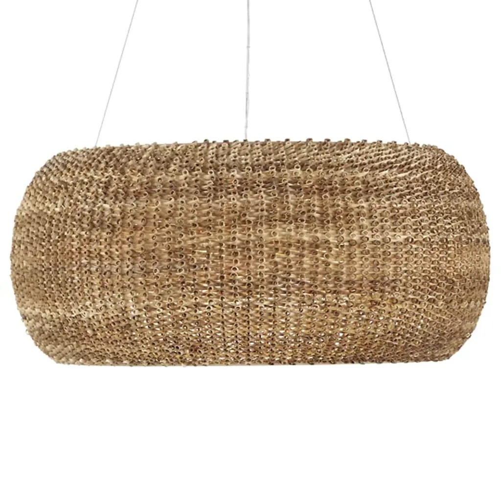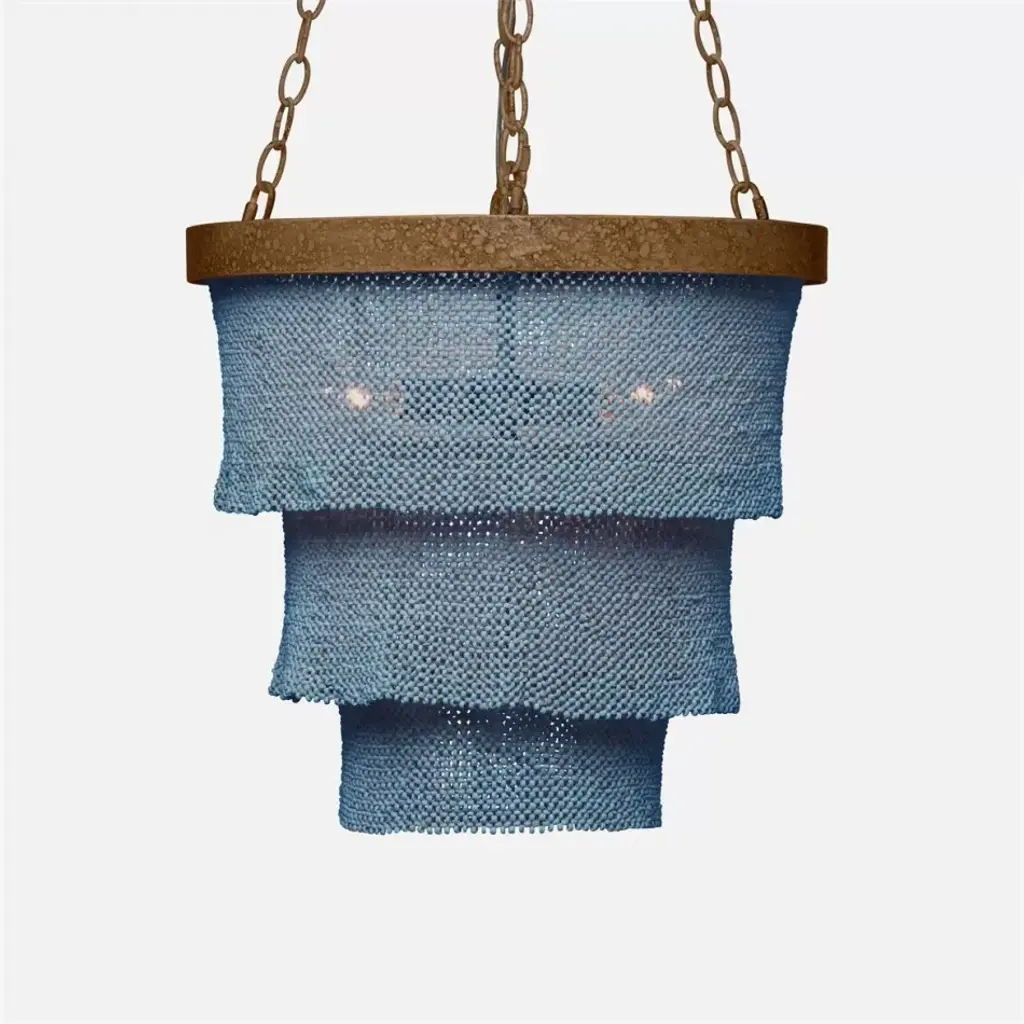 The Hayworth Chandelier by Hudson Valley Lighting reinterprets coastal aesthetics with an artisanal touch. Contrasting smooth metal and chains with a shade woven from Abaca rope, its two expansive shades, reminiscent of clamshells, impart an air of lightness. The fine chain contrasts well with the organic rope, enhancing the design's sophistication. The chandelier's bottom opening directs a concentrated beam, illuminating vast spaces with a coastal charm, combining diverse designs to create a distinctive and versatile lighting solution.