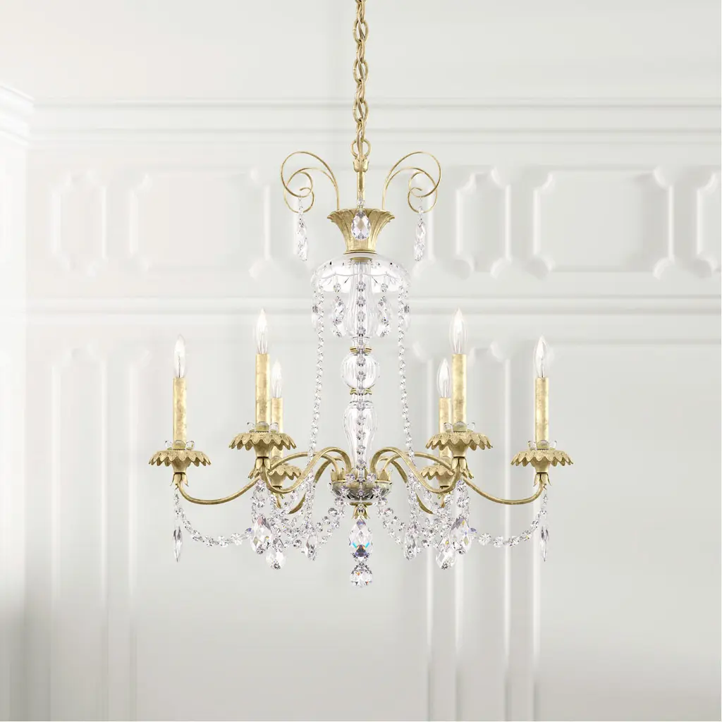 Exquisite yet unpretentious the Helenia chandelier is a classic beauty designed with a unique balance of crystal and artfully cast metals. Slender elegantly curved arms crafted from low carbon steel convey strength and grace in equal measure while delicate crystals reflect light as only a chandelier can. The tube holding the light sits atop a detailed Italian cast brass bobeches in the shape of open flowers and the central column is fashioned from Bohemian hand cut crystal. With its thoughtfully crafted traditional elements Helenia is a sophisticated focal point for formal entry foyers dining rooms and living rooms.