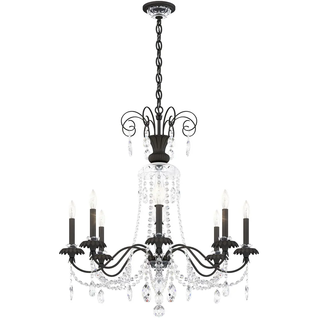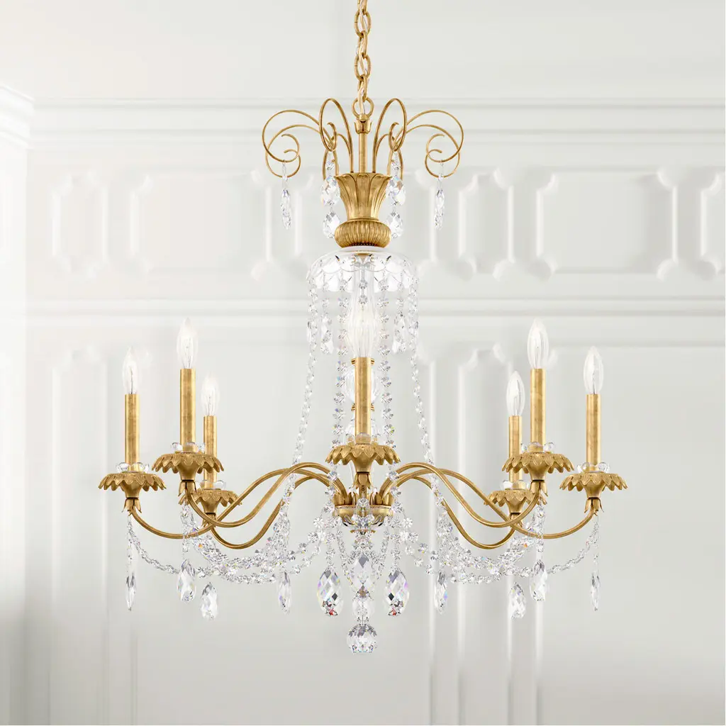 Exquisite yet unpretentious the Helenia chandelier is a classic beauty designed with a unique balance of crystal and artfully cast metals. Slender elegantly curved arms crafted from low carbon steel convey strength and grace in equal measure while delicate crystals reflect light as only a chandelier can. The tube holding the light sits atop a detailed Italian cast brass bobeches in the shape of open flowers and the central column is fashioned from Bohemian hand cut crystal. With its thoughtfully crafted traditional elements Helenia is a sophisticated focal point for formal entry foyers dining rooms and living rooms.