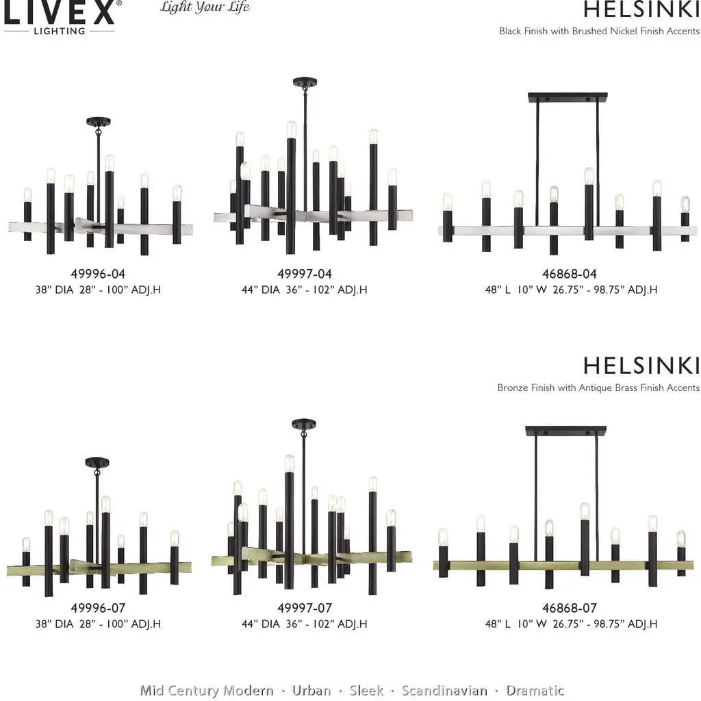 Adding to the eclectic and nostalgic feel, this funky linear chandelier is a traditional complement to many styles. An open linear form celebrates geometric interplay with clean, straight lines. Finished in black with brushed nickel accents, the Helsinki