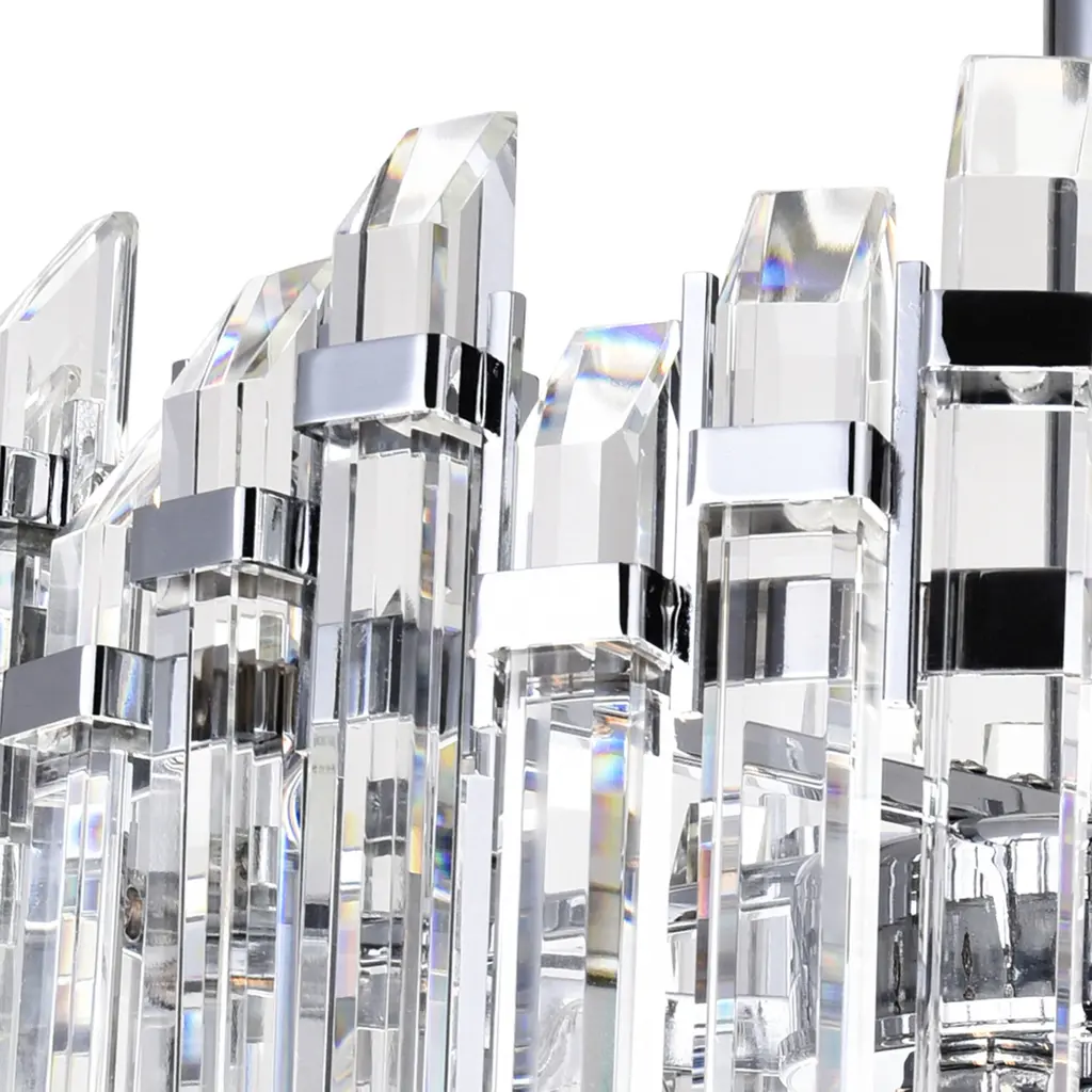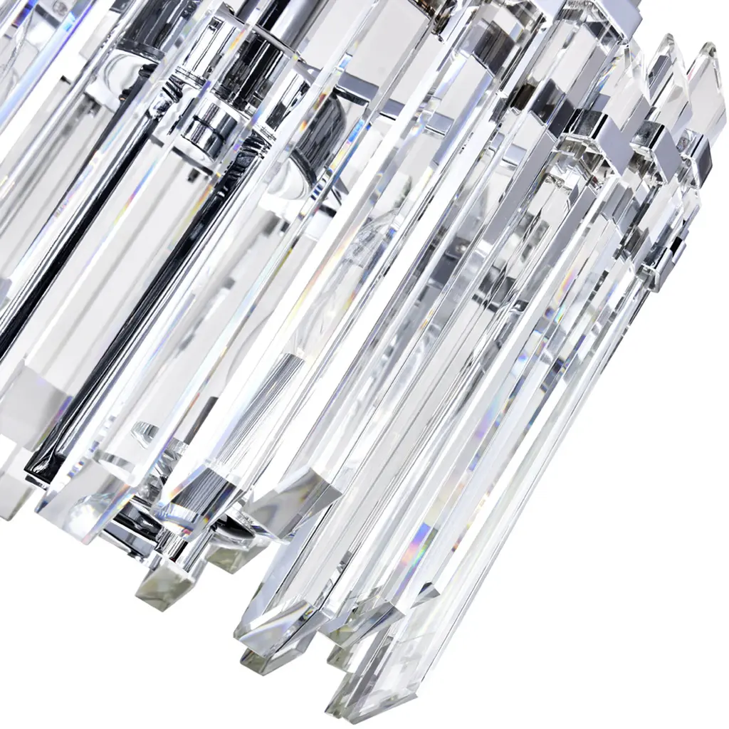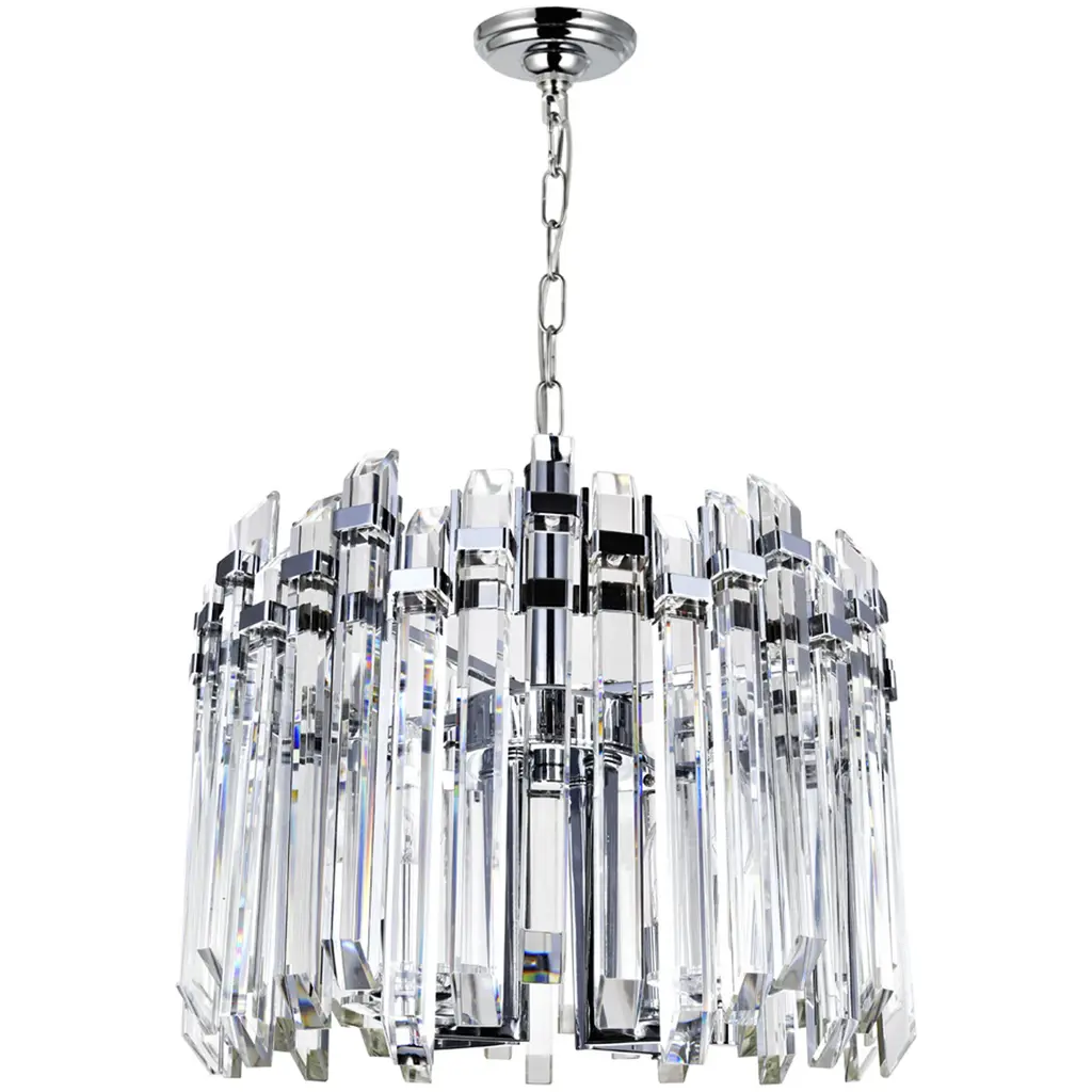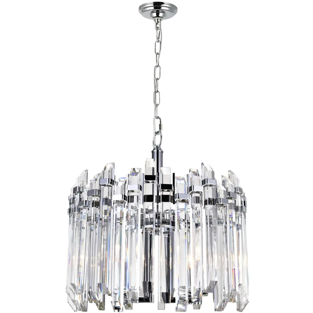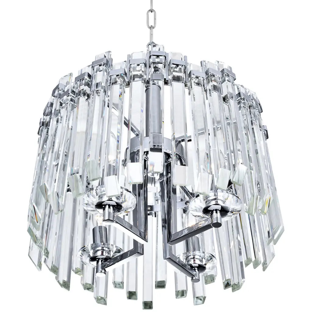 If you're looking to add a dazzling appeal to your space, the Henrietta 4 Light Chandelier may be the answer. This chrome chandelier displays a glamorous look with its clear crystal bar pieces that form a drum-like shade. The sparkling drum-like pendant is held by a chrome-finished chain suspending from a round canopy. This medium-sized light fixture measures 16 inches in diameter and requires four candelabra-based bulbs.