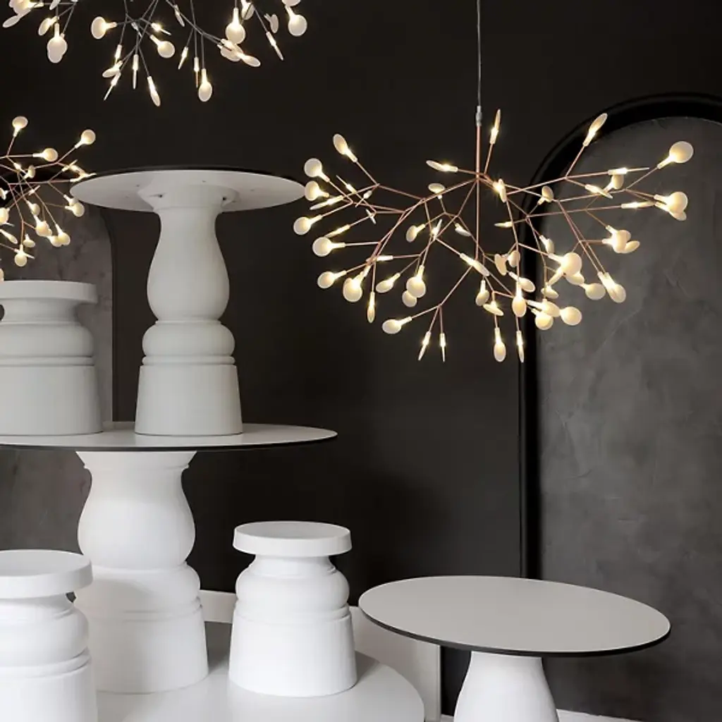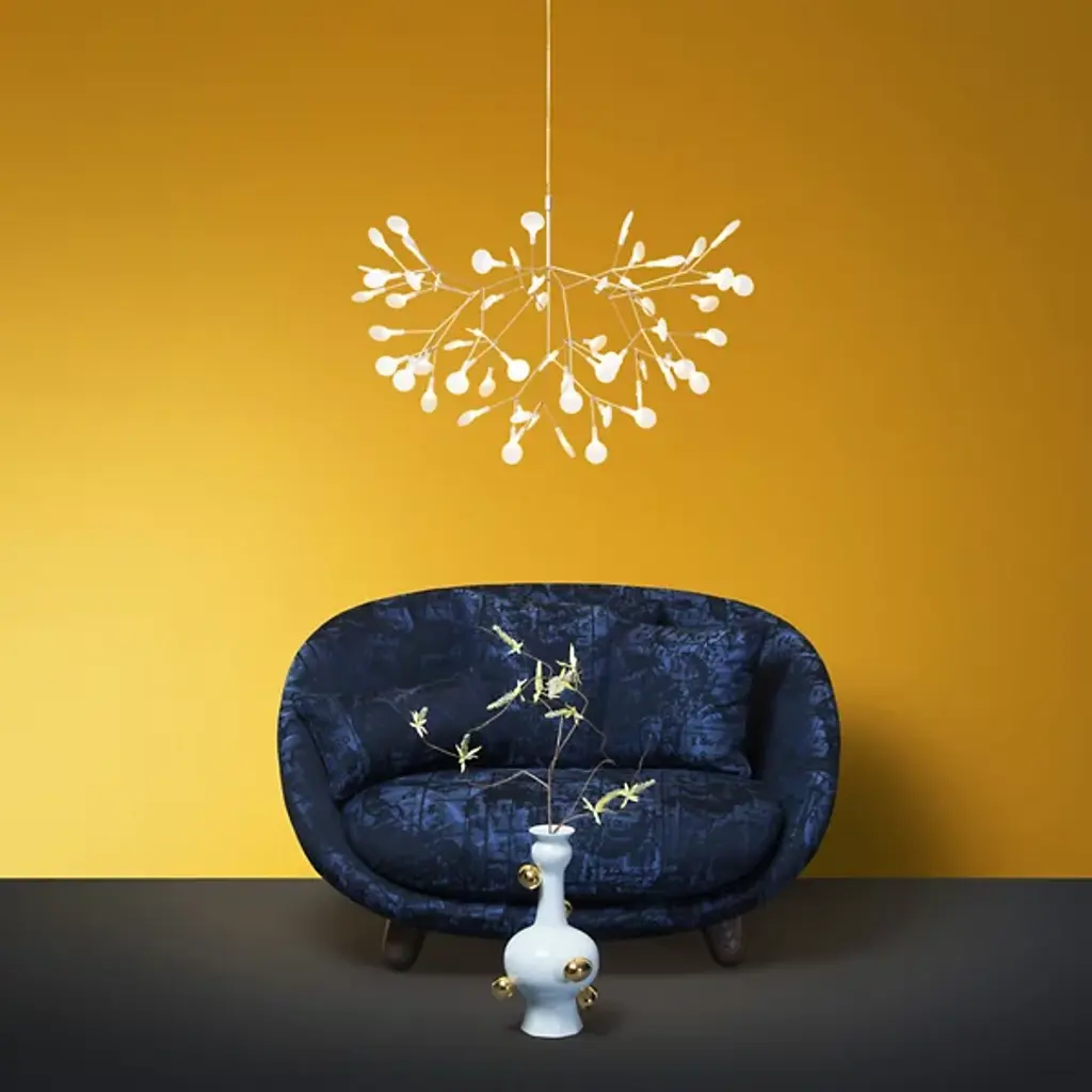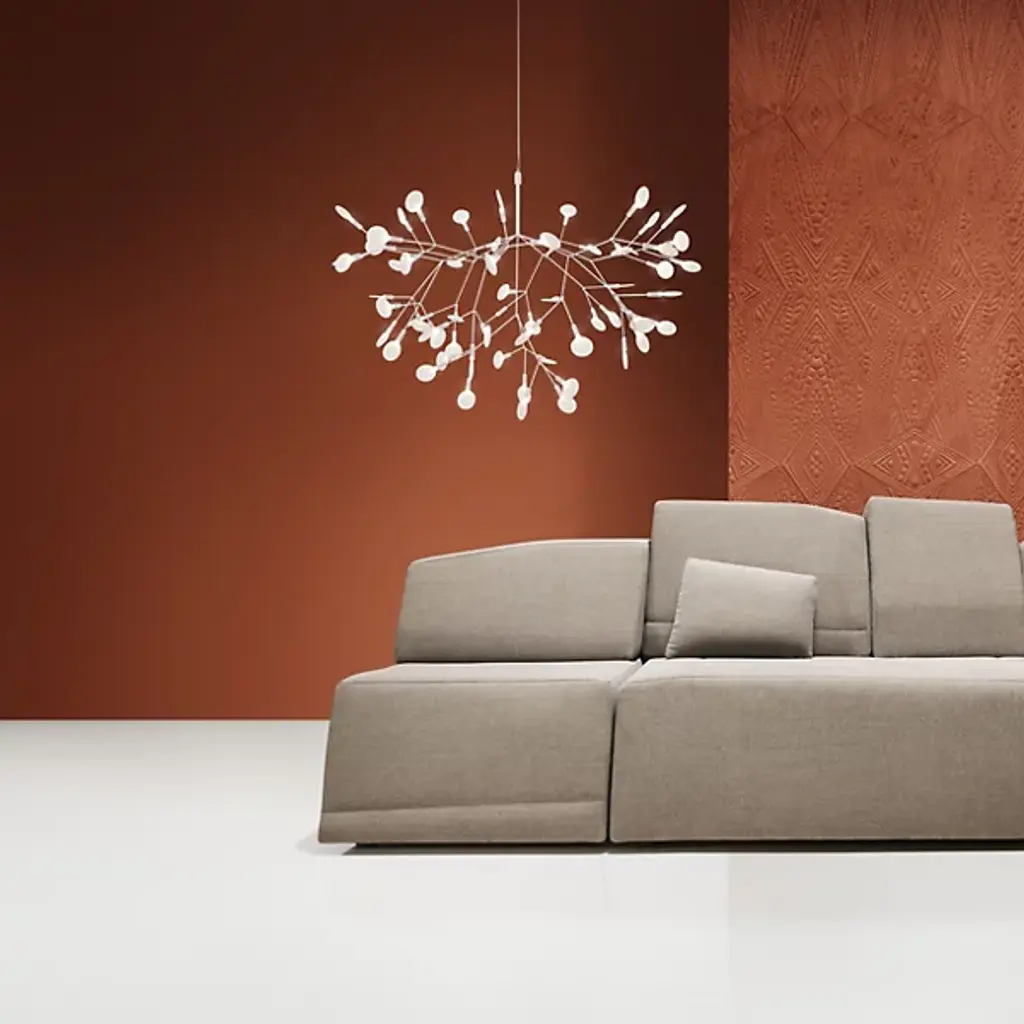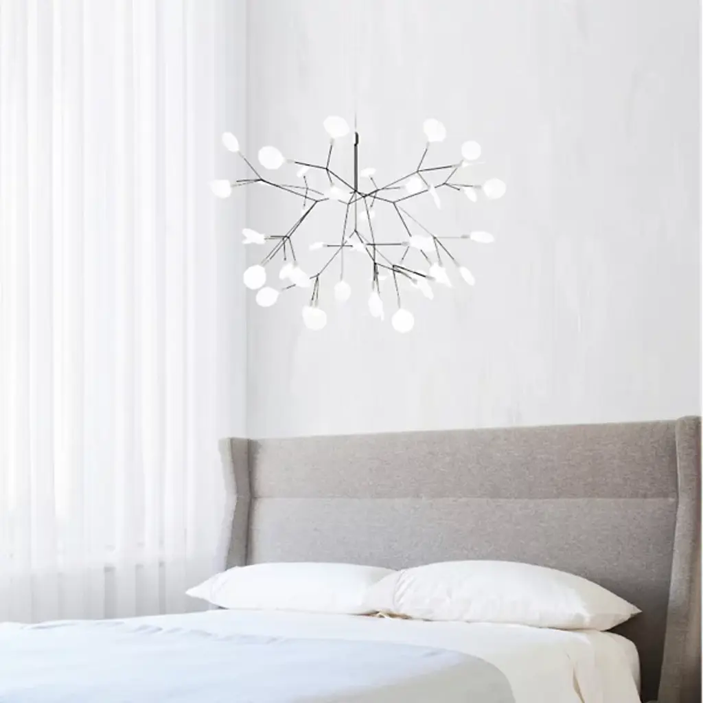 Designed by Bertjan Pot in 2013 for Moooi, the Heracleum III LED Chandelier is a decorative LED fixture with 45 rotatable polycarbonate lenses inspired by the Heracleum Plant. The white lenses ramify from one branch creating a technical, natural structure. By using the technique of conductive layers, the fixture remains delicate and thin. The Heracleum III LED Chandelier's leaves are not frozen in one position, they can be freely re-positioned by rotating them around their stem.